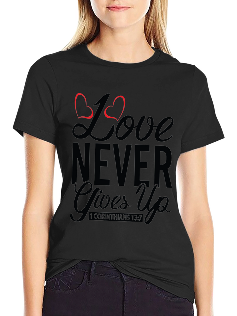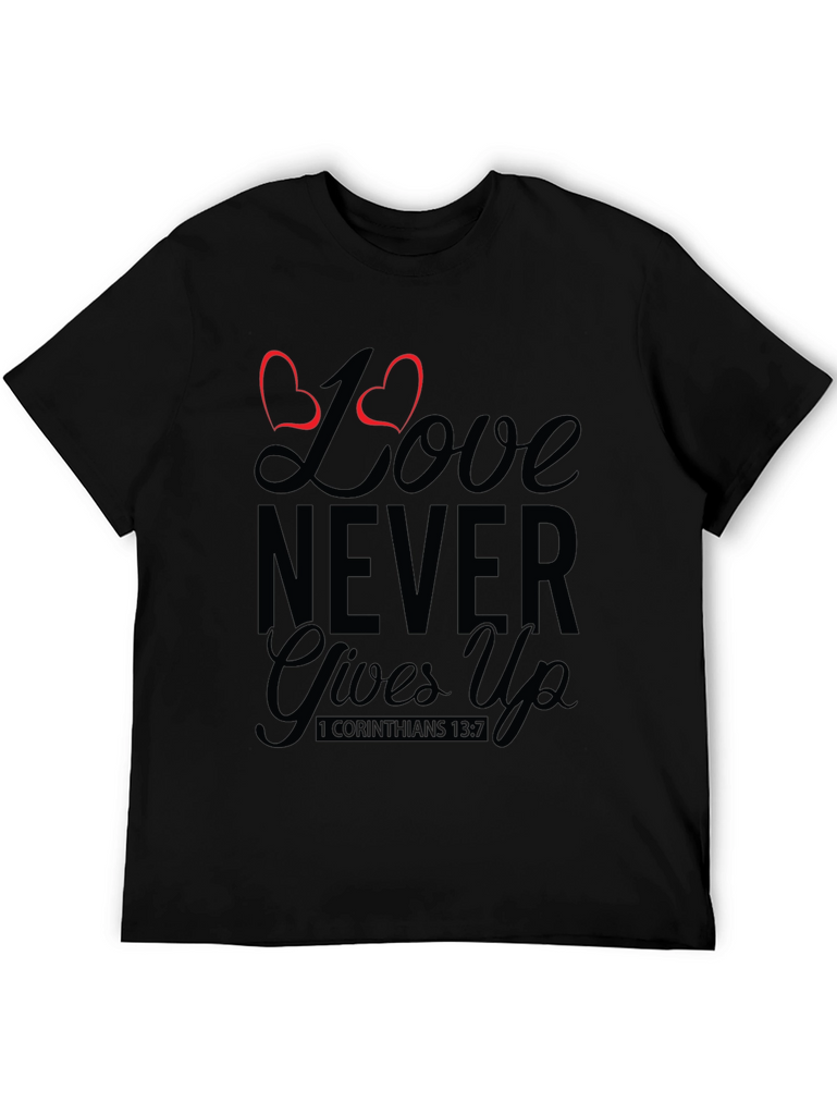 Show your faith and style with this black t-shirt featuring the inspiring message "Love Never Gives Up" with two heart symbols. The message is prominently displayed on the front, making it a statement piece that combines fashion with a positive message. Crafted from soft, breathable fabric, this tee offers all-day comfort. Ideal for casual wear, church events, or as a thoughtful gift, this t-shirt is a versatile addition to any wardrobe. Express your beliefs with confidence and grace!