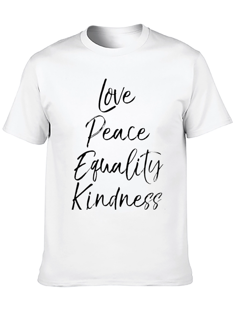 Show your values with this stylish black t-shirt. Featuring a clean, modern design, it displays the words "Love," "Peace," "Equality," and "Kindness" in a flowing script font. Made from comfortable fabric, this short-sleeved tee is perfect for everyday wear. Whether you're heading to a rally, running errands, or just relaxing at home, this shirt lets you express your beliefs with ease. Pair it with jeans, shorts, or a skirt for a versatile, socially conscious look.