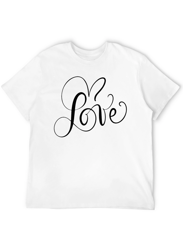 Express your feelings with this stylish black t-shirt. This shirt features a graceful, cursive design of the word 'Love' across the chest, making it a simple yet meaningful statement piece. Crafted from what appears to be a soft, breathable cotton blend, this tee promises all-day comfort and a relaxed fit. Its dark color makes it versatile for casual outings, cozy nights in, or as a thoughtful gift for someone special. Show your love and wear it on your sleeve, or rather, across your chest!