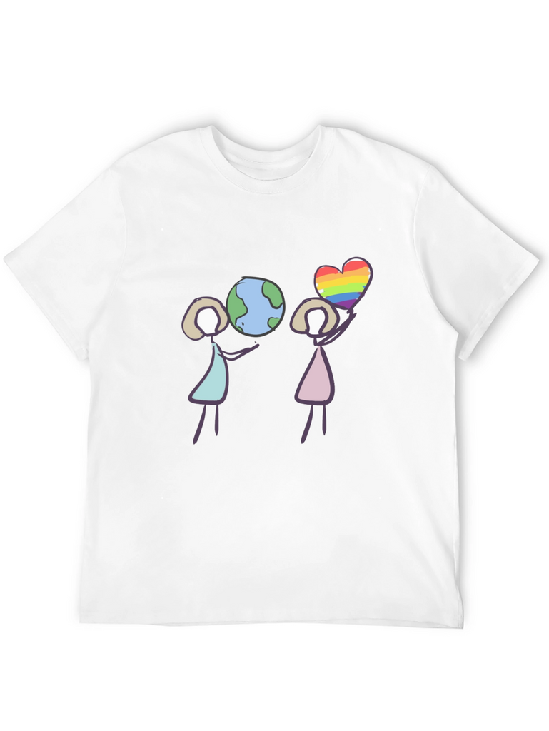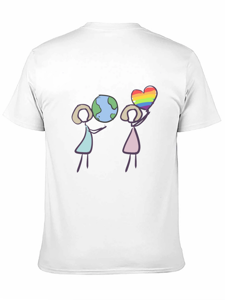 Show your support with this unique graphic tee. The shirt features a creative design of two figures, one holding the Earth and the other a rainbow heart symbolizing LGBT pride and environmental awareness. Made from a comfortable, soft cotton blend, this black t-shirt offers a relaxed fit that is perfect for everyday wear. Ideal for rallies, casual outings, or as a statement piece to promote inclusivity and environmental consciousness. This tee is a wearable expression of solidarity and love.