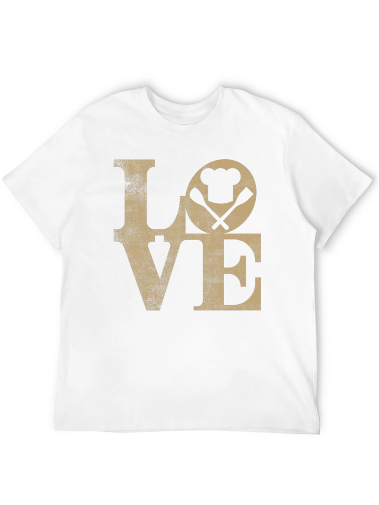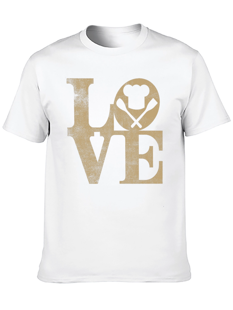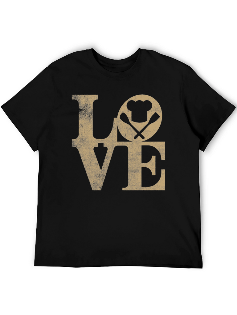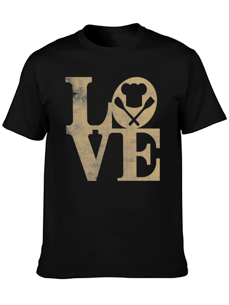 Show your passion for cooking with this stylish black t-shirt! The shirt features a distressed 'LOVE' graphic with a chef's hat and crossed spatulas cleverly replacing the 'O'. This unique design is perfect for chefs, foodies, or anyone who loves to spend time in the kitchen. The tee appears to be made from soft, comfortable cotton, ensuring all-day wearability. It's a great way to express your culinary enthusiasm and makes a fun gift for the cooking enthusiast in your life. Pair it with jeans or shorts for a casual, cool look.
