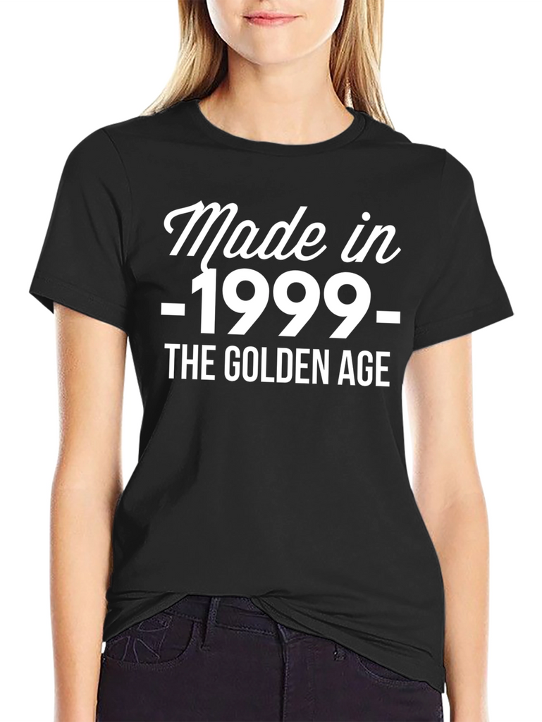 Celebrate the year 1999 with this stylish and comfortable black t-shirt. Featuring a bold, white print that reads "Made in -1999- THE GOLDEN AGE," this tee is perfect for anyone who loves a bit of nostalgia or wants to showcase their birth year with pride. The design is eye-catching and retro-inspired. Constructed from what appears to be a soft and breathable fabric, it offers all-day comfort. Ideal for casual wear, birthday celebrations, or as a unique gift for someone born in 1999, this t-shirt is a must-have addition to any wardrobe. Get yours today and embrace the golden age!