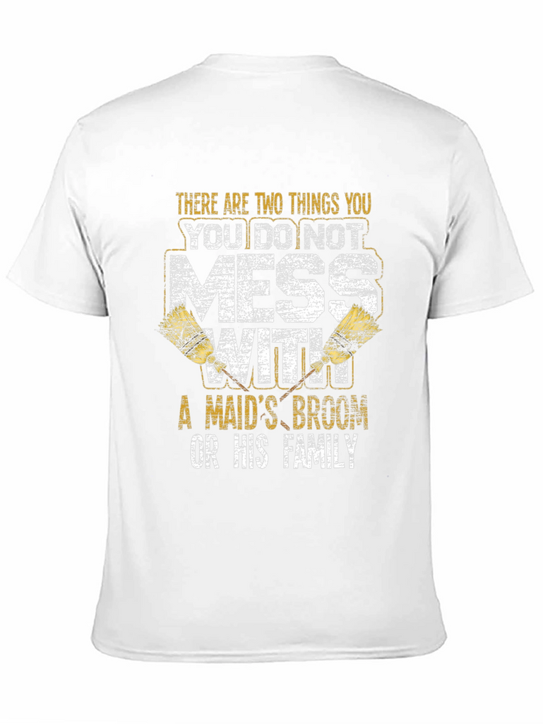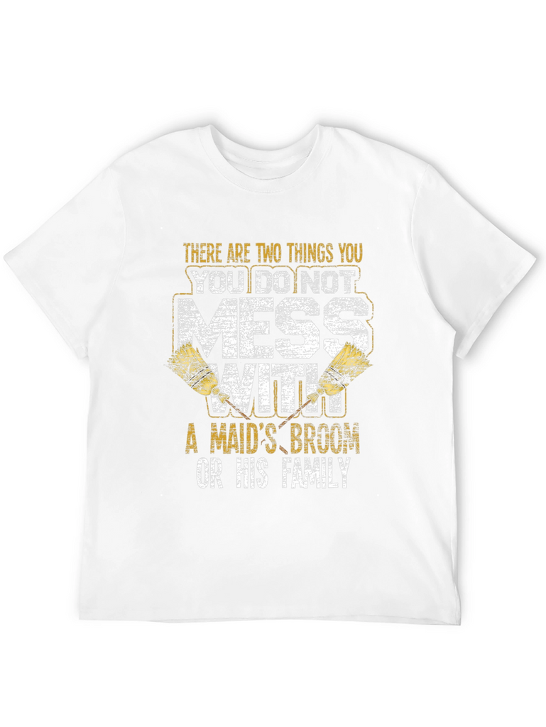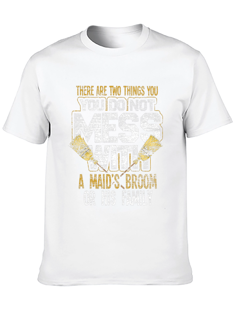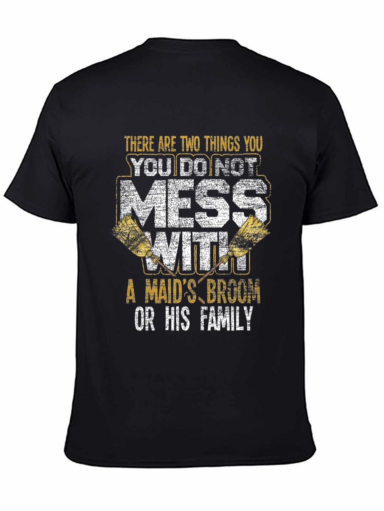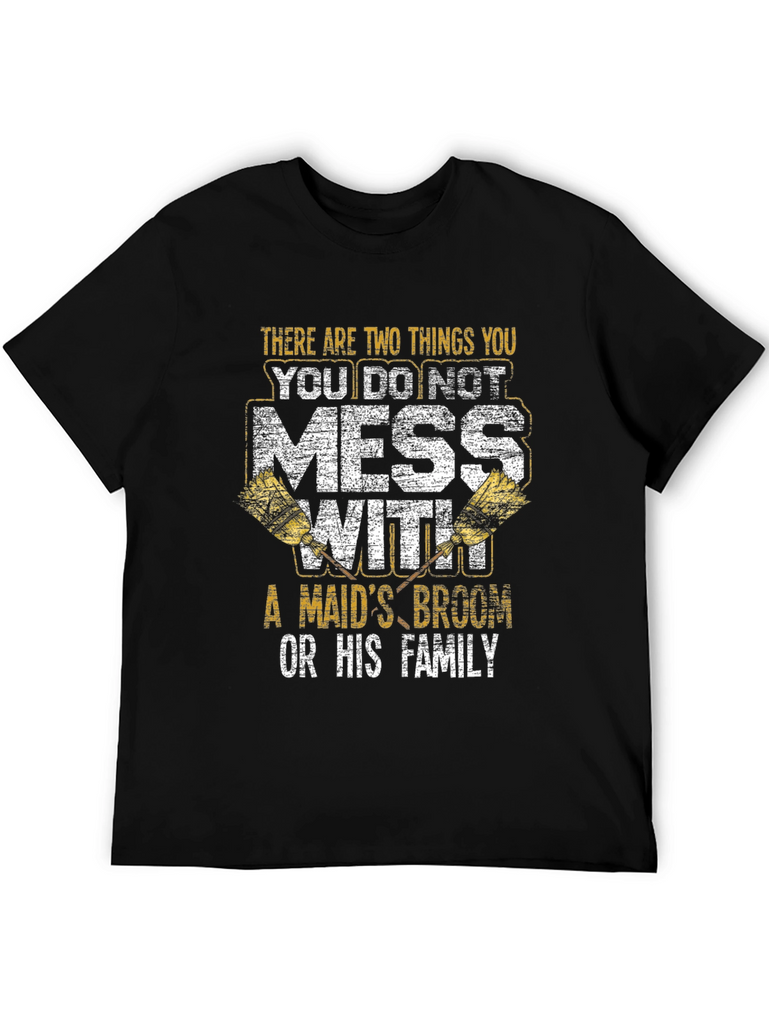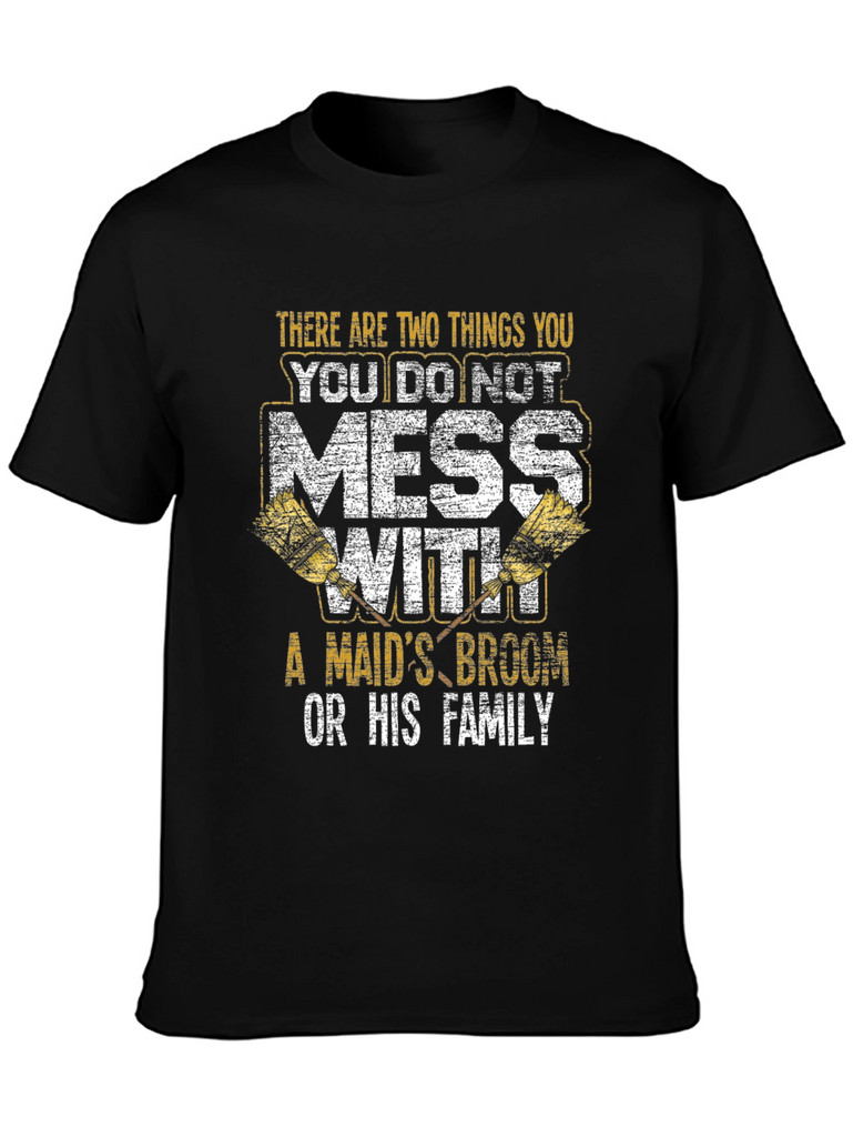 This black graphic tee features a bold design that makes a statement. The shirt's graphic features the phrase "There are two things you You do not mess with: a maid's broom or his family." It also includes broom illustrations to either side of the phrase "Mess with". It appears to be made of a comfortable, breathable material, perfect for everyday wear. Show off your personality with this unique and eye-catching t-shirt!