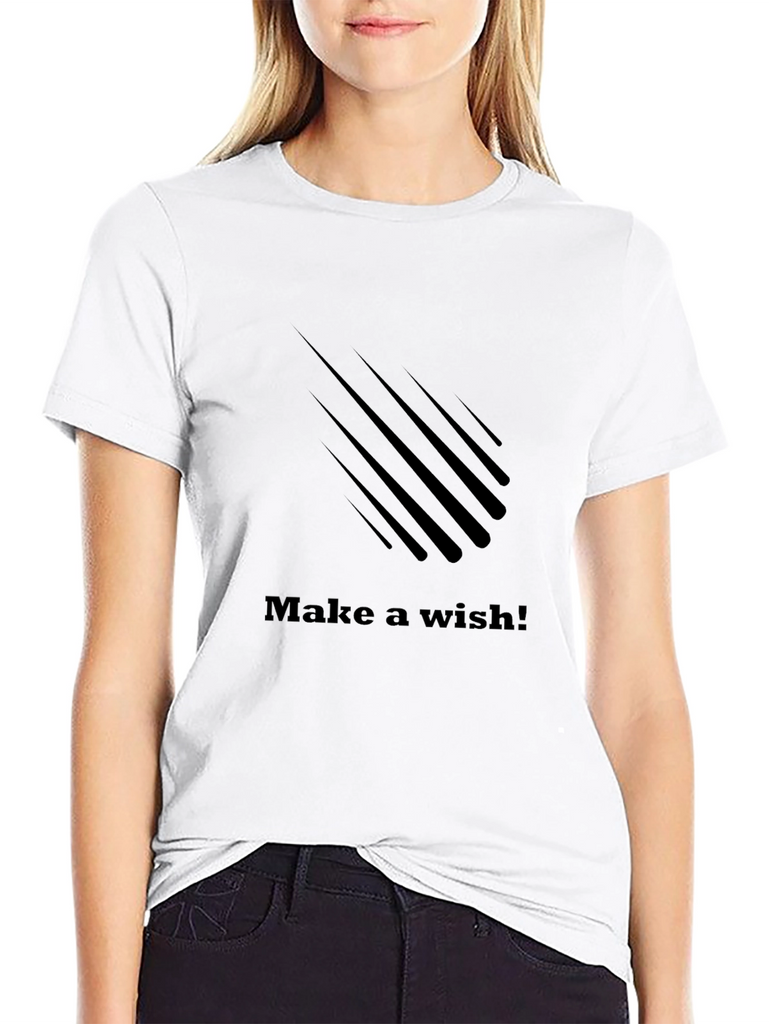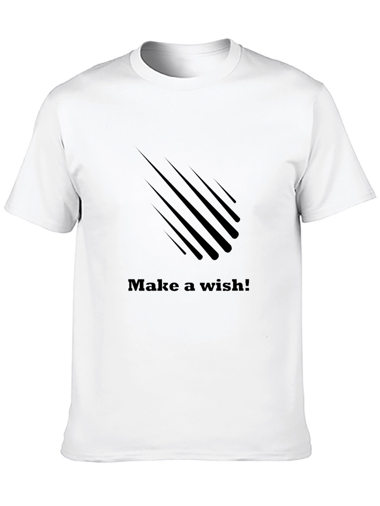 This stylish black tee features a unique shooting star design and the motivational phrase "Make a wish!". Crafted from comfortable, breathable fabric, this shirt is perfect for everyday wear. The eye-catching graphic adds a touch of individuality, making it a great conversation starter. Dress it up with a jacket or keep it casual with jeans – this tee is versatile enough for any occasion. Show off your style with this must-have addition to your wardrobe.