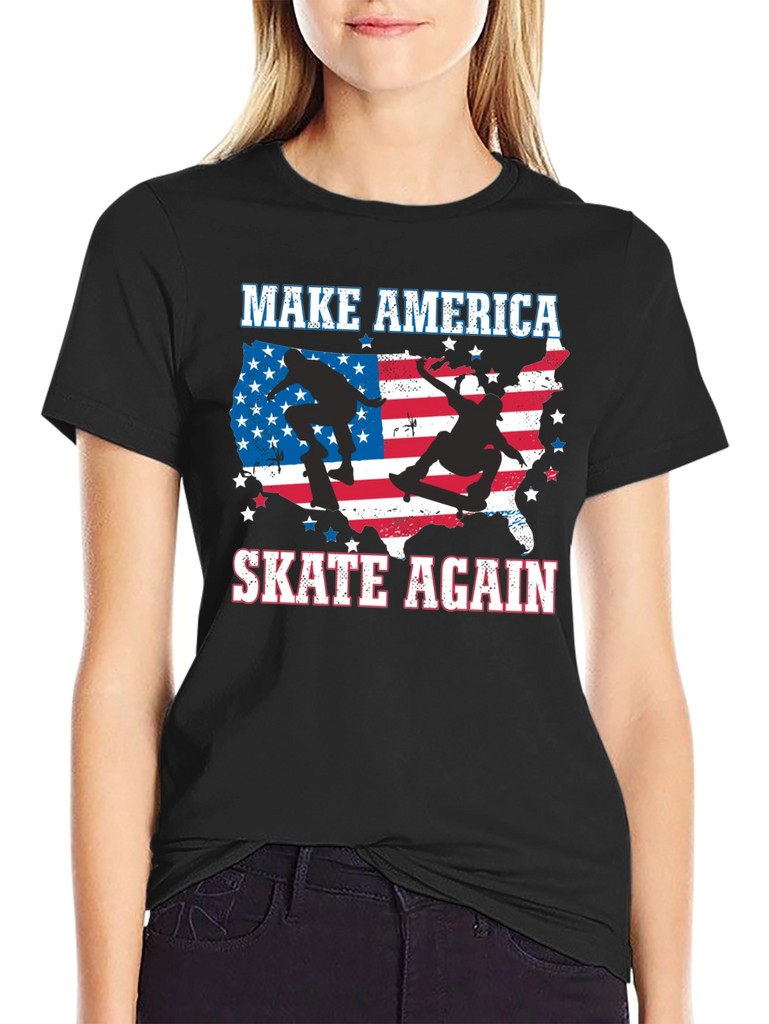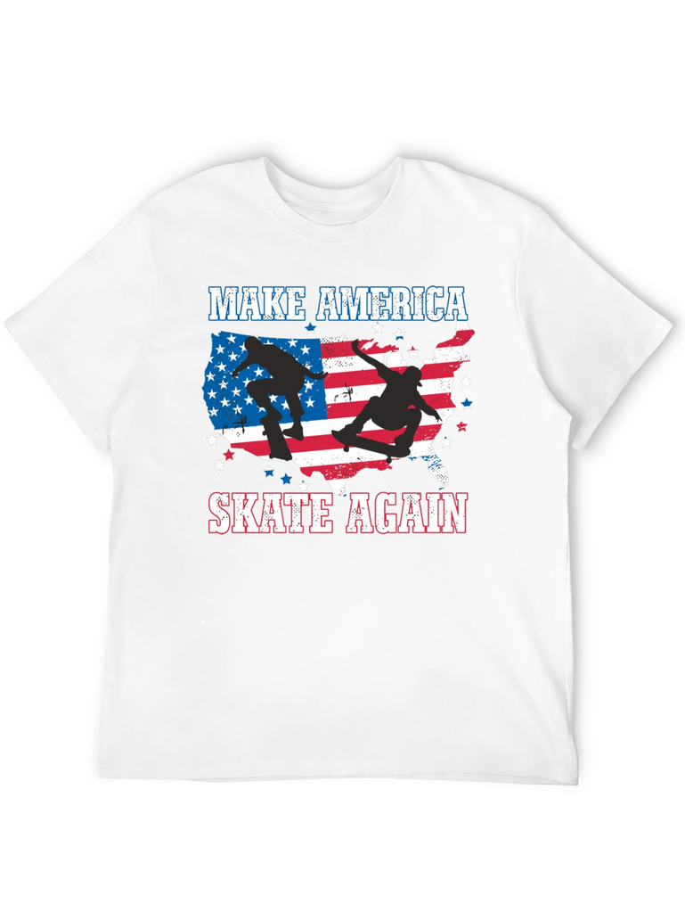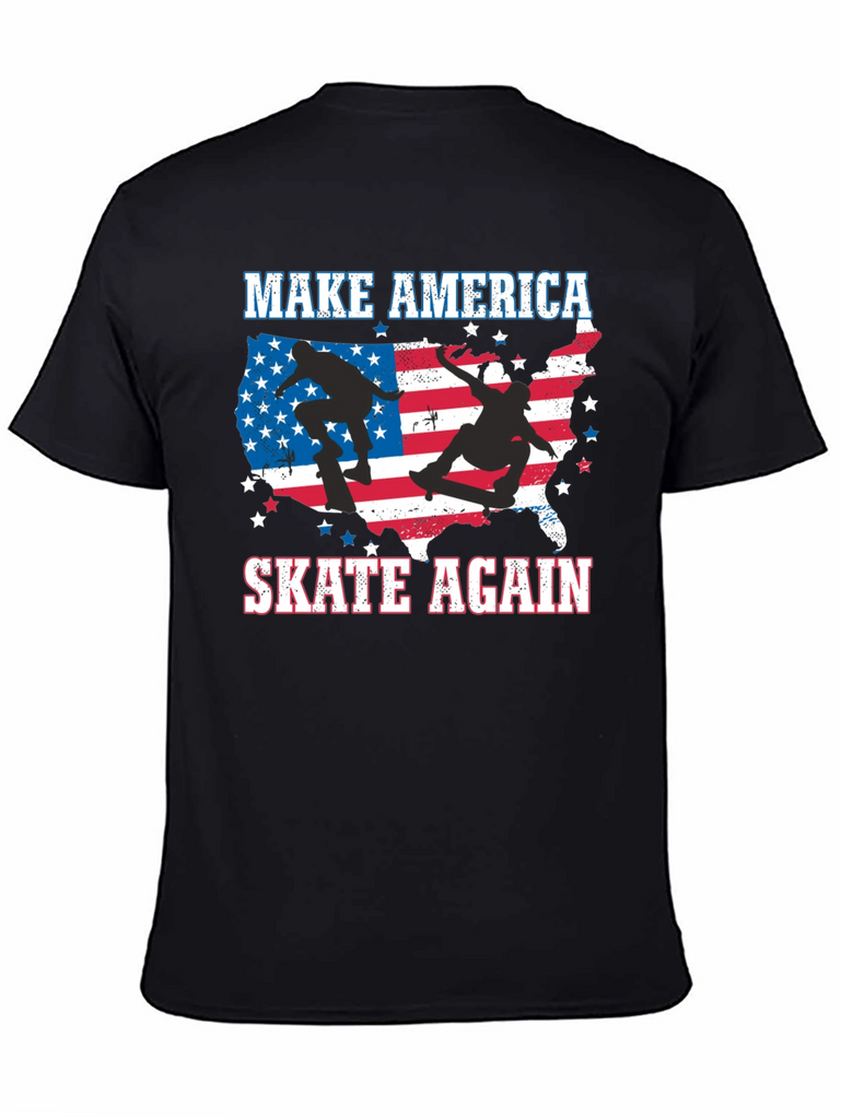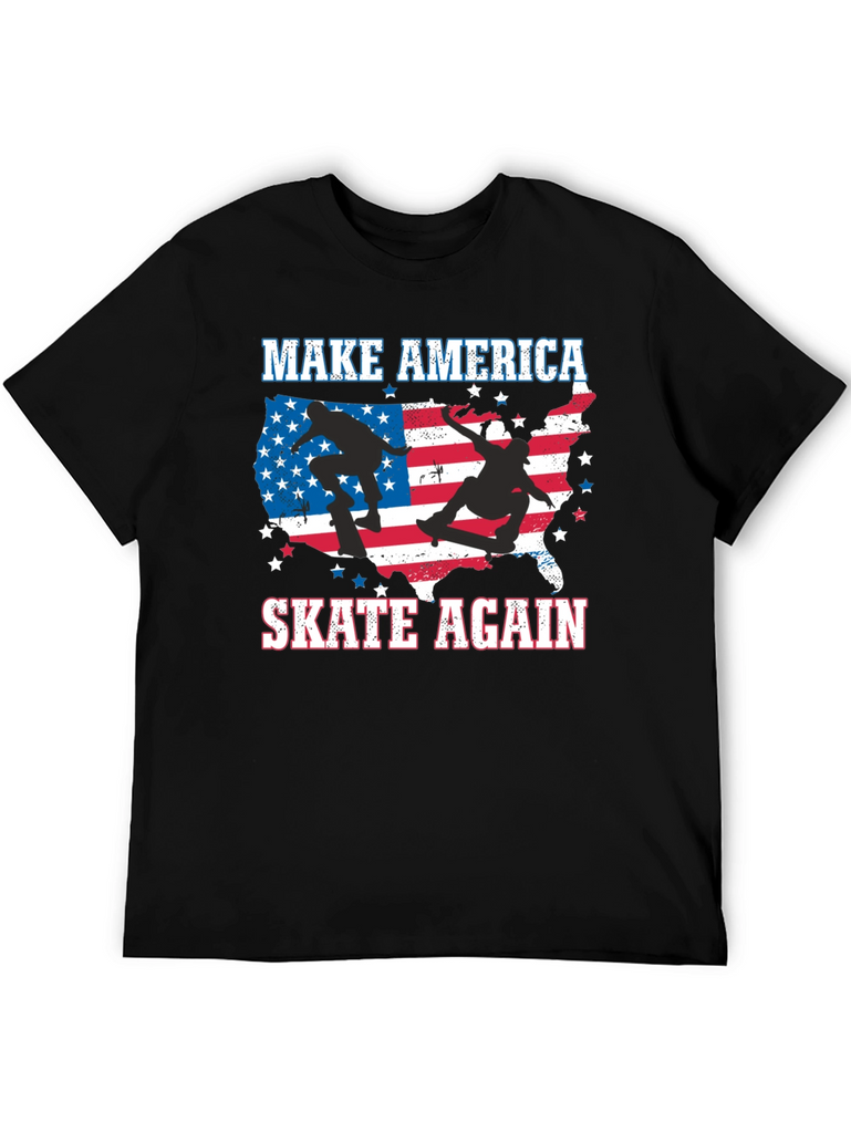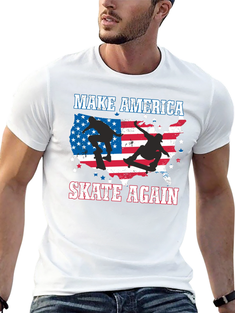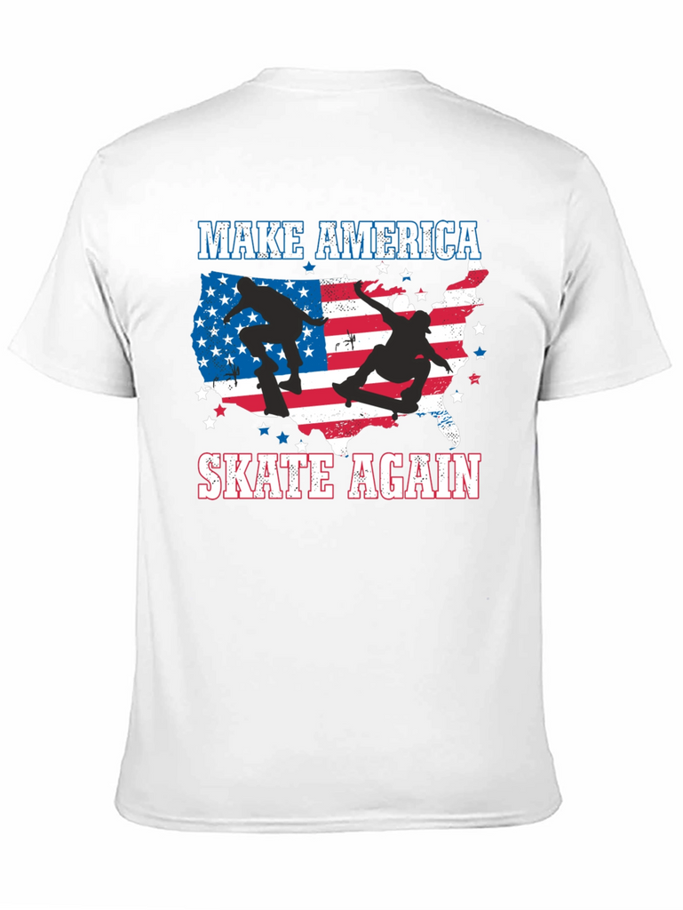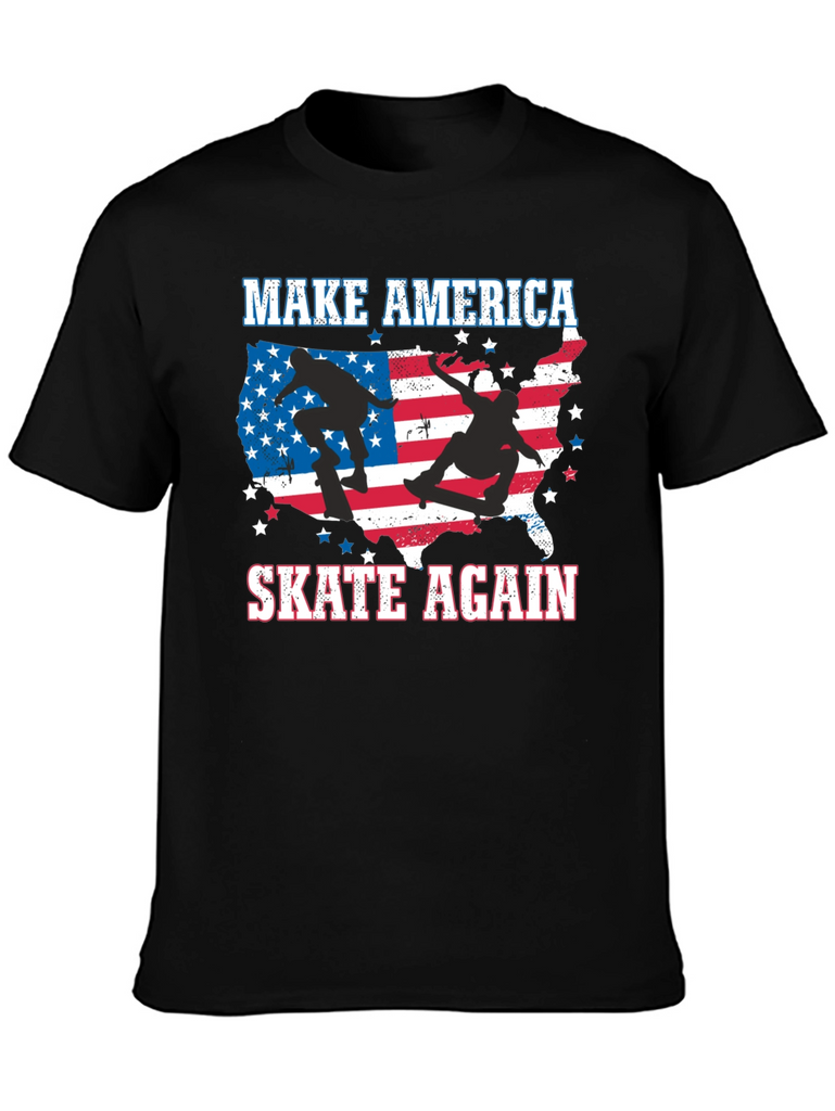 Show your love for skateboarding and American pride with this unique graphic tee. The shirt features a bold design incorporating the American flag within the continental US silhouette, overlaid with silhouettes of skateboarders in action. The phrases "Make America" and "Skate Again" are printed above and below the flag graphic in a vintage-inspired font. Crafted from a comfortable-looking fabric, this tee is perfect for casual wear, skate sessions, or expressing your patriotic spirit. A great addition to any skater's wardrobe!
