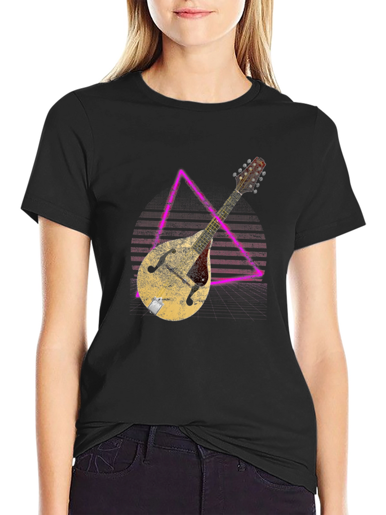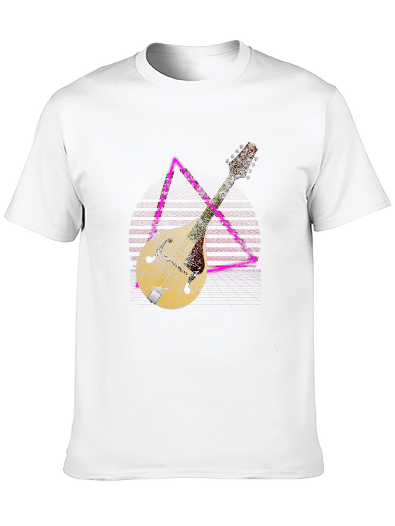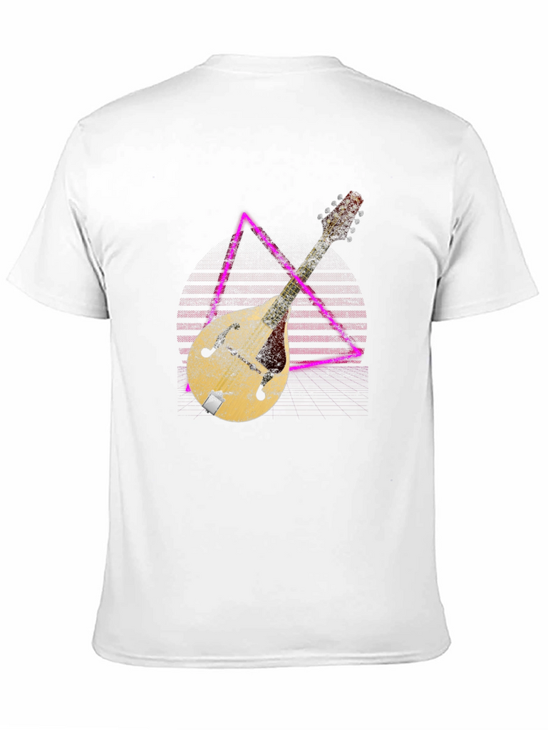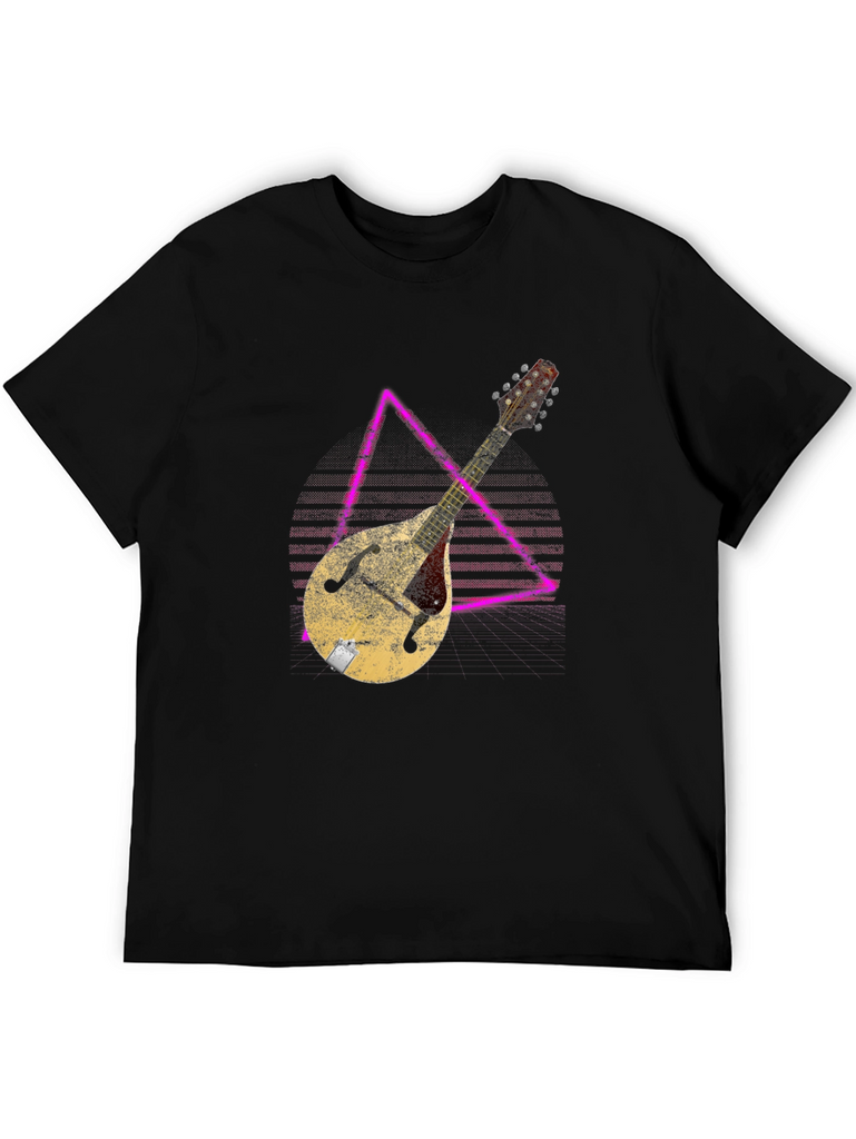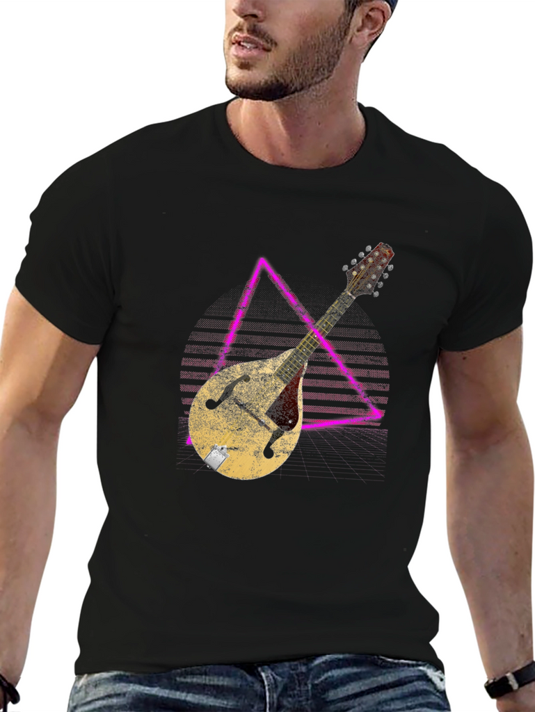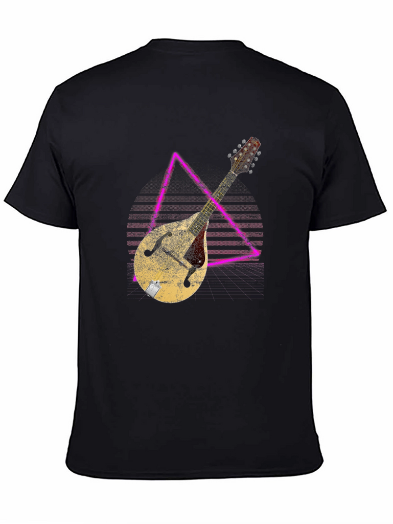 Show off your love for music with this stylish black t-shirt. The shirt features a unique graphic of a vintage mandolin instrument overlaid on a geometric design. The distressed texture of the print gives it a cool, retro vibe. Made from comfortable material, this tee is perfect for casual wear, music events, or simply expressing your passion for stringed instruments. It's a great gift for musicians and music lovers alike. Pair it with jeans or shorts for a relaxed, everyday look. Get ready to strike a chord with this eye-catching graphic tee!