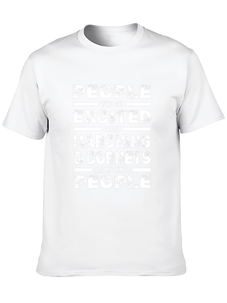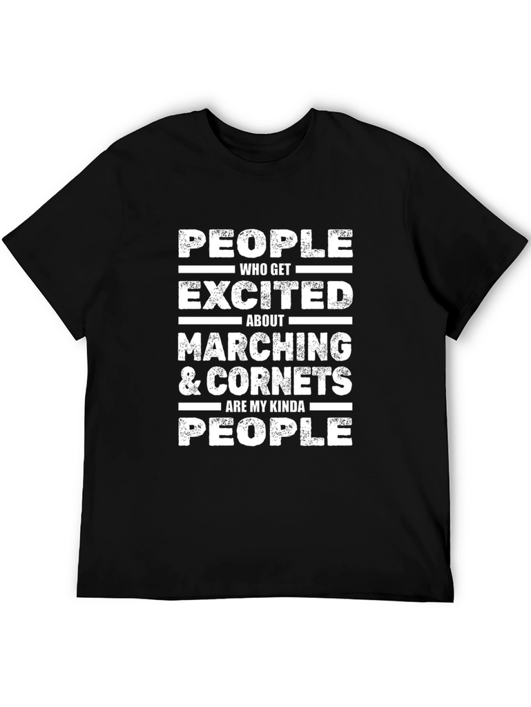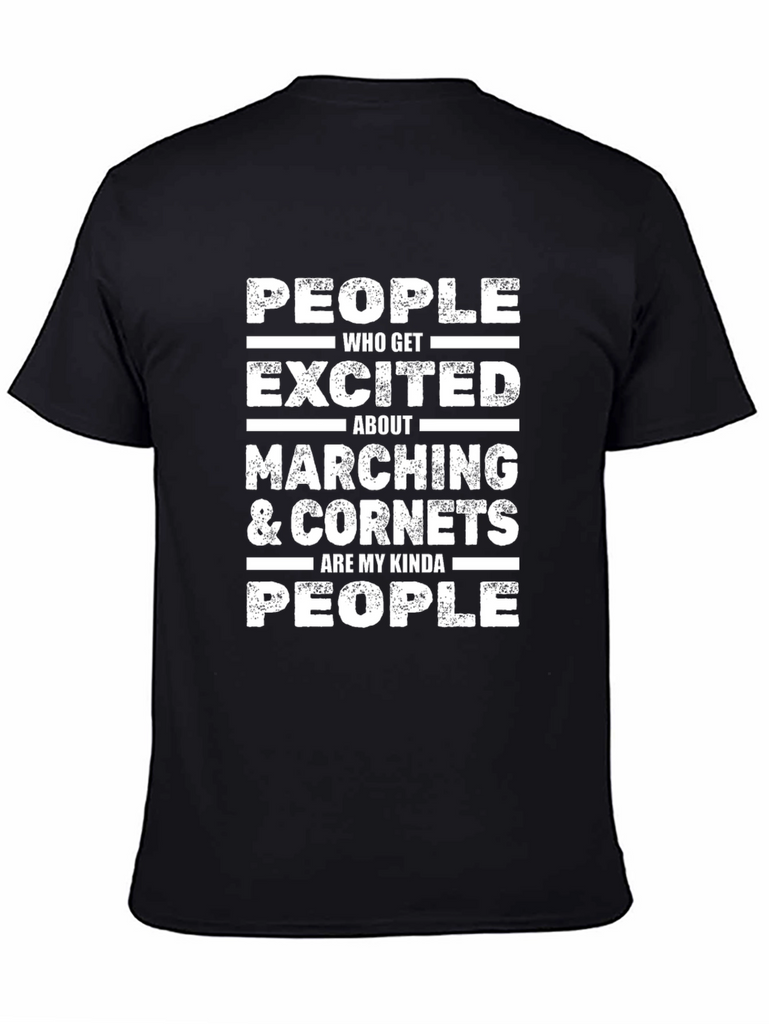 Show off your love for marching and cornets with this bold black t-shirt! The shirt features a distressed white graphic print that reads: 'PEOPLE WHO GET EXCITED ABOUT MARCHING & CORNETS ARE MY KINDA PEOPLE'. The distressed style gives it a cool, vintage vibe. Made from a comfortable, breathable fabric, this tee is perfect for casual wear, band practice, or showing your passion at marching band events. It’s a great conversation starter and makes a unique gift for cornet players and marching band enthusiasts.