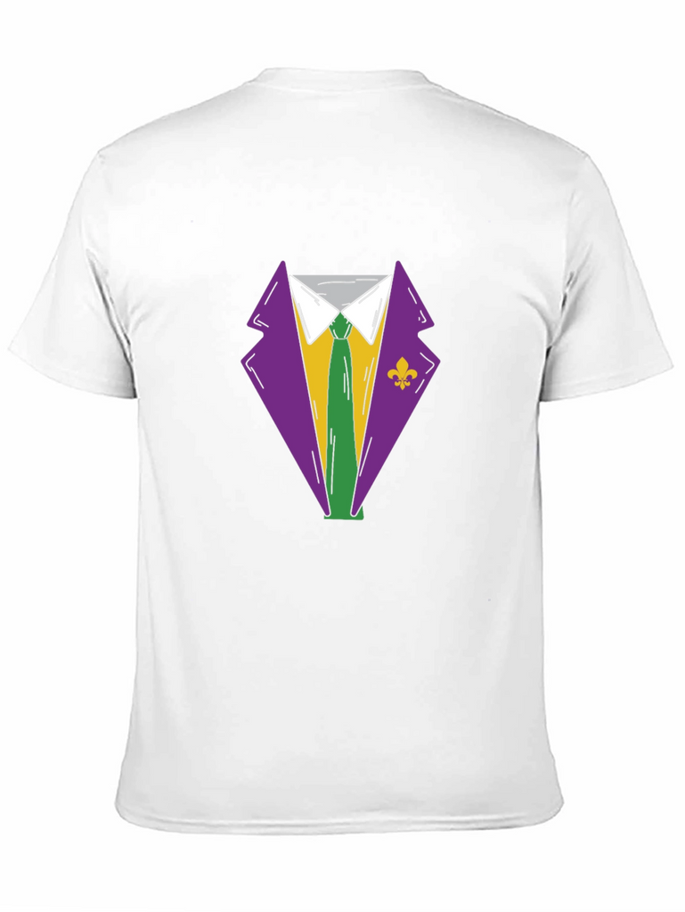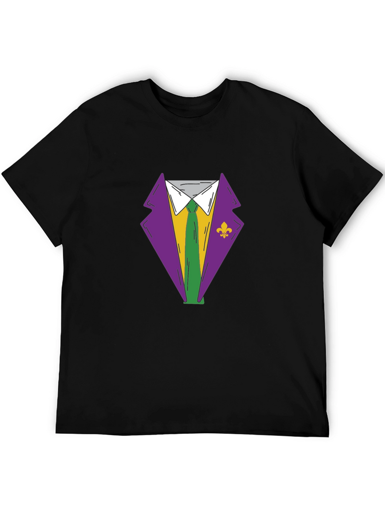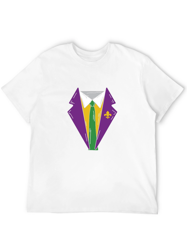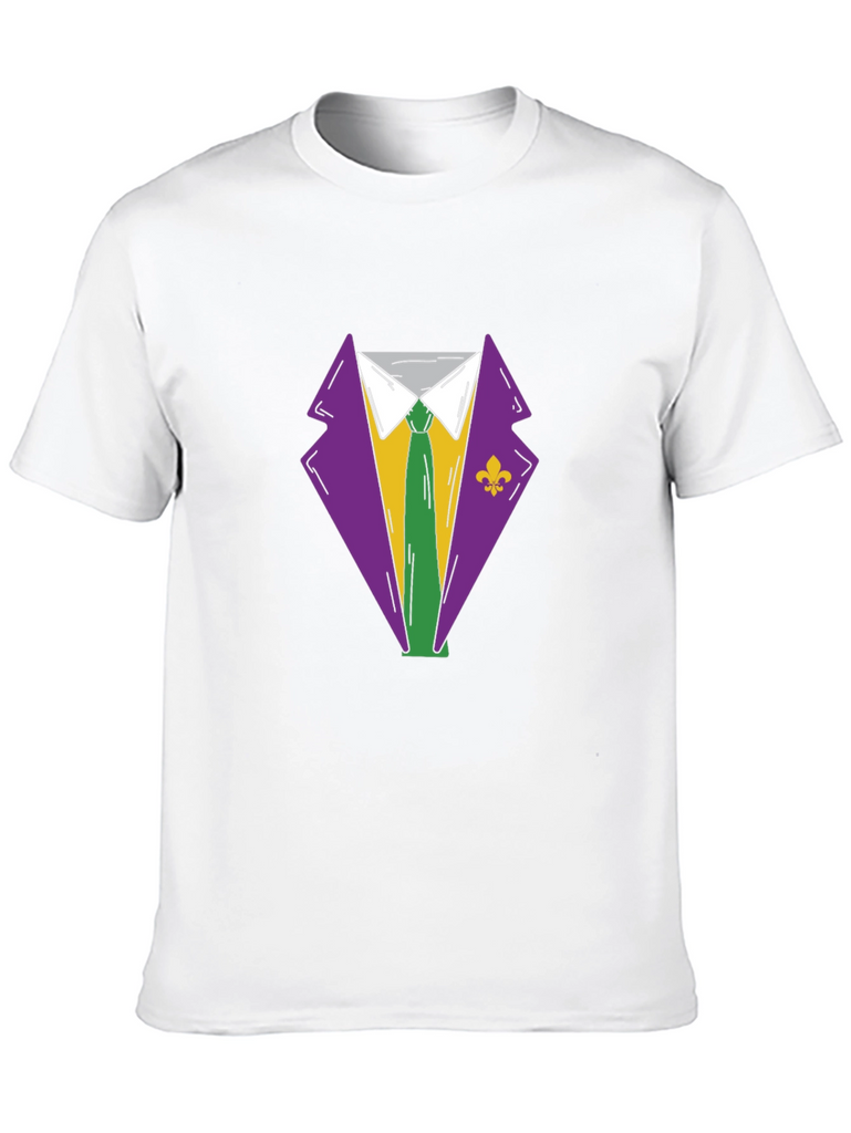 Get ready for Mardi Gras with this fun t-shirt! The shirt features a printed tuxedo design, including a purple jacket, yellow vest, green tie, white shirt, and a gold fleur-de-lis. This unique design is perfect for anyone who wants to celebrate Mardi Gras in style without the formality of a suit. Made from comfortable fabric, it's ideal for parades, parties, and casual wear during the carnival season. Show off your festive spirit with this one-of-a-kind graphic tee!