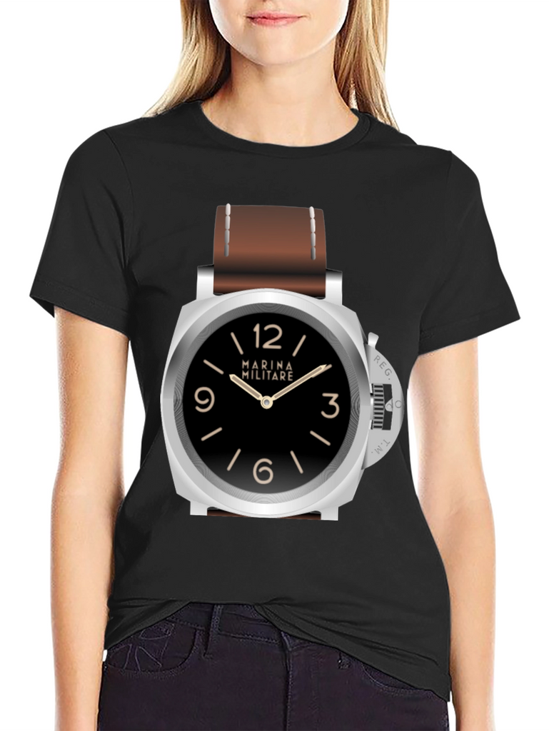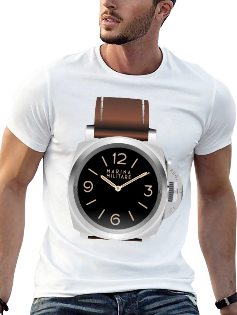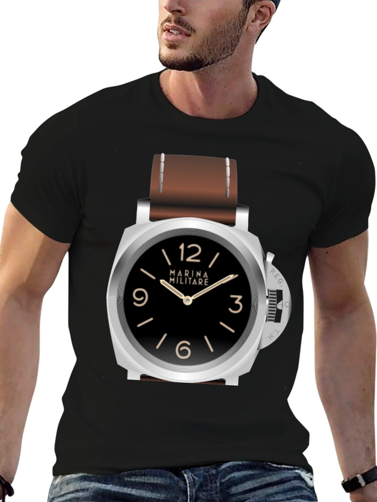 Showcase your unique style with this eye-catching graphic t-shirt. The design features a detailed print of a luxury Marina Militare watch, complete with a brown leather strap and bold numerals. Crafted from a soft, comfortable black fabric, this tee is perfect for everyday wear. The intricate watch graphic adds a touch of sophistication, making it suitable for casual outings or relaxed gatherings. Wear it to express your personality or gift it to a watch enthusiast. Elevate your wardrobe with this standout piece that combines comfort and style.