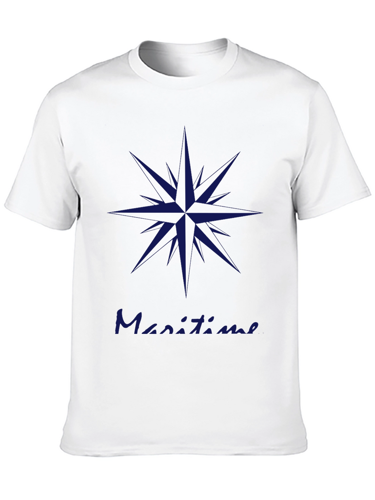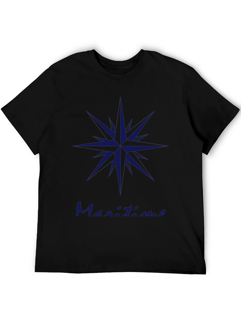Embrace nautical style with this striking black t-shirt! A vibrant blue compass graphic adorns the center, adding a touch of adventure to your everyday wear. The word "Maritime" is written below the compass in a complementary blue color. This classic crewneck t-shirt is crafted from a soft and comfortable fabric, perfect for casual outings or relaxing at home. Show off your love for the sea with this eye-catching tee. Ideal for sailors, beachgoers, or anyone who appreciates maritime design. Make a statement with this comfortable and stylish t-shirt!