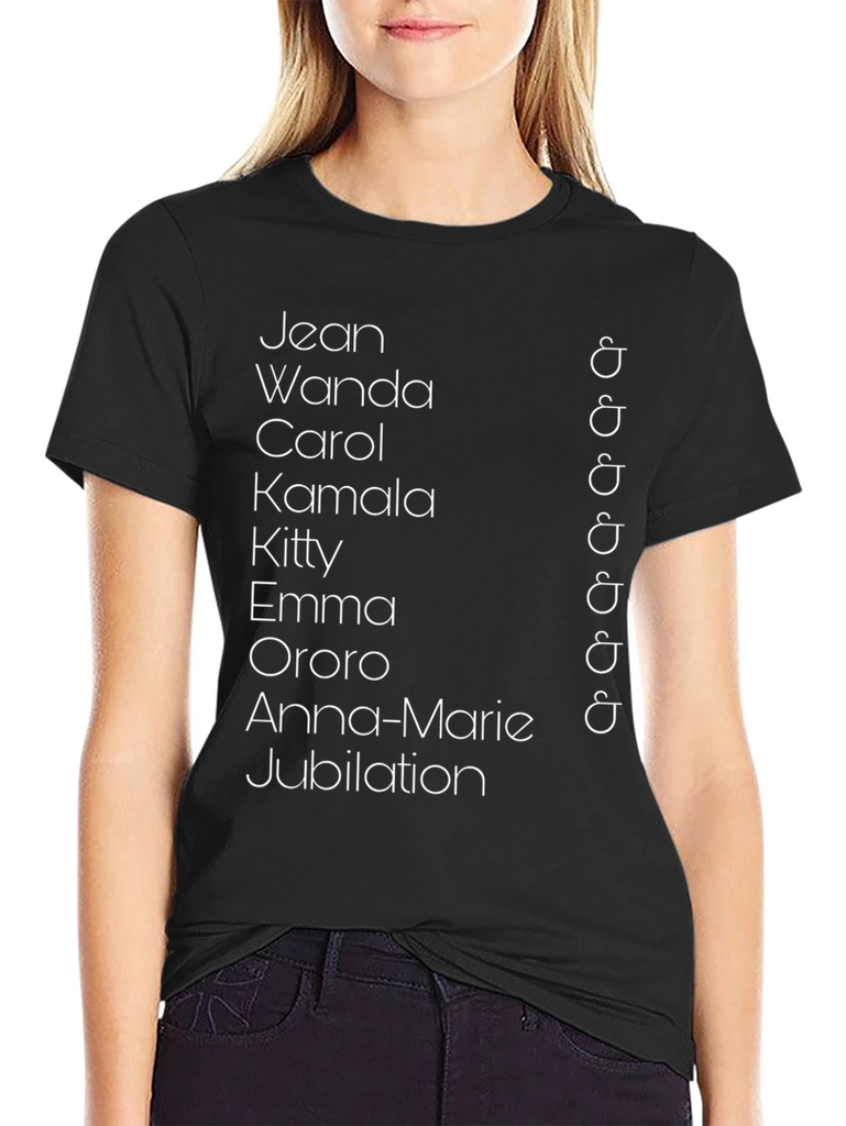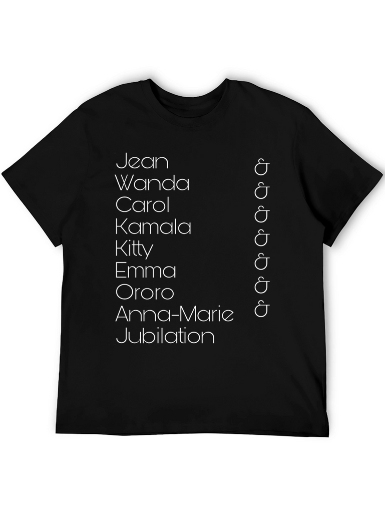 Embrace your love for Marvel's X-Men with this unique black T-shirt featuring a list of iconic female characters. From Jean to Jubilation, the names are neatly printed down the front, accompanied by a coffee cup symbol, adding a touch of whimsy to the design. Made from soft, breathable cotton, this T-shirt offers both comfort and style. Perfect for casual wear, comic conventions, or simply showing off your fandom. Makes a great gift for any Marvel enthusiast!