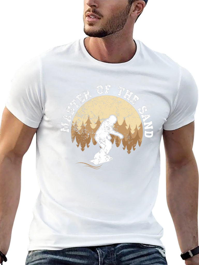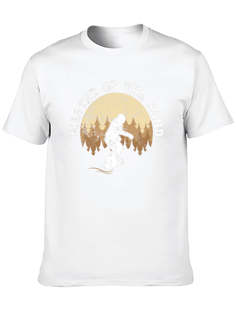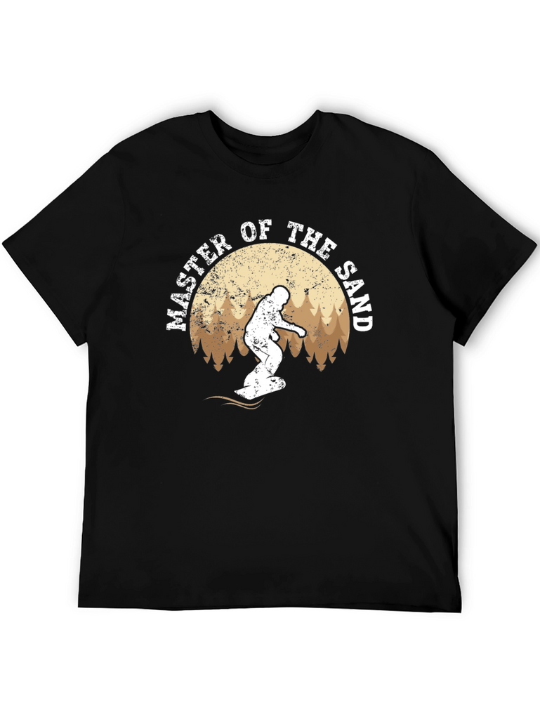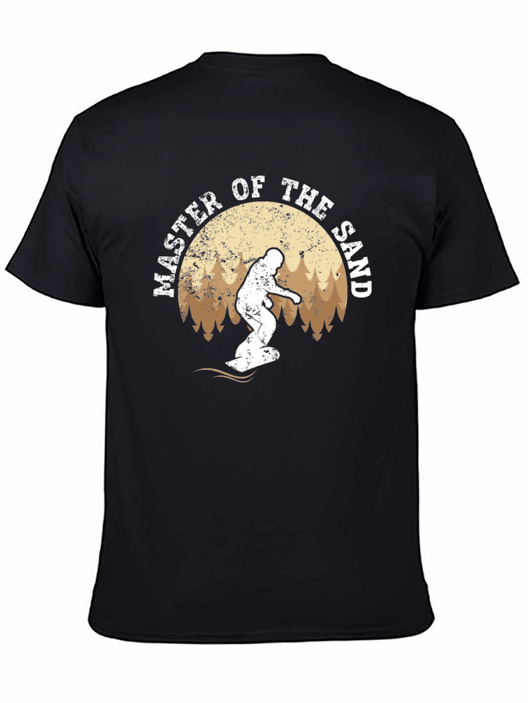 Embrace the sandy slopes with this stylish black t-shirt. Featuring a unique graphic of a sandboarder silhouetted against a vintage-style sunset, it captures the thrill of adventure. The phrase "Master of the Sand" is printed in a bold, circular design, adding a touch of edgy flair. Made from a comfortable-looking cotton blend, this tee is perfect for casual wear, outdoor activities, or simply showing off your love for extreme sports. Durable and eye-catching, it's a must-have addition to any adventurer's wardrobe. Show off your master skills with this tee!