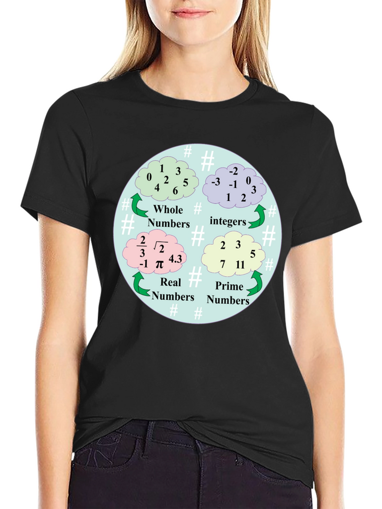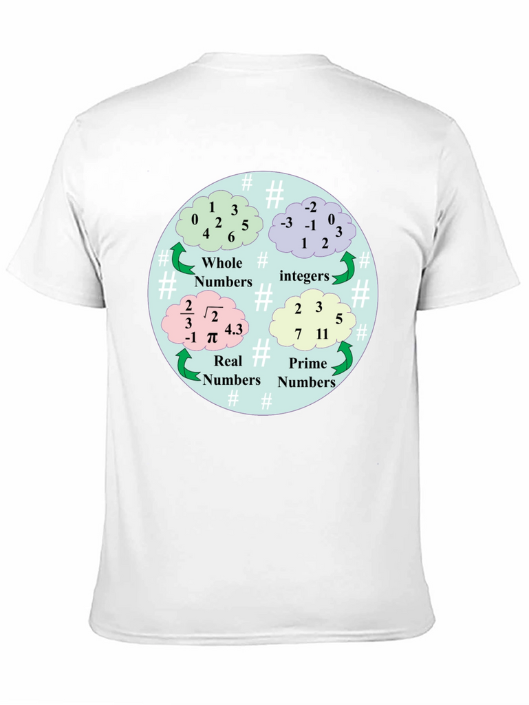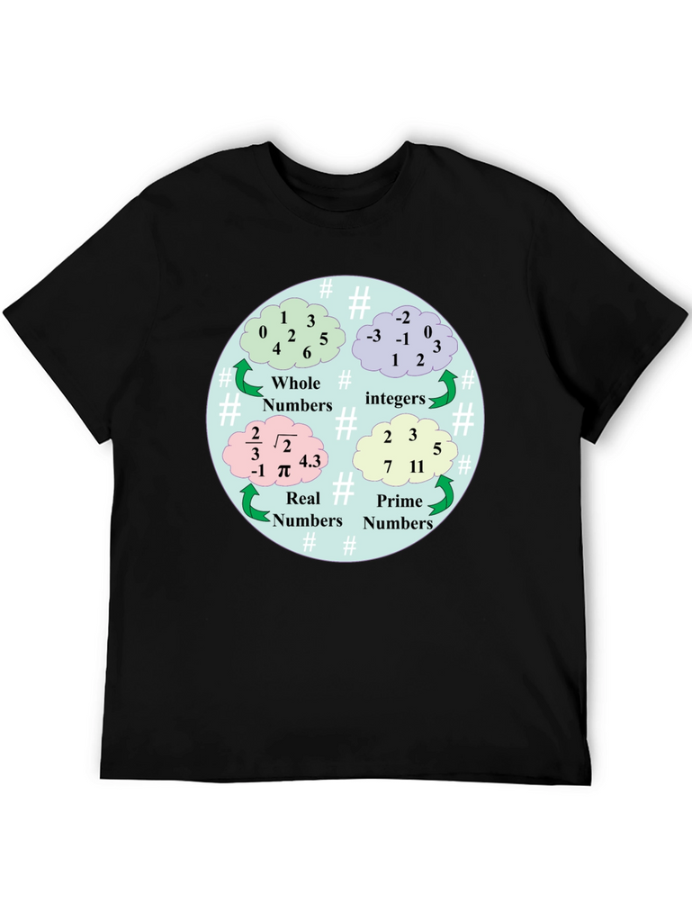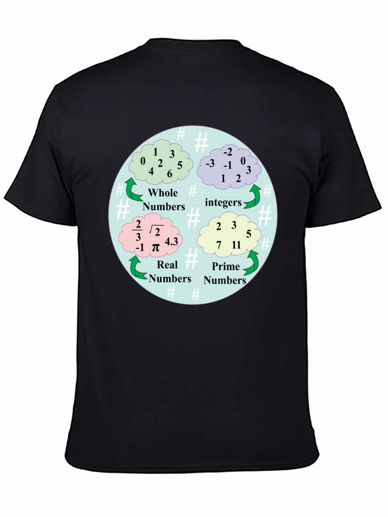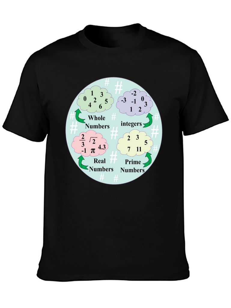 Show off your love for math with this unique t-shirt! This black tee features a colorful graphic illustrating different types of numbers: Whole, Integer, Real, and Prime. The design is circular, using cloud-shaped bubbles to display examples of each number category. Made from comfortable materials, this shirt is perfect for math enthusiasts, students, teachers, or anyone who appreciates a clever and educational design. Wear it to school, tutoring sessions, math club meetings, or casual outings. It's a great conversation starter and a fun way to express your passion for numbers!