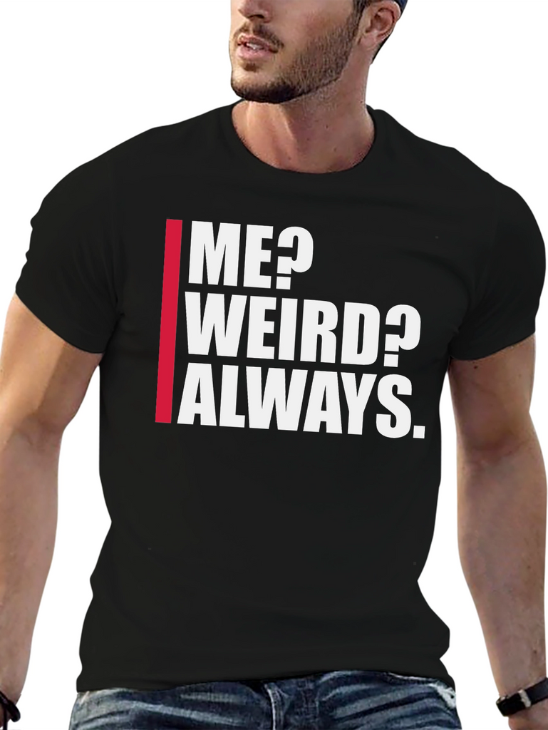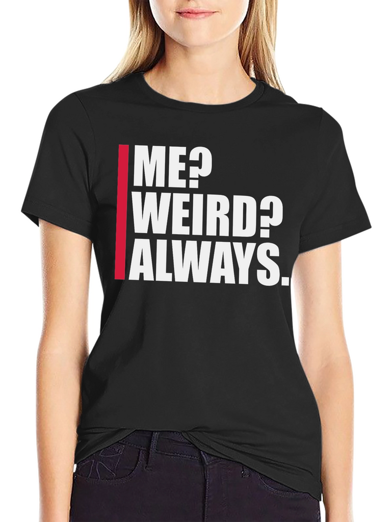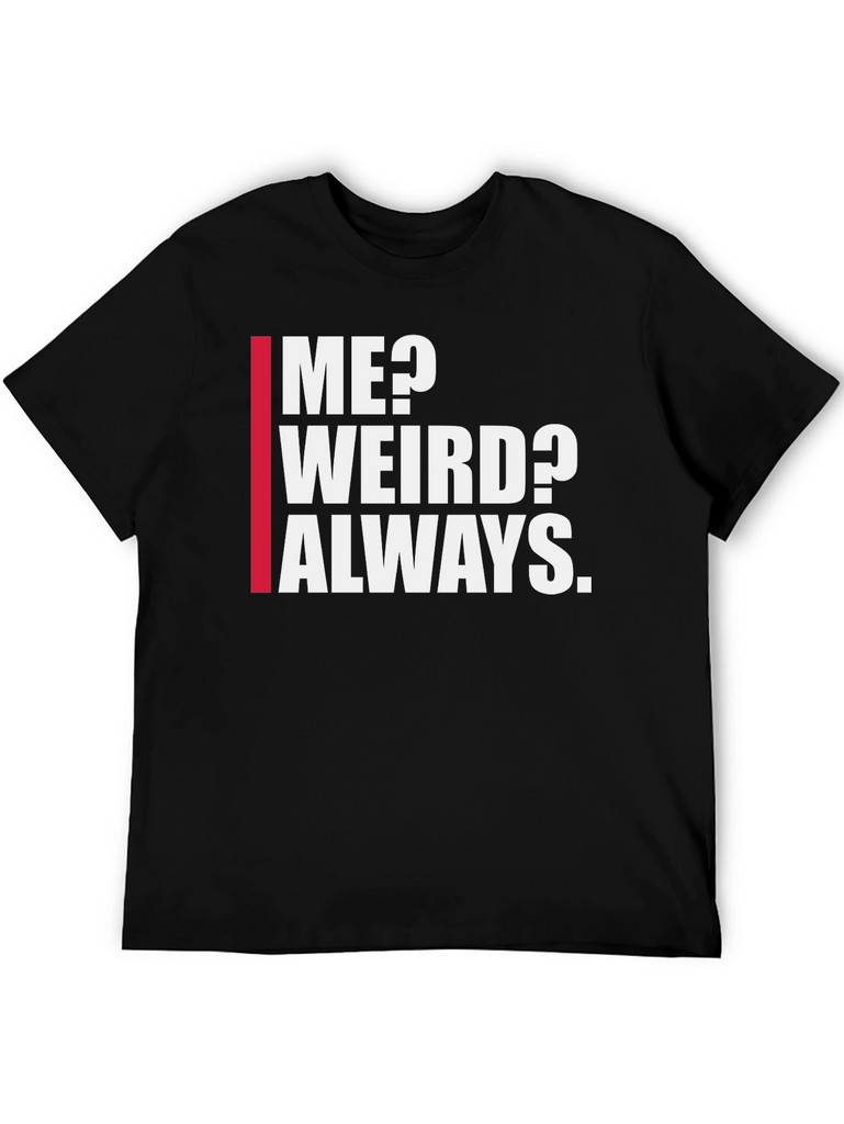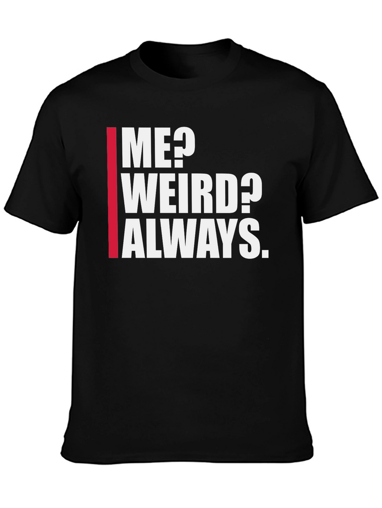 Express your quirky personality with this statement-making black t-shirt. Featuring the bold, white text "ME? WEIRD? ALWAYS." alongside a striking red accent line, this tee is sure to turn heads. Made from a soft, comfortable fabric, this short-sleeve shirt is perfect for casual wear. Whether you're lounging at home or out with friends, this fun graphic tee is a great way to show off your unique sense of humor and embrace your inner weirdo. A must-have for anyone who loves to stand out from the crowd.