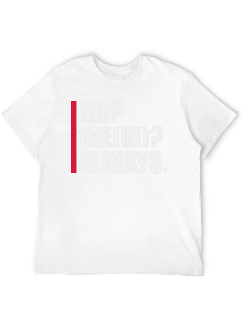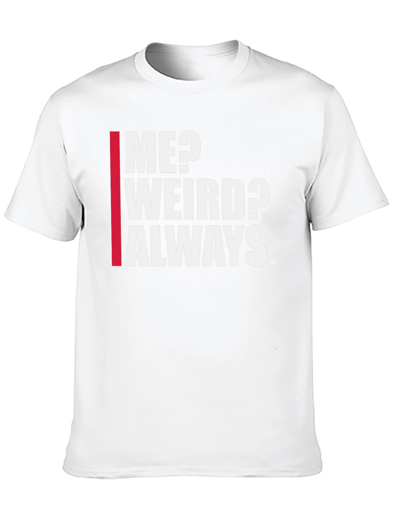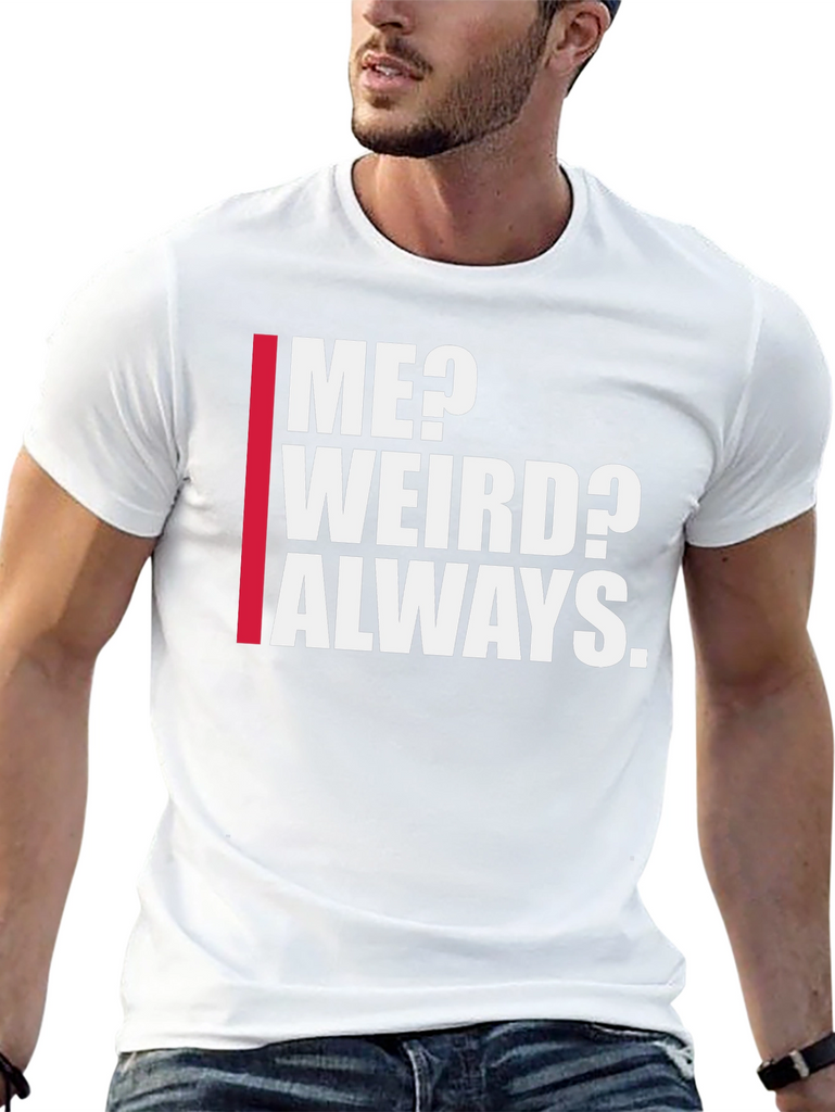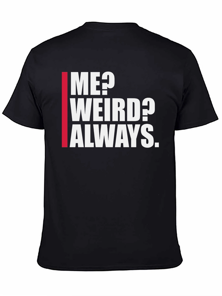 Express your quirky personality with this statement-making black t-shirt. Featuring the bold, white text "ME? WEIRD? ALWAYS." alongside a striking red accent line, this tee is sure to turn heads. Made from a soft, comfortable fabric, this short-sleeve shirt is perfect for casual wear. Whether you're lounging at home or out with friends, this fun graphic tee is a great way to show off your unique sense of humor and embrace your inner weirdo. A must-have for anyone who loves to stand out from the crowd.