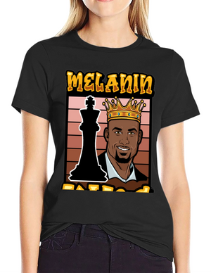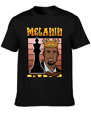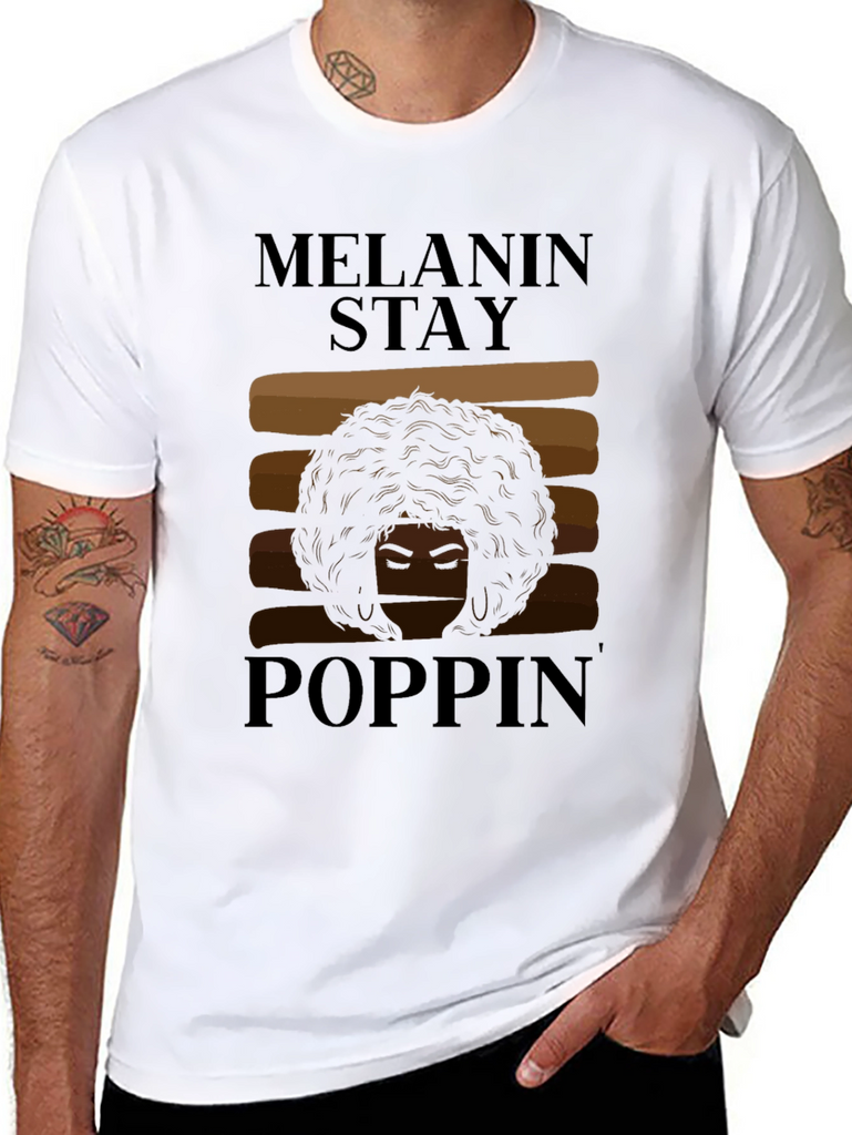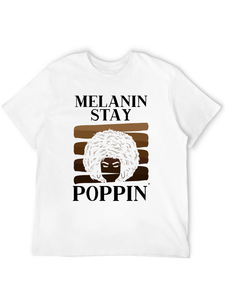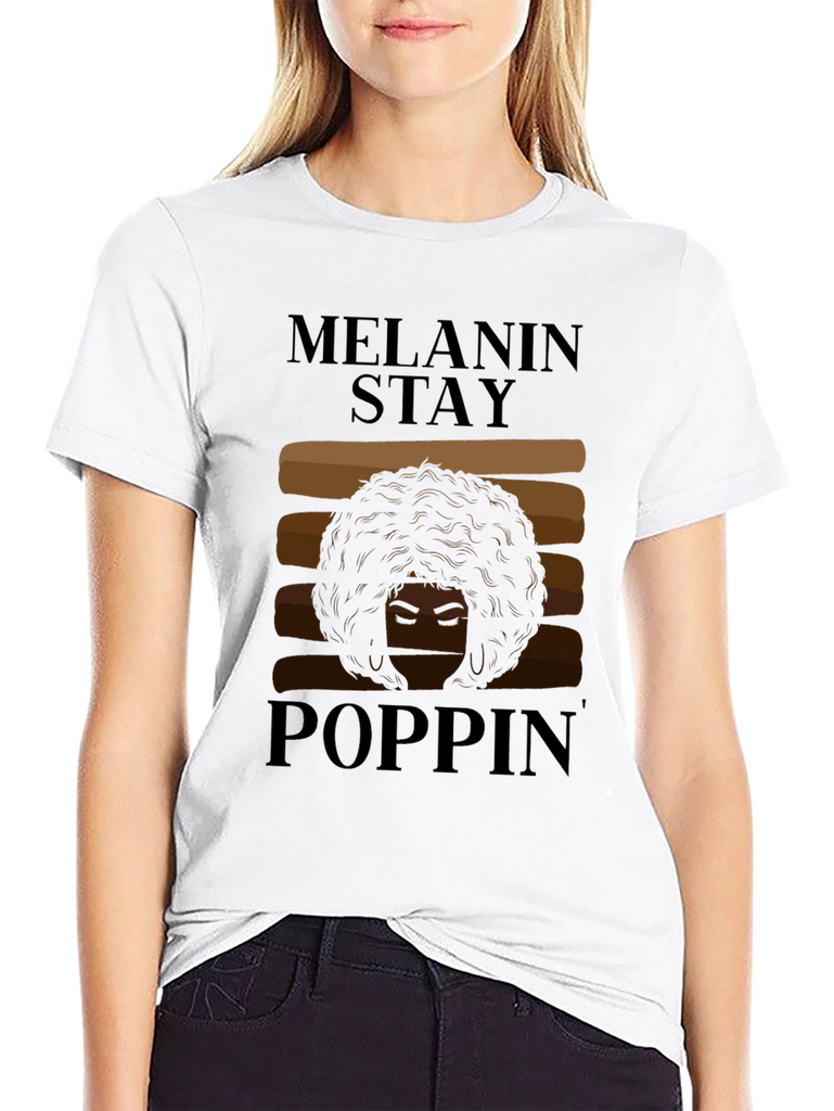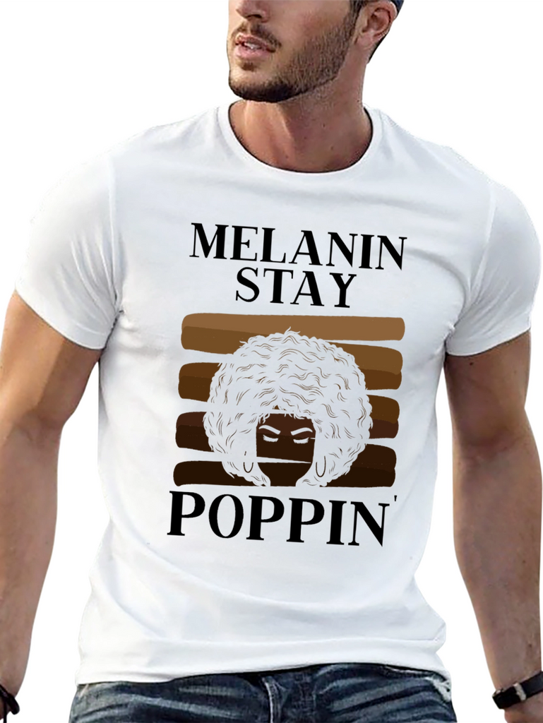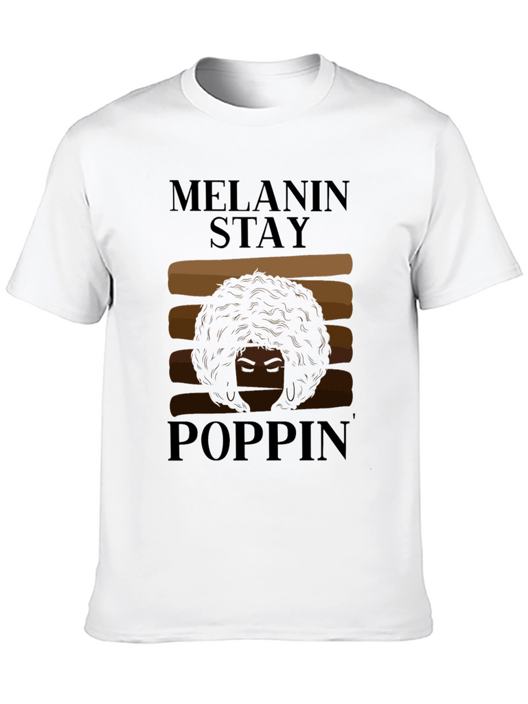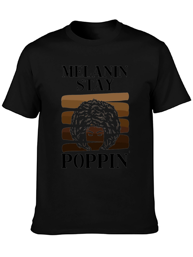 Show off your pride with this stylish black t-shirt featuring a 'Melanin Stay Poppin'' graphic. The design incorporates stripes in varying shades of brown, creating a striking visual appeal. Made from comfortable material, this tee is perfect for casual wear, making a statement wherever you go. The classic fit and short sleeves make it a versatile addition to any wardrobe. Ideal for everyday wear, cultural events, or as a thoughtful gift, this tee celebrates black pride with flair.