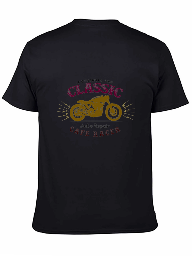 Show off your love for vintage motorcycles with this stylish men's black t-shirt. Featuring a bold graphic of a classic cafe racer with "Authentic and Classic" and "Cafe Racer Auto Repair" text, this tee is perfect for motorcycle enthusiasts and vintage lovers. The design is printed with high-quality inks for a vibrant and durable finish. Made from soft, breathable fabric, this shirt is comfortable to wear all day long. Wear it while riding your motorcycle, hanging out with friends, or simply showing off your unique style. A must-have for any casual wardrobe.