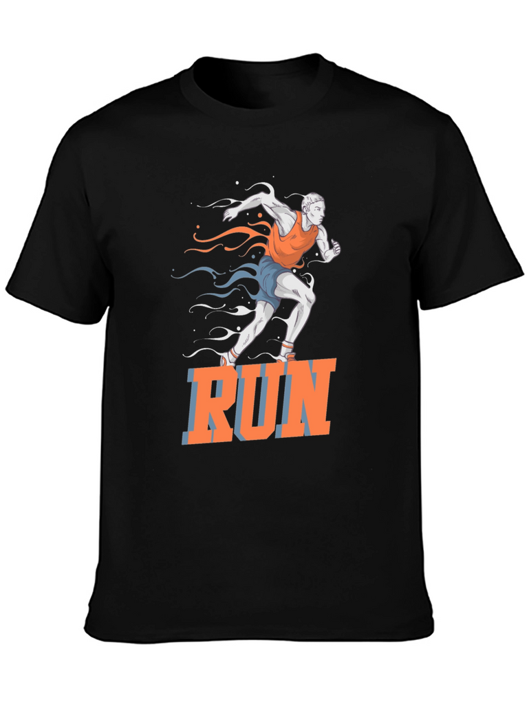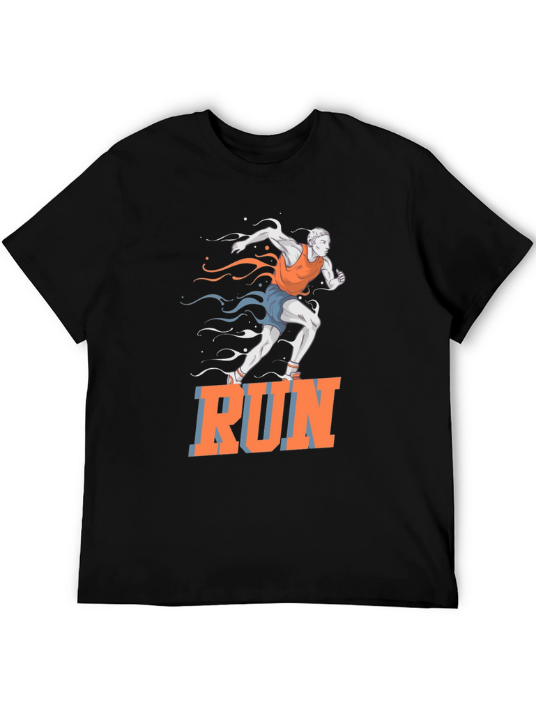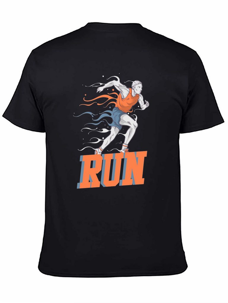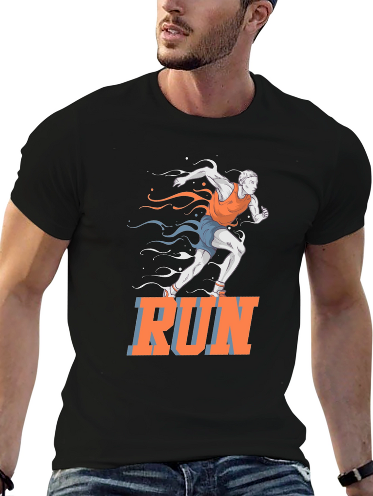 This black t-shirt features a vibrant graphic of a runner in motion, accented with stylized streaks in orange and blue. The bold "RUN" text adds a motivational touch. Made from a comfortable, breathable fabric, this tee is perfect for workouts, casual wear, or making a statement. Ideal for athletes, fitness enthusiasts, or anyone who loves an active lifestyle. Show off your passion for running with this eye-catching design!