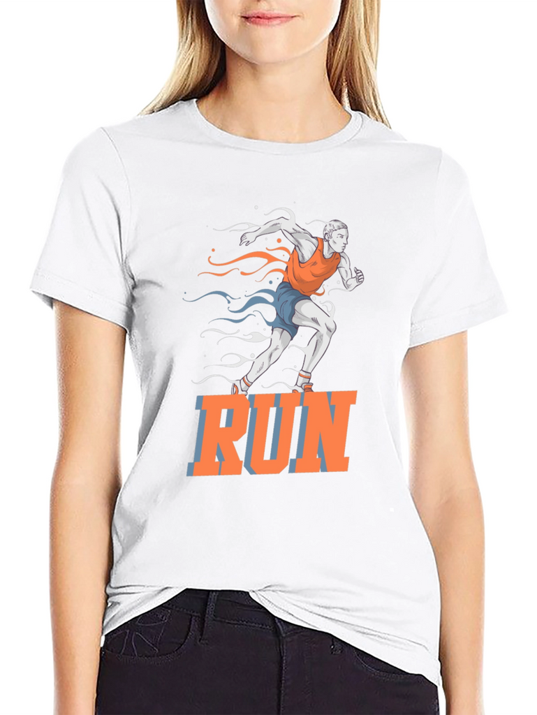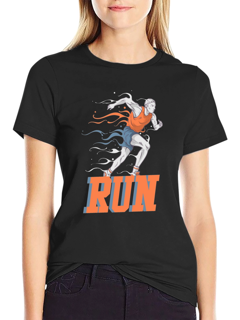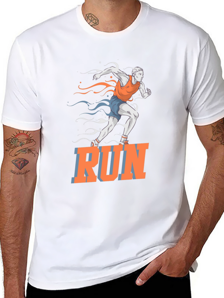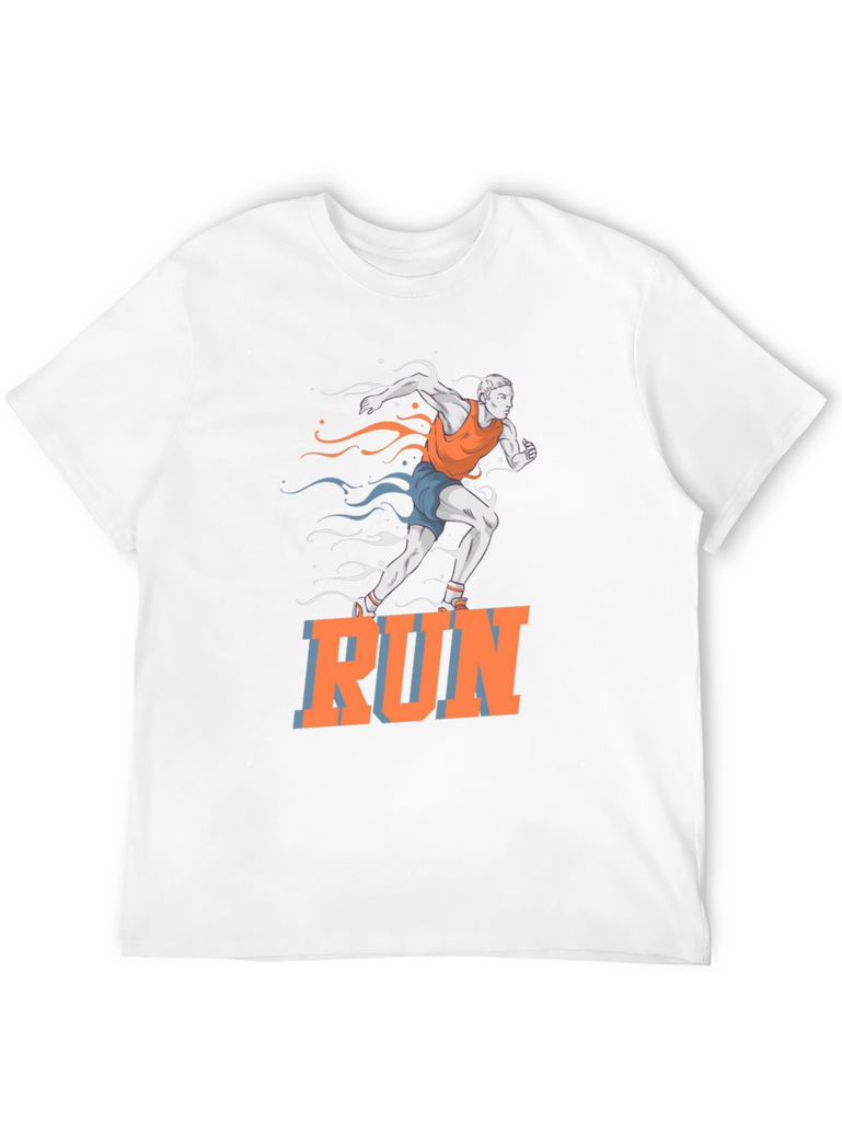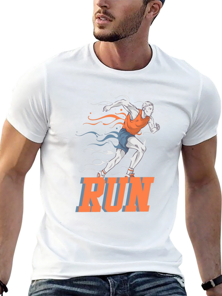 This black t-shirt features a vibrant graphic of a runner in motion, accented with stylized streaks in orange and blue. The bold "RUN" text adds a motivational touch. Made from a comfortable, breathable fabric, this tee is perfect for workouts, casual wear, or making a statement. Ideal for athletes, fitness enthusiasts, or anyone who loves an active lifestyle. Show off your passion for running with this eye-catching design!