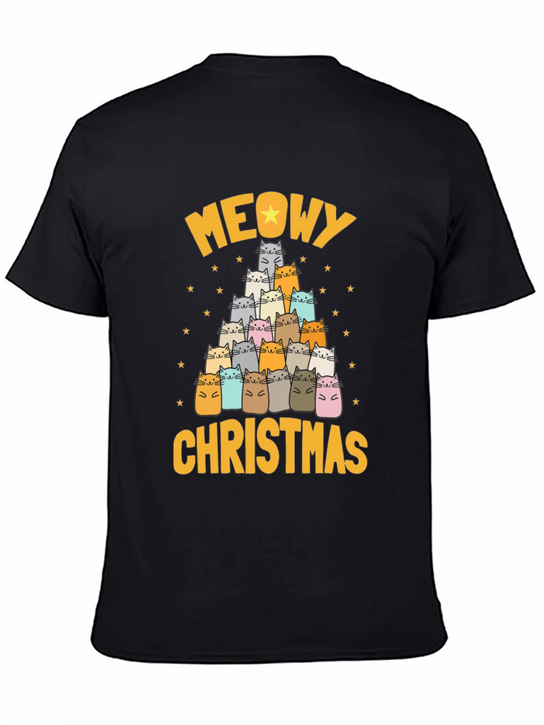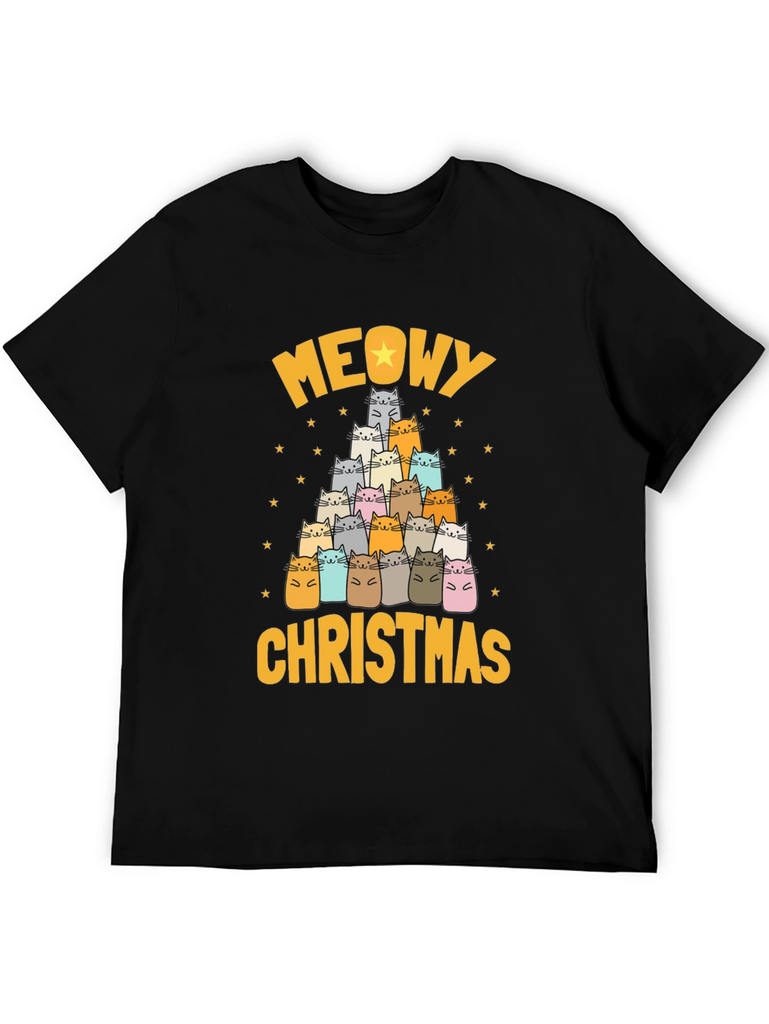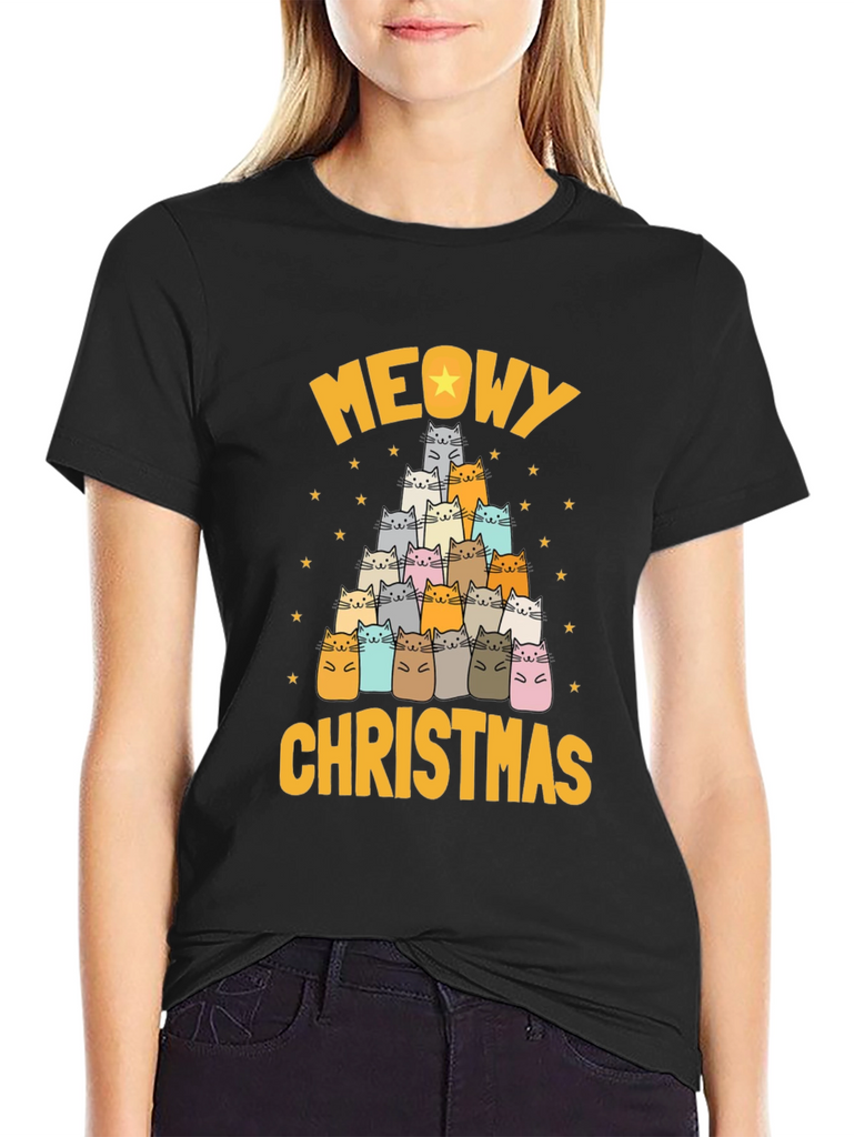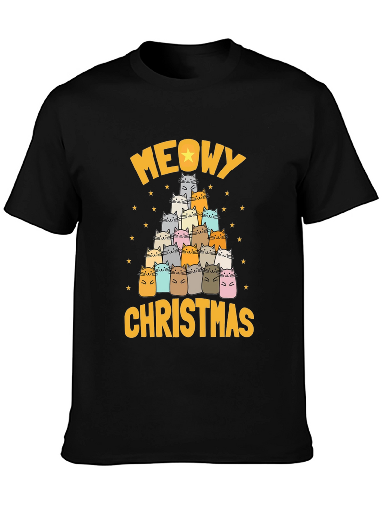 Spread holiday cheer with this playful 'Meowy Christmas' graphic tee! Featuring a whimsical Christmas tree design formed by stacked cartoon cats, this black t-shirt is perfect for cat lovers and holiday enthusiasts alike. The soft fabric ensures comfortable wear, while the vibrant yellow lettering and star accents add a festive touch. Ideal for casual holiday gatherings, cozy nights in, or as a fun gift. Get ready to celebrate the season with feline flair in this unique and eye-catching shirt!