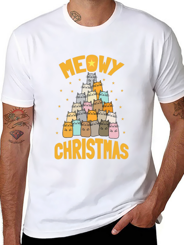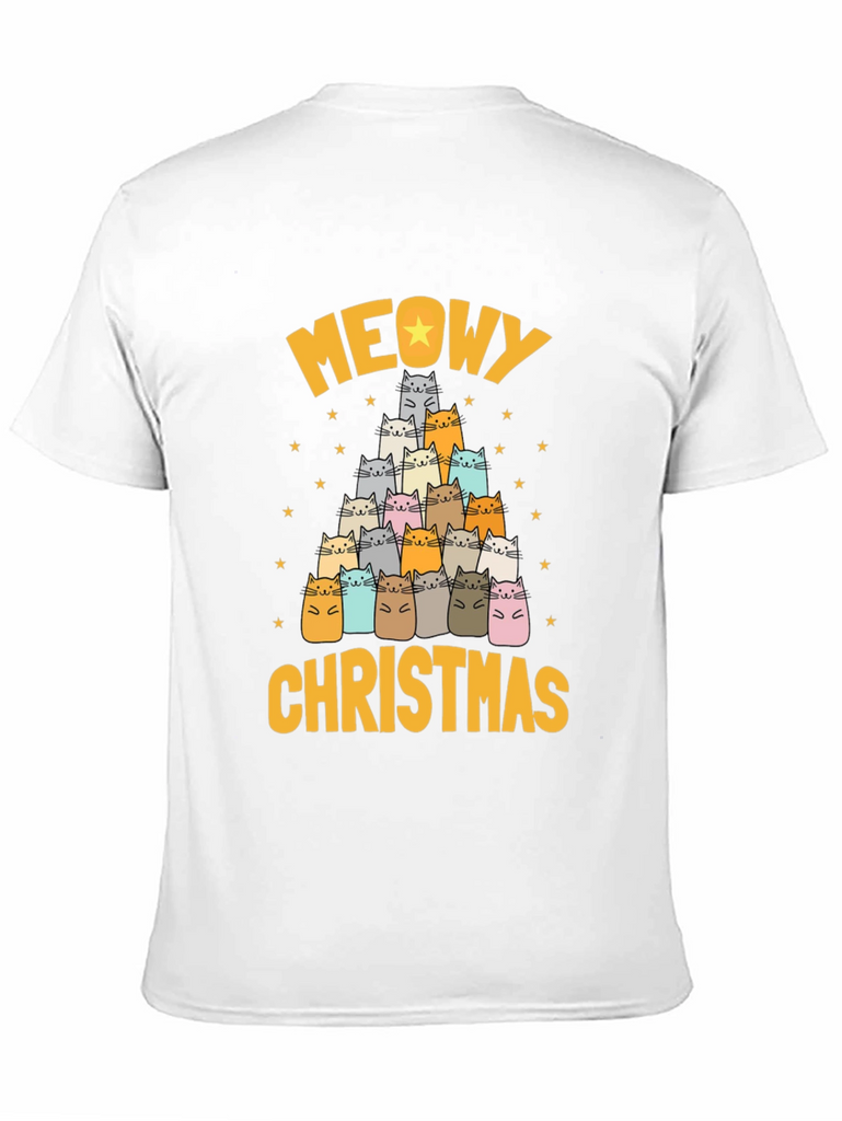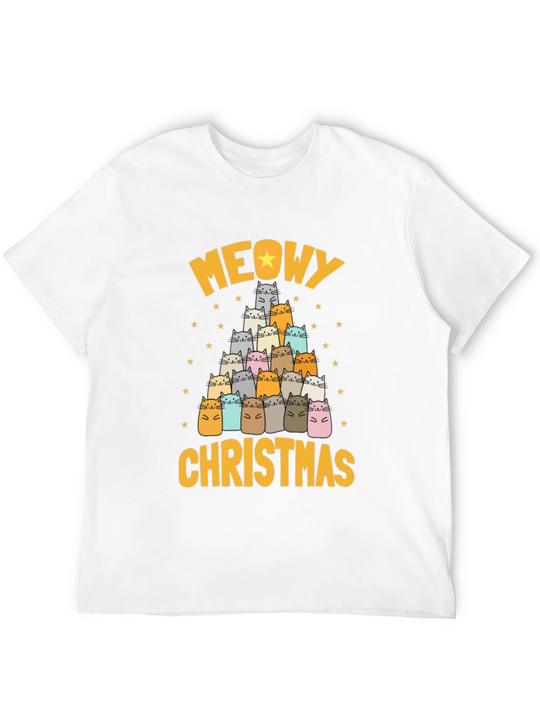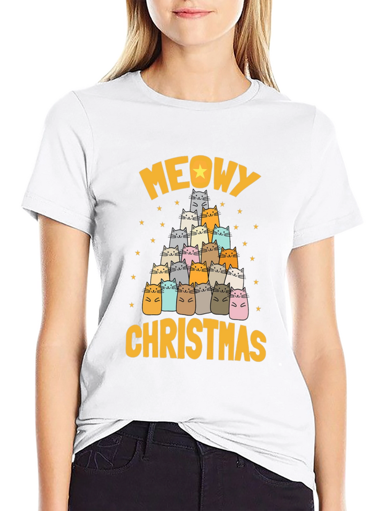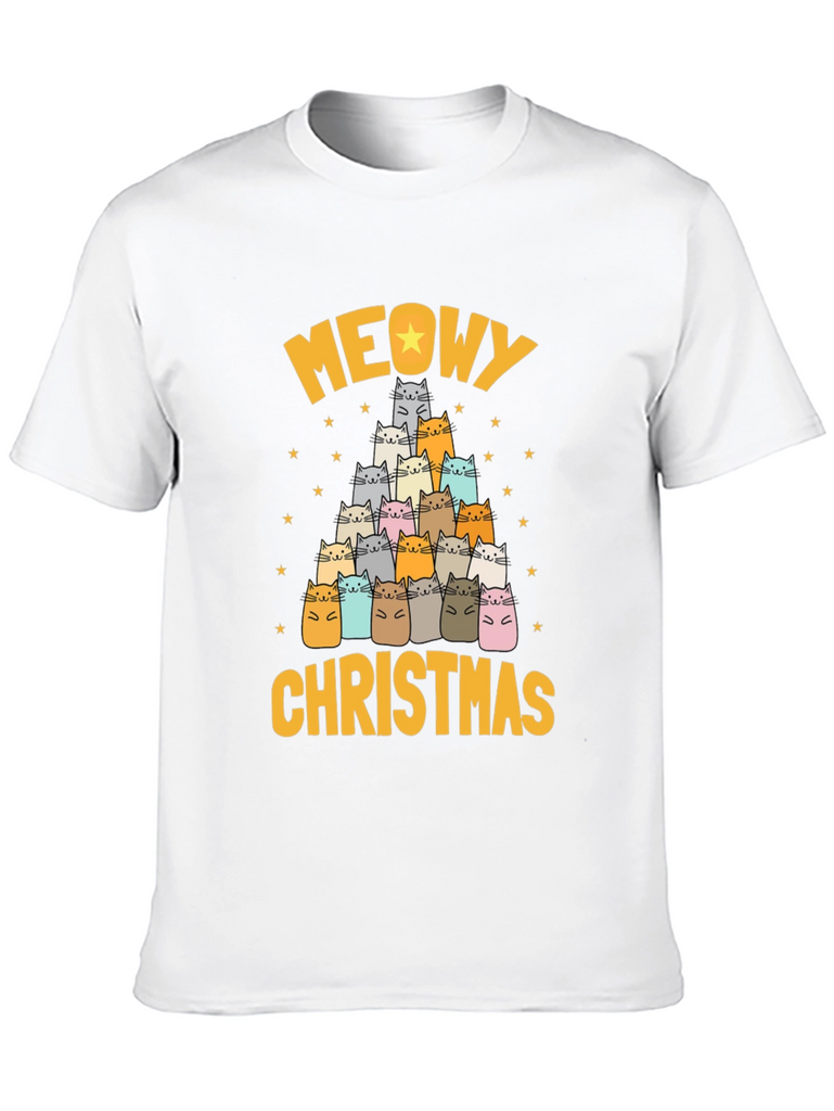 Spread holiday cheer with this playful 'Meowy Christmas' graphic tee! Featuring a whimsical Christmas tree design formed by stacked cartoon cats, this black t-shirt is perfect for cat lovers and holiday enthusiasts alike. The soft fabric ensures comfortable wear, while the vibrant yellow lettering and star accents add a festive touch. Ideal for casual holiday gatherings, cozy nights in, or as a fun gift. Get ready to celebrate the season with feline flair in this unique and eye-catching shirt!