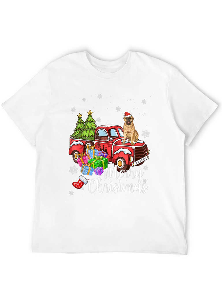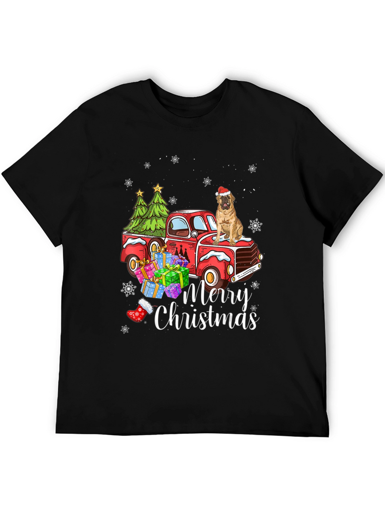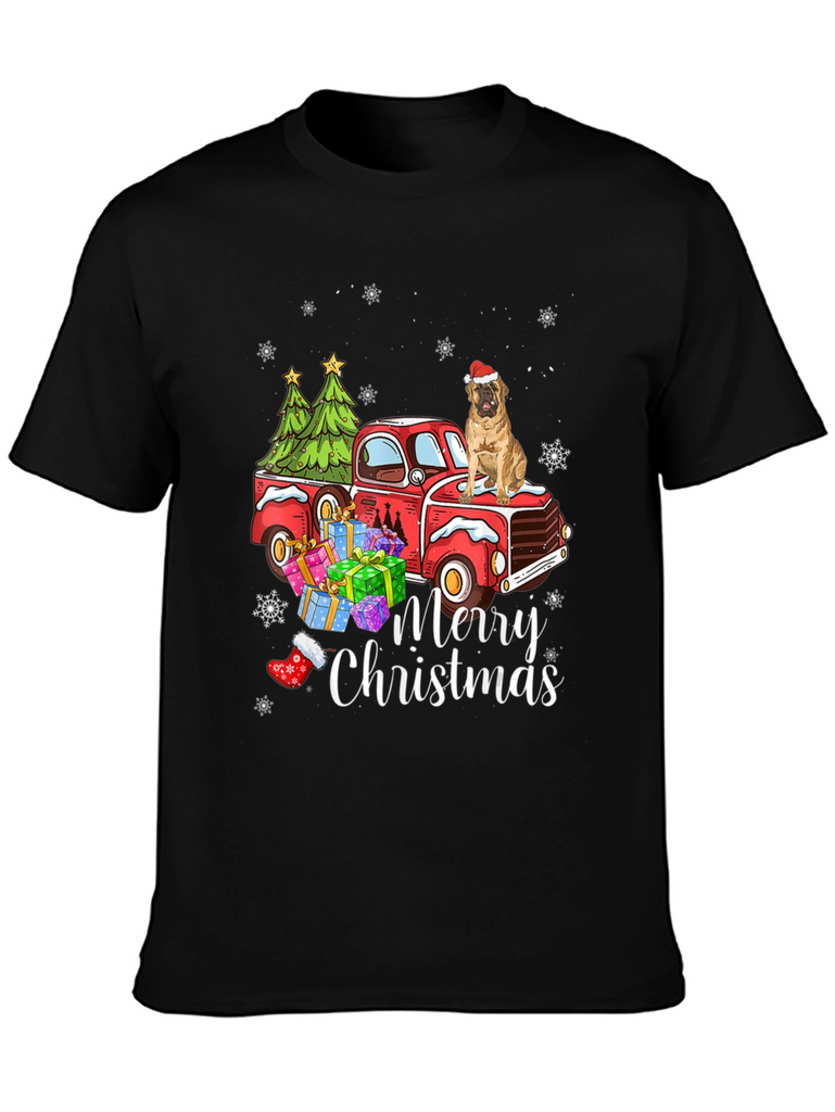 Celebrate the holidays in style with this festive graphic t-shirt. Featuring a red vintage pickup truck adorned with Christmas trees, a cute dog wearing a Santa hat, and a pile of colorful presents, this shirt is perfect for spreading holiday cheer. The design is printed on a black, short-sleeved t-shirt. Made from a comfortable and breathable fabric, it's ideal for casual wear during Christmas gatherings, family photos, or just relaxing at home. Show off your love for dogs and the holiday season with this unique and eye-catching tee. Get yours now and make this Christmas even more special!