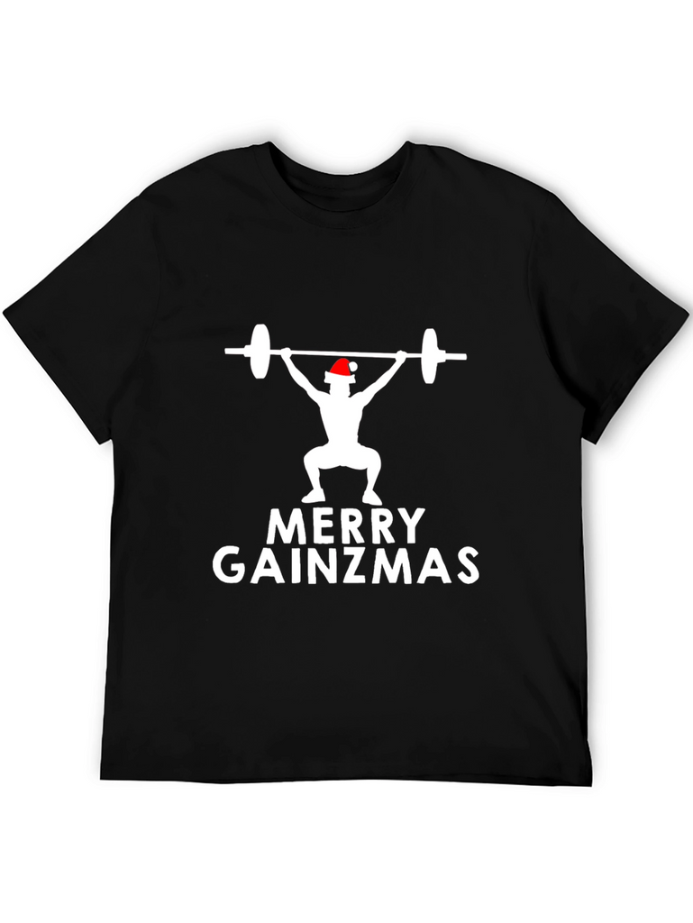Celebrate the holidays with this unique "Merry Gainzmas" t-shirt! This black tee features a white graphic of a weightlifter wearing a Santa hat, lifting a barbell, along with the playful text "Merry Gainzmas". The design is perfect for fitness enthusiasts, weightlifters, and anyone with a sense of humor during the Christmas season. Made from comfortable material, this shirt is ideal for wearing to the gym, holiday parties, or just around town to spread some festive cheer. Show off your love for fitness and the holiday spirit with this eye-catching t-shirt.