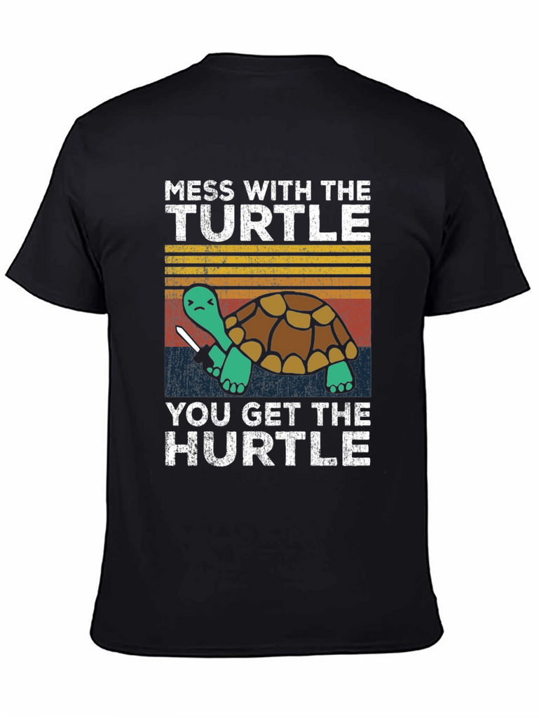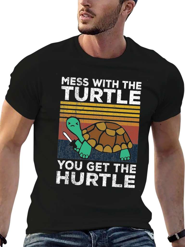 Show off your love for turtles with this unique and humorous t-shirt! The design features a cartoon turtle, with text that reads, "Mess with the Turtle, You Get the Hurtle." The shirt is black and made of what appears to be comfortable cotton. The eye-catching graphic is printed across the front, ensuring it's a conversation starter. Perfect for casual wear, animal lovers, or anyone with a fun sense of humor. Get yours today and let the world know you're a turtle enthusiast with a playful side!
