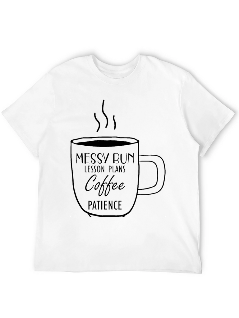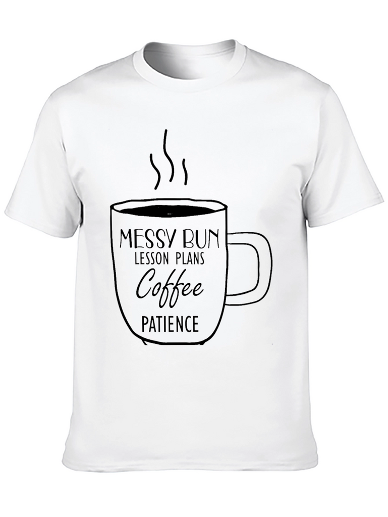 Show off your teacher pride with this stylish black graphic tee! Featuring a coffee cup design with the words "Messy Bun, Lesson Plans, Coffee, Patience," this shirt perfectly captures the essence of a teacher's daily life. The classic black color makes it versatile for pairing with jeans, shorts, or leggings. Made from a comfortable material, this tee is ideal for wearing to school, casual outings, or just lounging at home. A must-have for any teacher who loves coffee and keeping it real! Get yours today and make a statement.