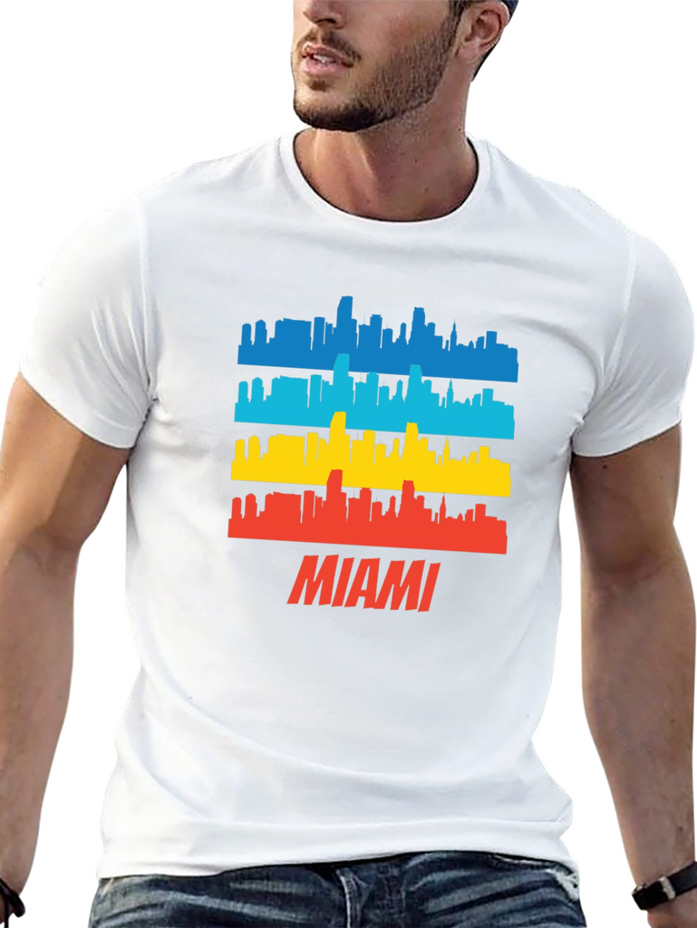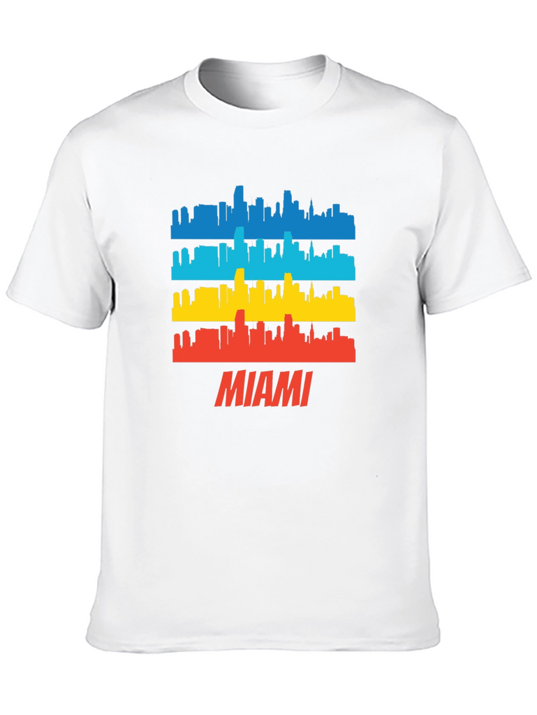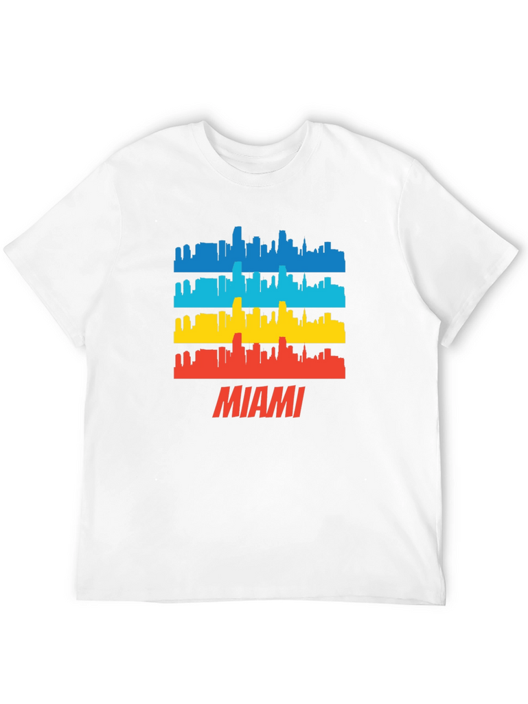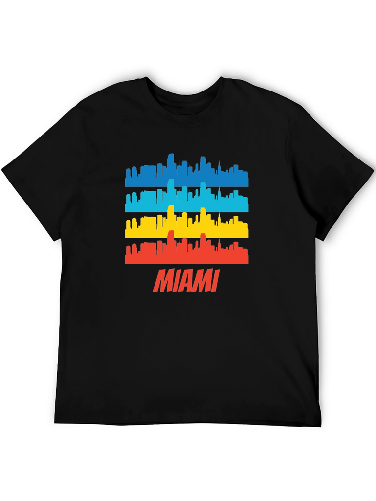 Show off your love for the Magic City with this stylish Miami Skyline T-Shirt. Featuring a vibrant, layered cityscape design in blue, cyan, yellow, and red, this black tee is a bold statement piece. The word "MIAMI" is prominently displayed below the skyline graphic. Made from comfortable, breathable fabric, this shirt is perfect for everyday wear, whether you're strolling down South Beach or just hanging out with friends. It's a great way to represent your favorite city in a cool, contemporary style. A must-have for Miami natives and visitors alike!
