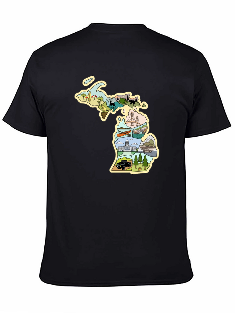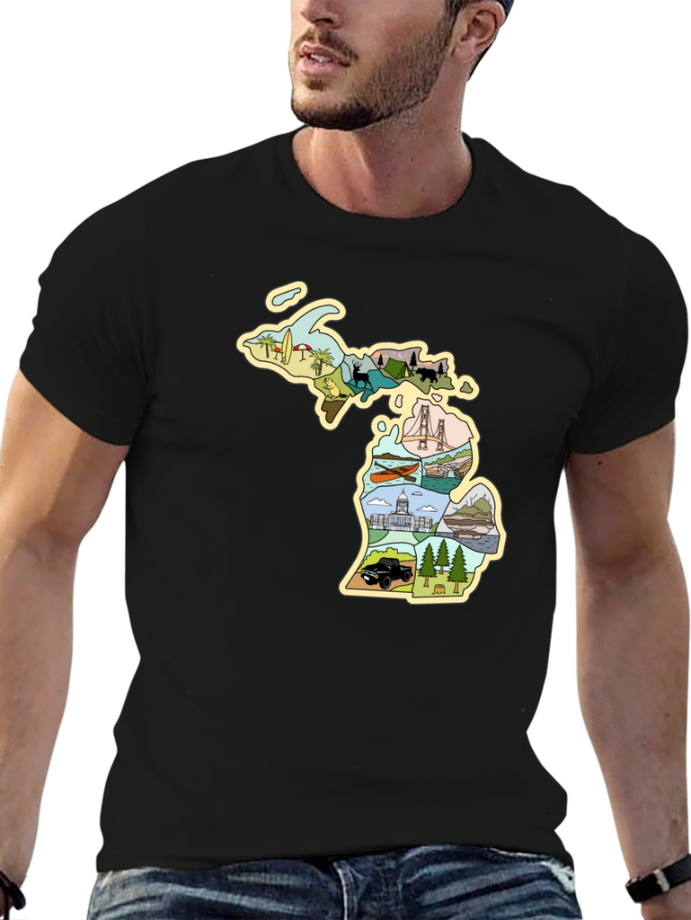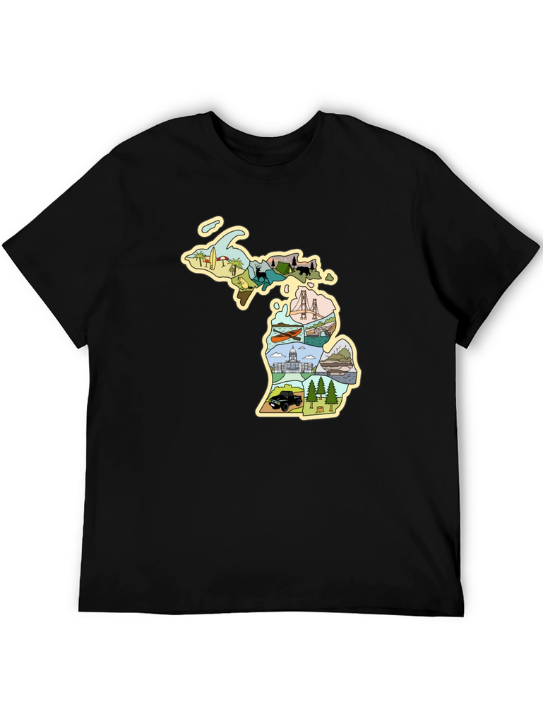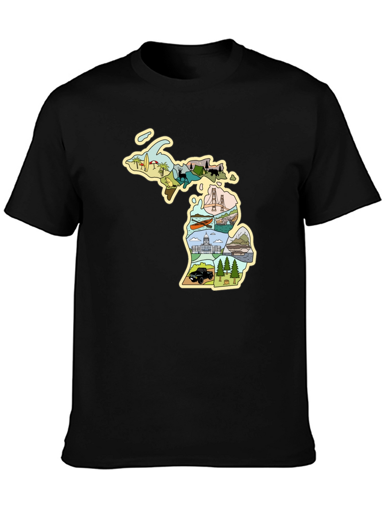 Show your love for the Great Lakes State with this unique graphic t-shirt! The design features the outline of Michigan, filled with iconic state symbols, attractions, and wildlife. From beaches and forests, to landmarks, this tee beautifully captures the essence of Michigan. Made from a comfortable, soft cotton blend, this black t-shirt is perfect for casual wear and showcasing your Michigan pride. The vibrant graphic makes it a standout piece. This eye-catching tee is ideal for everyday wear, road trips, or as a gift for any Michigan enthusiast. A must-have for any Michigander!