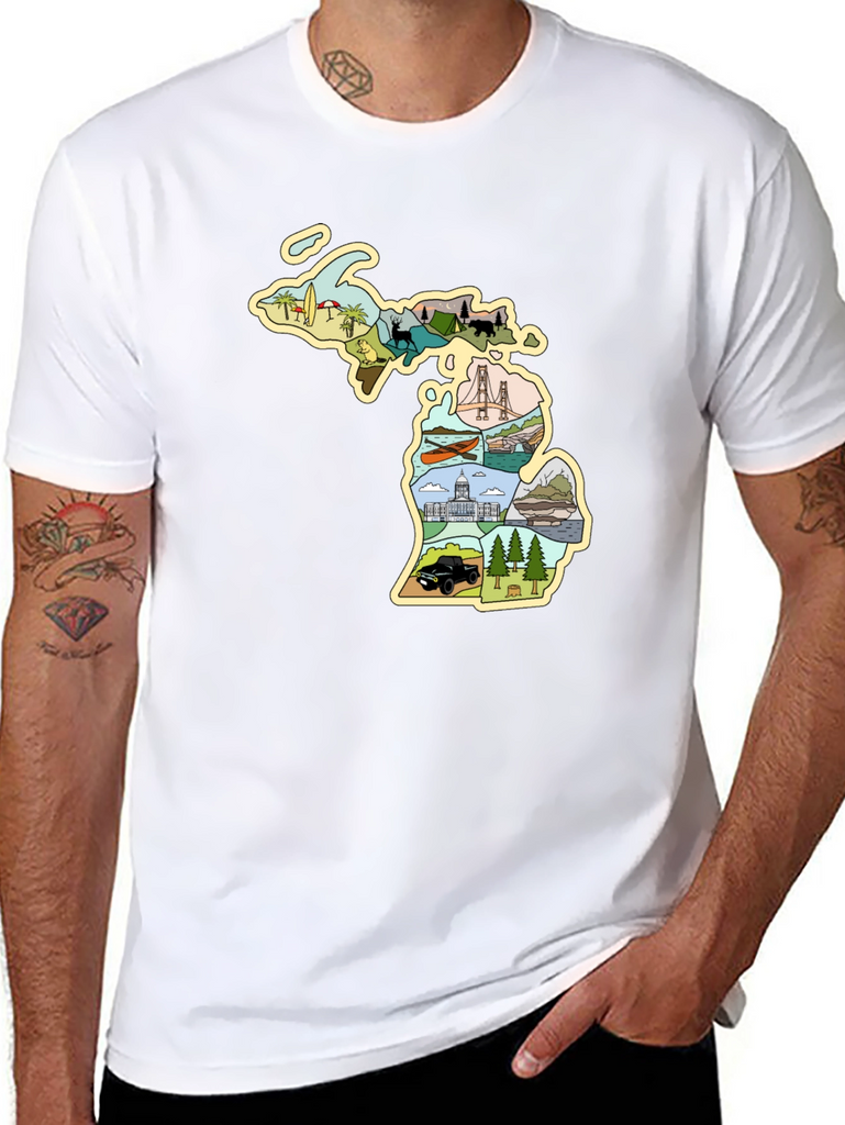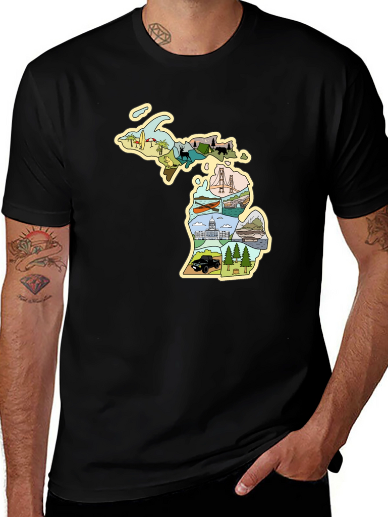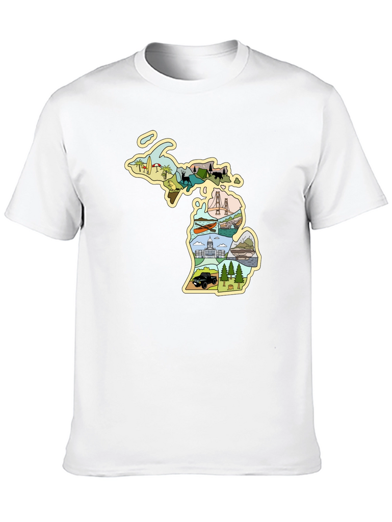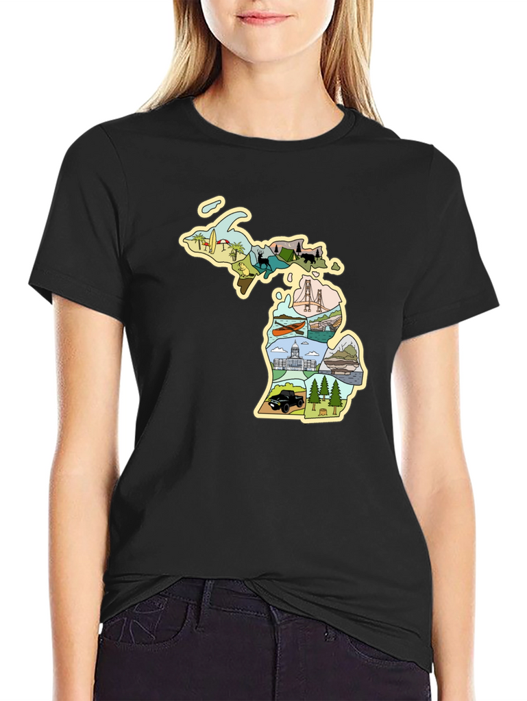 Show your love for the Great Lakes State with this unique graphic t-shirt! The design features the outline of Michigan, filled with iconic state symbols, attractions, and wildlife. From beaches and forests, to landmarks, this tee beautifully captures the essence of Michigan. Made from a comfortable, soft cotton blend, this black t-shirt is perfect for casual wear and showcasing your Michigan pride. The vibrant graphic makes it a standout piece. This eye-catching tee is ideal for everyday wear, road trips, or as a gift for any Michigan enthusiast. A must-have for any Michigander!