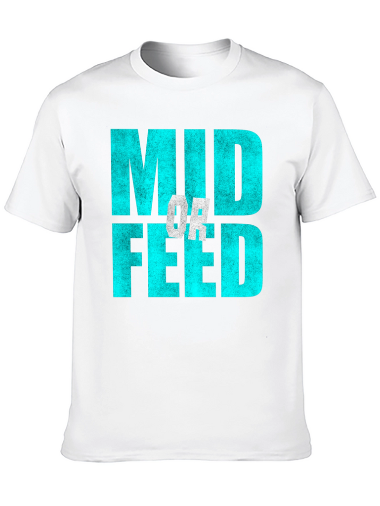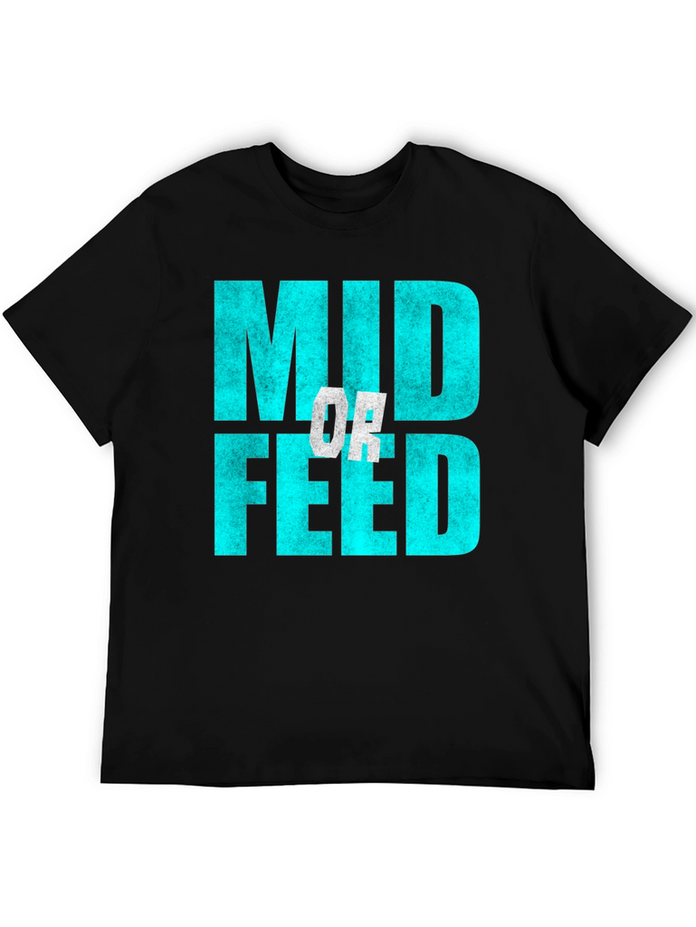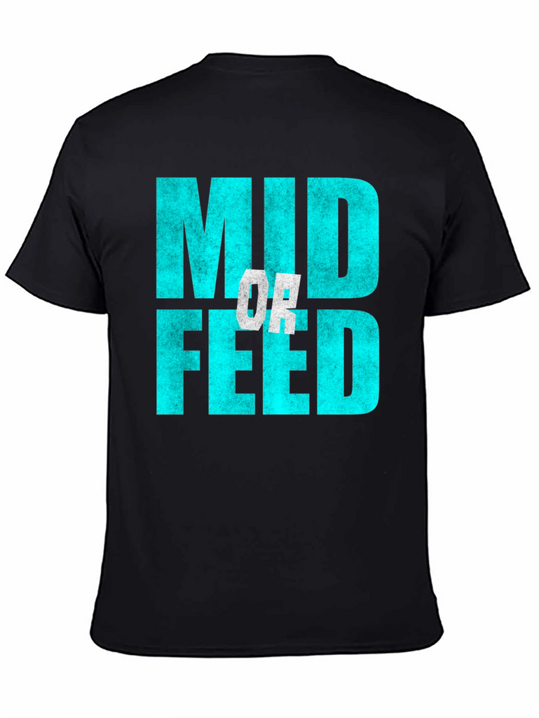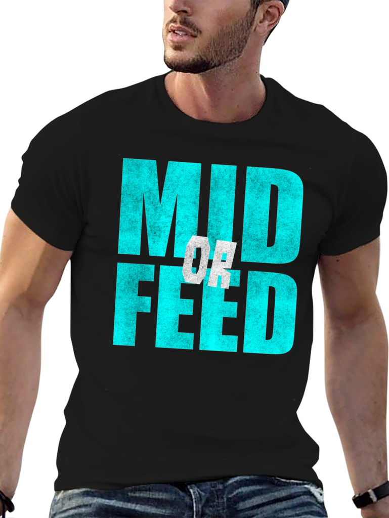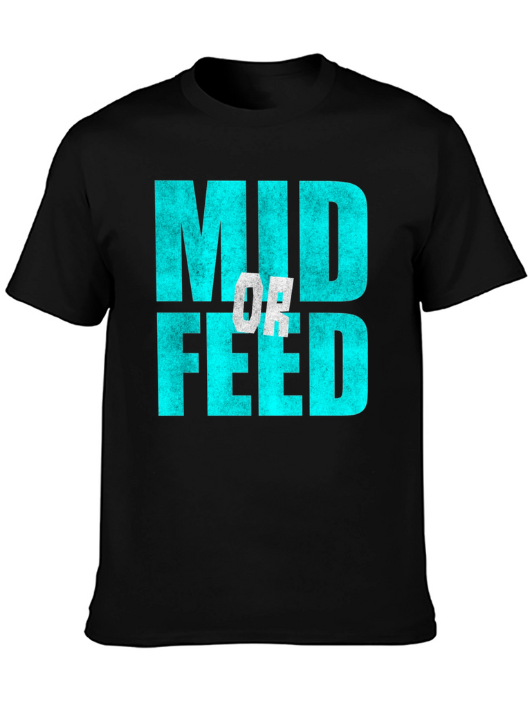 This stylish black t-shirt features a bold, eye-catching design with the phrase "MID OR FEED" in distressed teal and white lettering. Made from a comfortable-looking cotton blend, this tee is perfect for gamers and esports enthusiasts. The relaxed fit makes it ideal for everyday wear, whether you're gaming at home, hanging out with friends, or attending a gaming event. Show off your passion for gaming with this unique and trendy t-shirt. It's a great conversation starter and a must-have for any serious gamer's wardrobe.