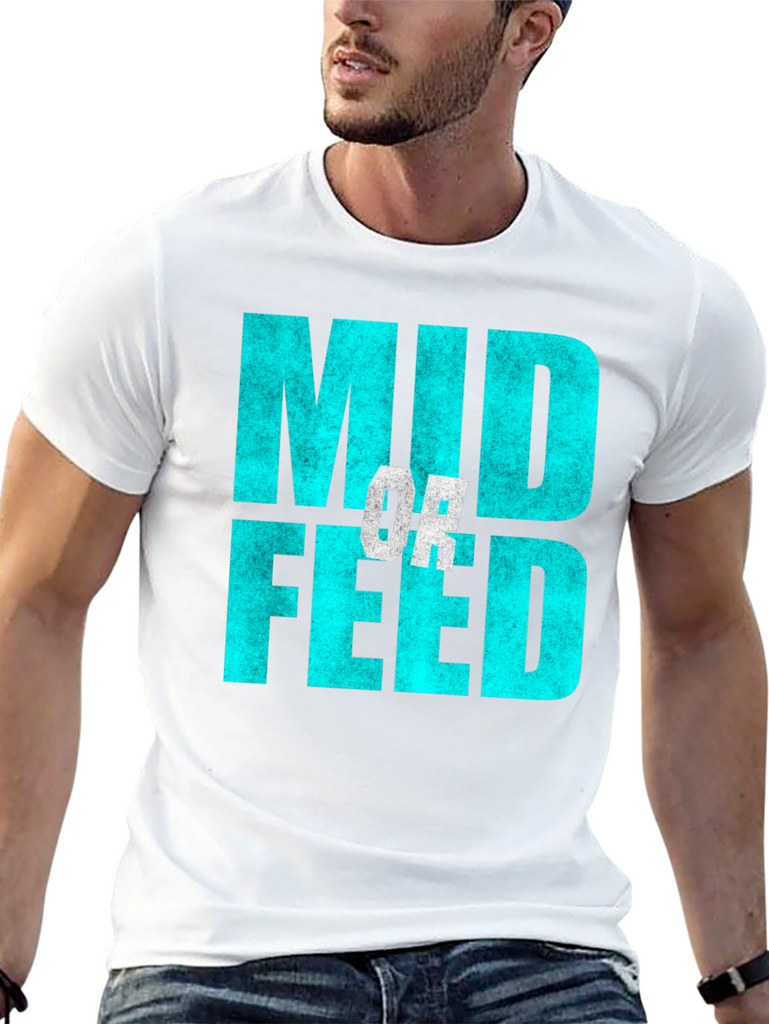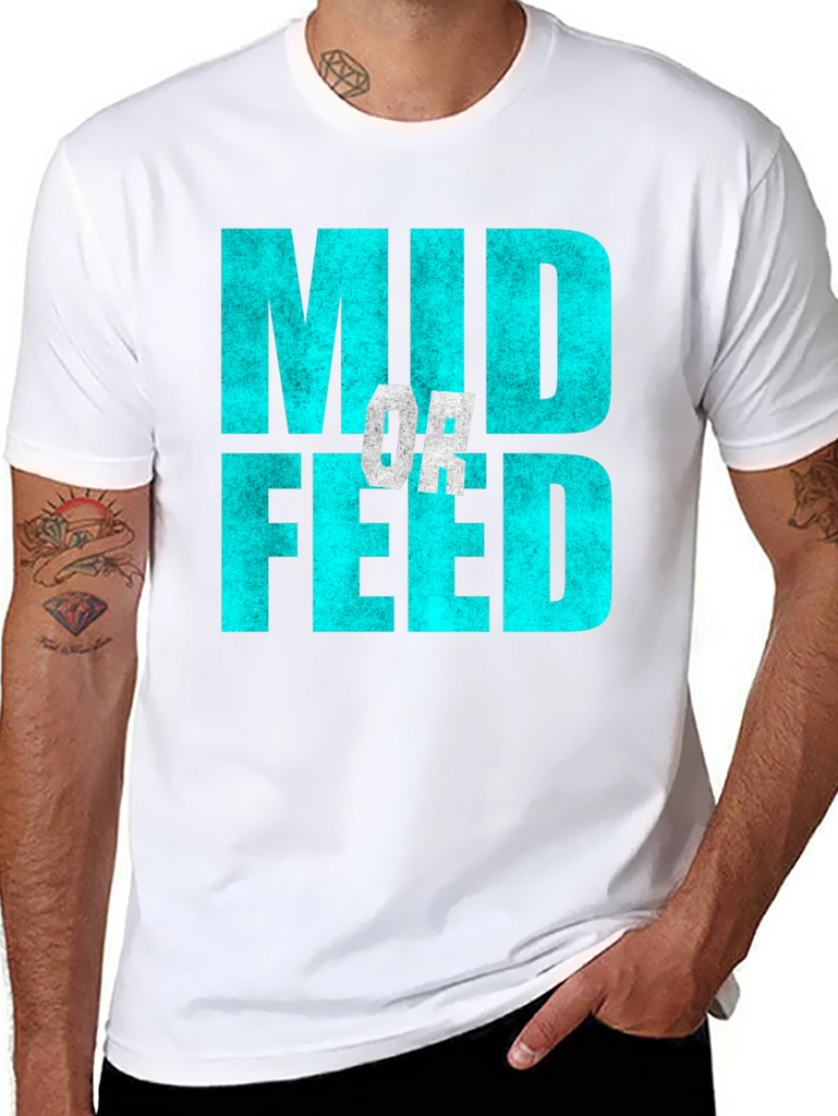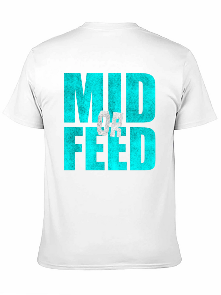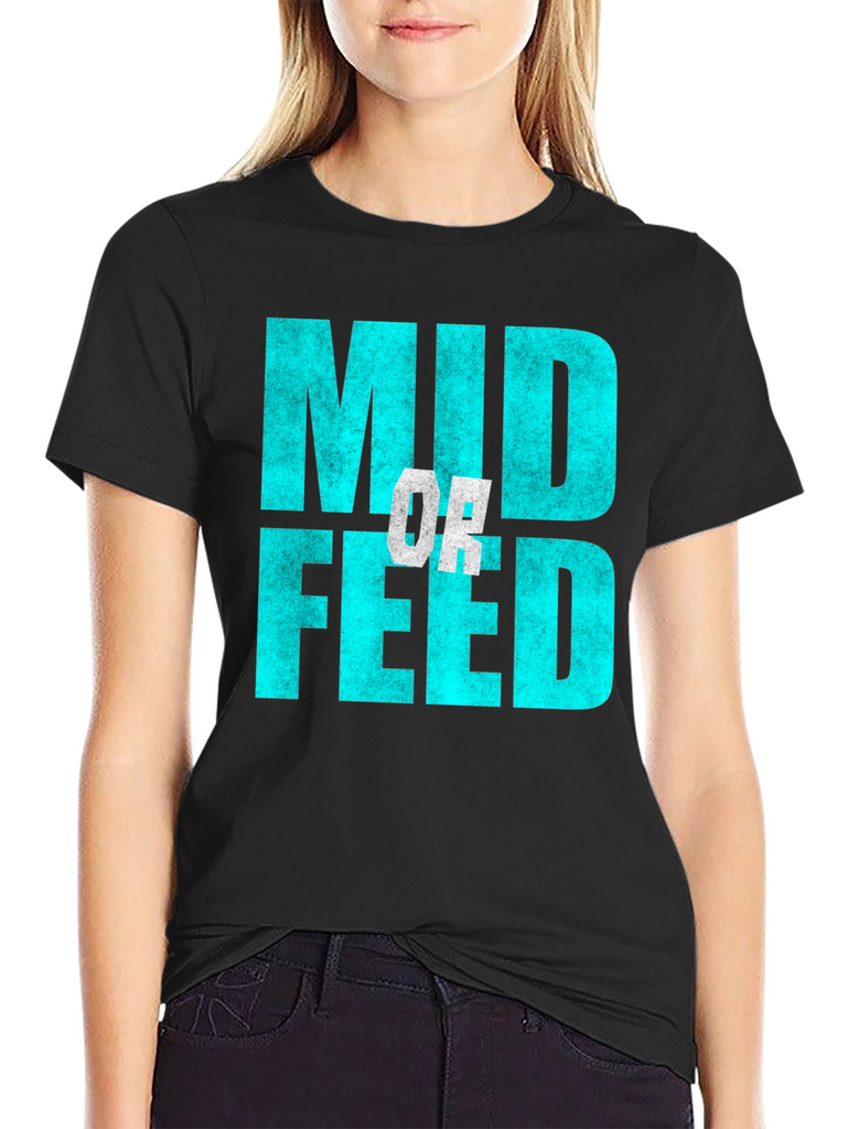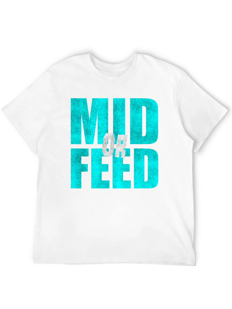 This stylish black t-shirt features a bold, eye-catching design with the phrase "MID OR FEED" in distressed teal and white lettering. Made from a comfortable-looking cotton blend, this tee is perfect for gamers and esports enthusiasts. The relaxed fit makes it ideal for everyday wear, whether you're gaming at home, hanging out with friends, or attending a gaming event. Show off your passion for gaming with this unique and trendy t-shirt. It's a great conversation starter and a must-have for any serious gamer's wardrobe.