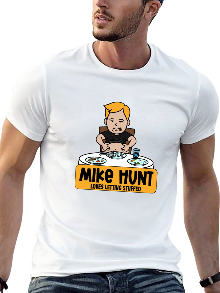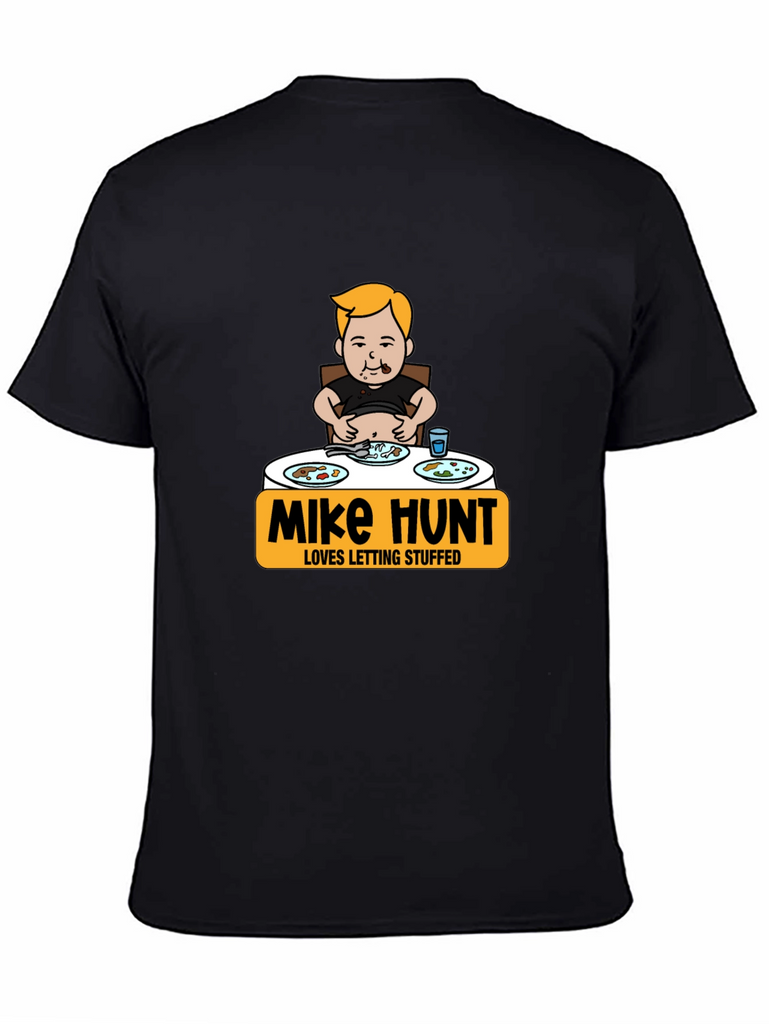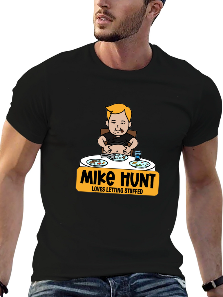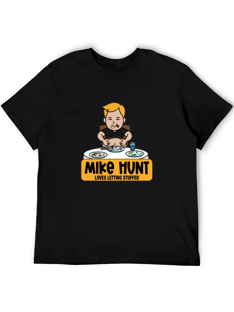 Showcase your sense of humor with this eye-catching black T-shirt. The design features a cartoon graphic of a man seated at a table enjoying a feast. Above the graphic is the name "Mike Hunt" and beneath it, the playful phrase "Loves Letting Stuffed." This unique T-shirt is made from a soft, comfortable material, perfect for casual wear. Its bold and amusing design is sure to spark conversations and bring a smile to anyone's face. Ideal for everyday use, parties, or as a gag gift, this T-shirt adds a touch of humor to any outfit.
