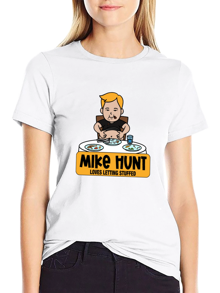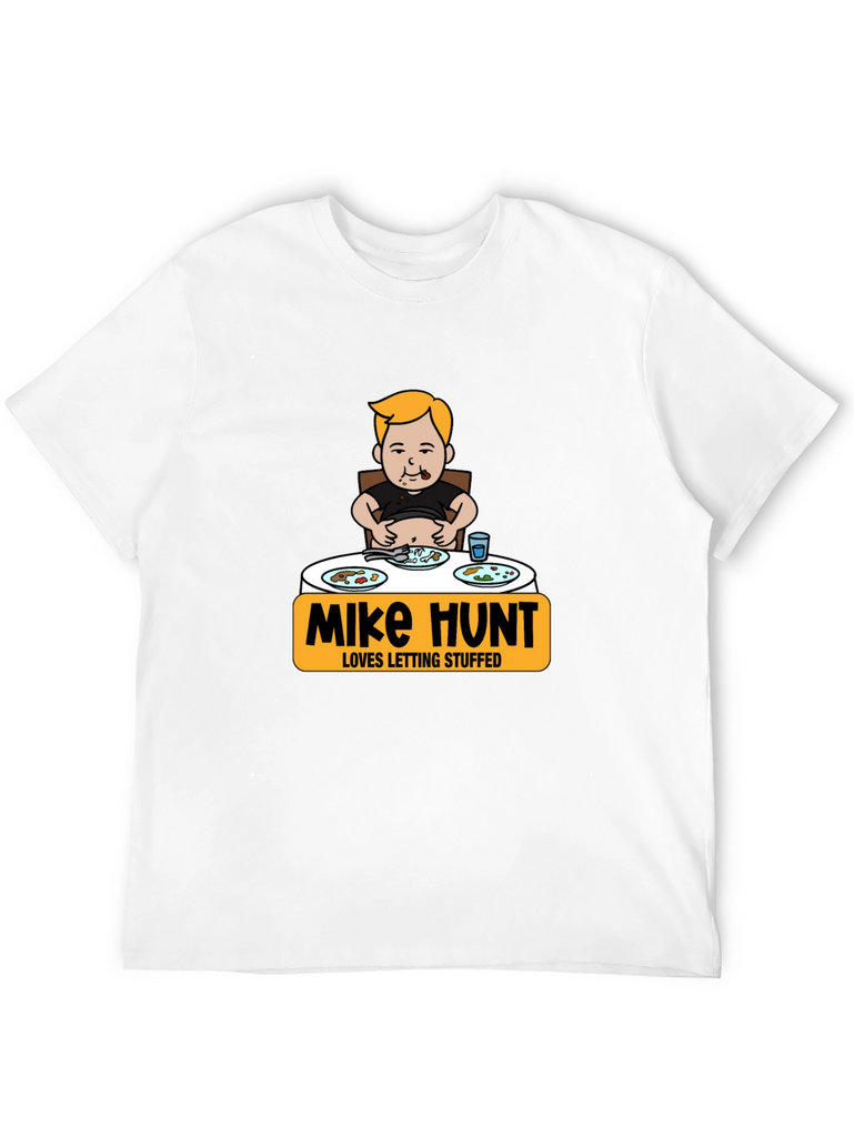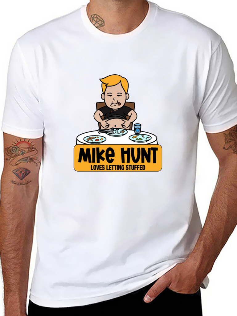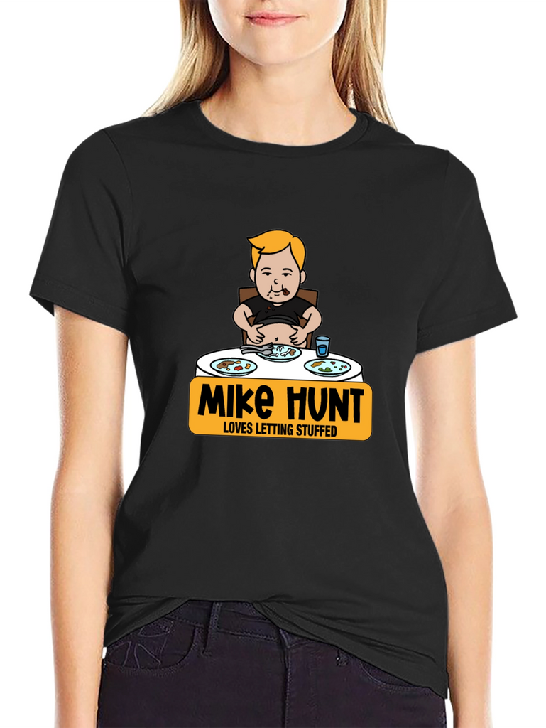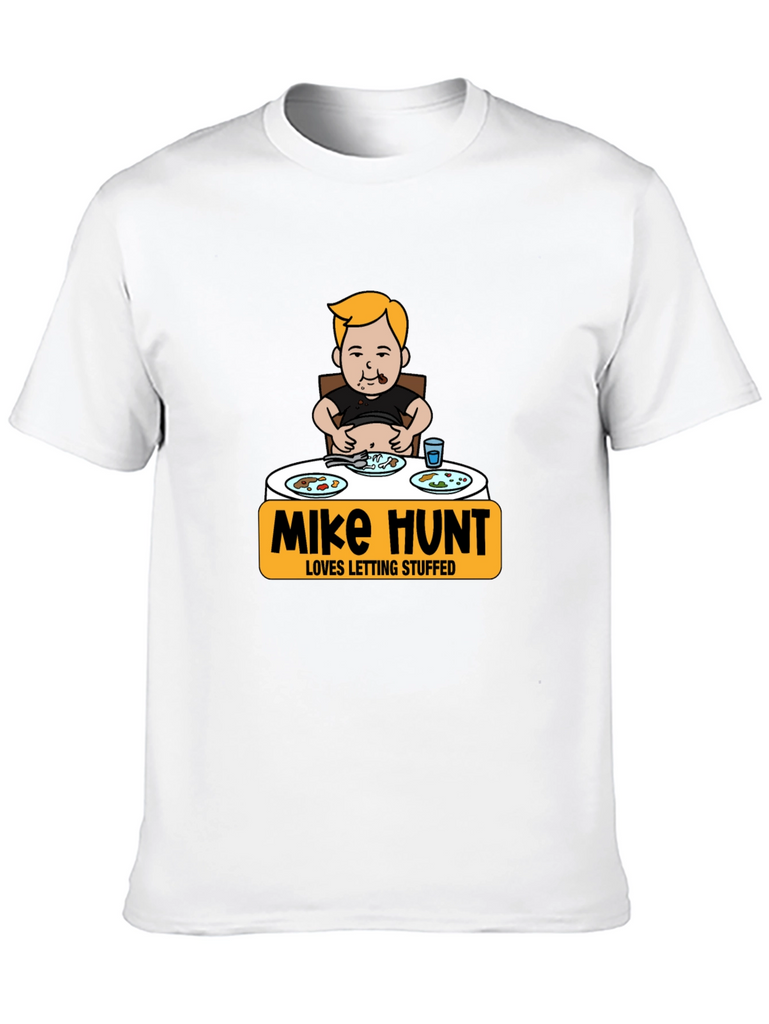 Showcase your sense of humor with this eye-catching black T-shirt. The design features a cartoon graphic of a man seated at a table enjoying a feast. Above the graphic is the name "Mike Hunt" and beneath it, the playful phrase "Loves Letting Stuffed." This unique T-shirt is made from a soft, comfortable material, perfect for casual wear. Its bold and amusing design is sure to spark conversations and bring a smile to anyone's face. Ideal for everyday use, parties, or as a gag gift, this T-shirt adds a touch of humor to any outfit.
