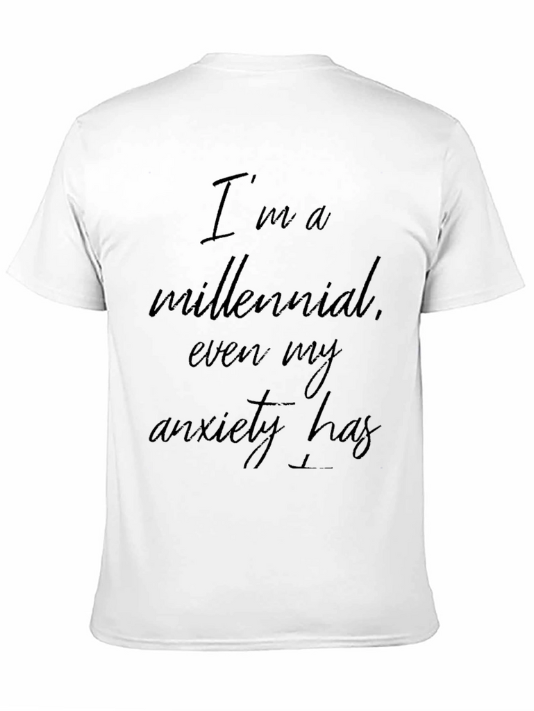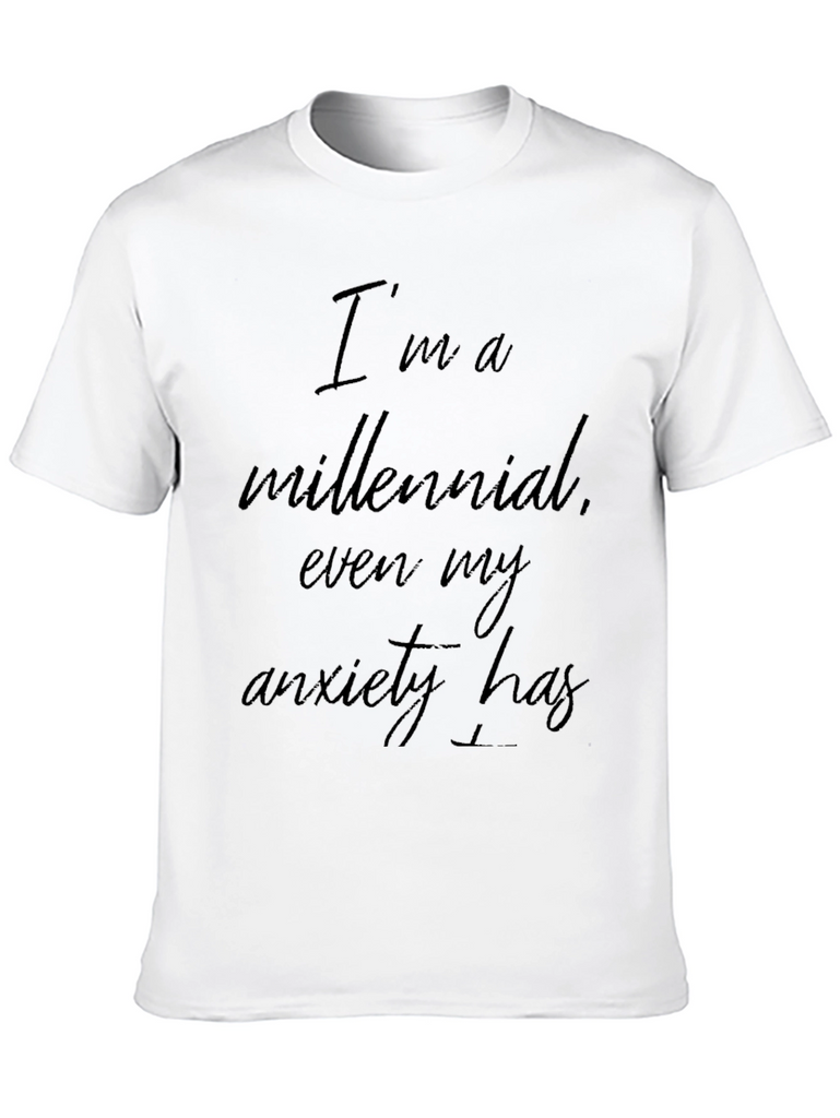 Embrace your inner millennial with this bold black t-shirt. The shirt features the phrase 'I'm a millennial, even my anxiety has...' in a stylish, subtle font. Perfect for casual wear, this tee combines comfort and a touch of humor. The classic fit and soft fabric make it an everyday staple, while the witty design ensures you'll stand out. Ideal for expressing your personality, this shirt is a must-have for millennials with a sense of humor. Get yours today and wear your millennial pride!