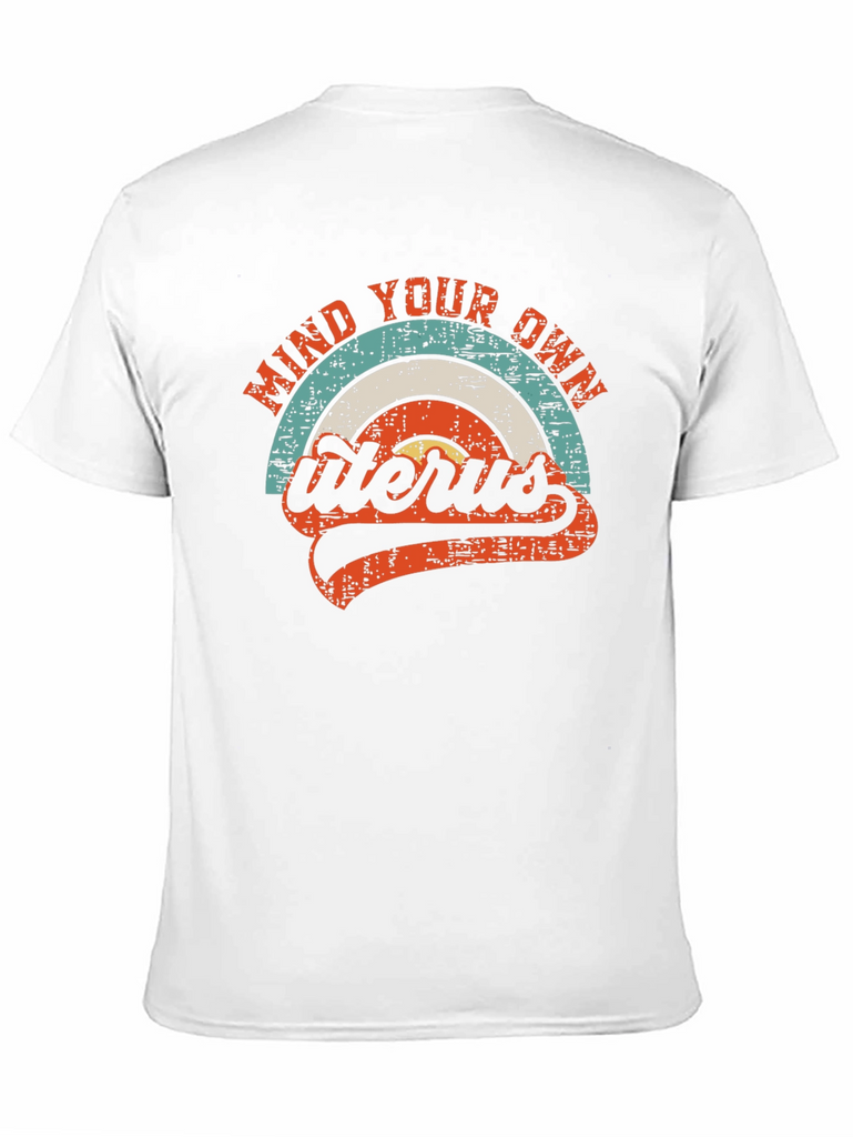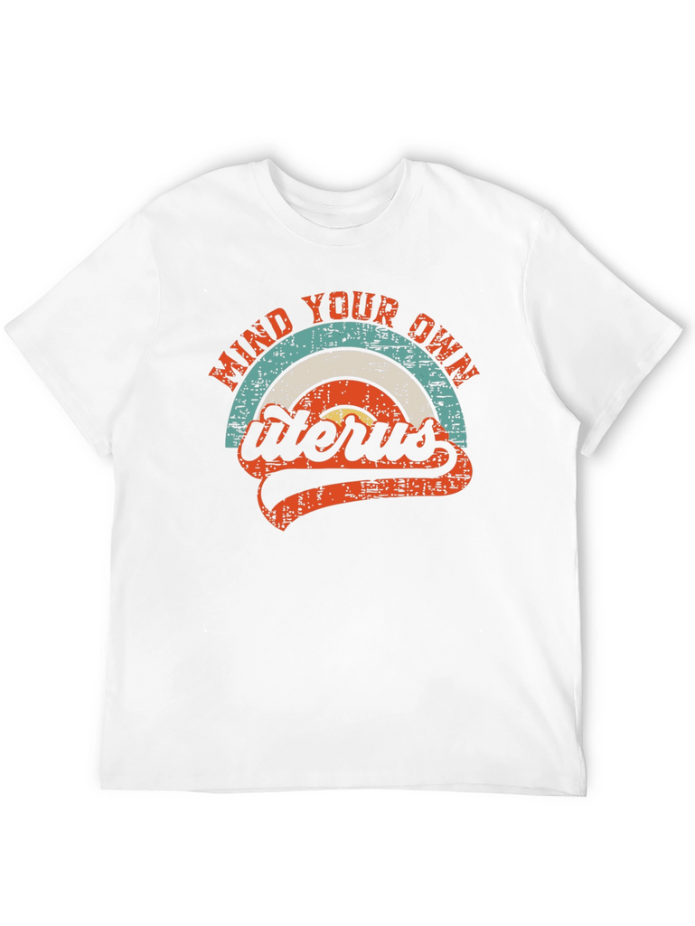Rock this vintage-inspired graphic tee! The black t-shirt features a retro design with the phrase "Mind Your Own Uterus" displayed in a curved, layered style with orange, beige and blue-green colors. The distressed effect adds a touch of nostalgia. Perfect for expressing your views and making a statement. Made from comfortable material, this tee is ideal for casual wear, rallies, or everyday activism. Pair it with jeans, shorts, or a skirt for a bold and empowering look!