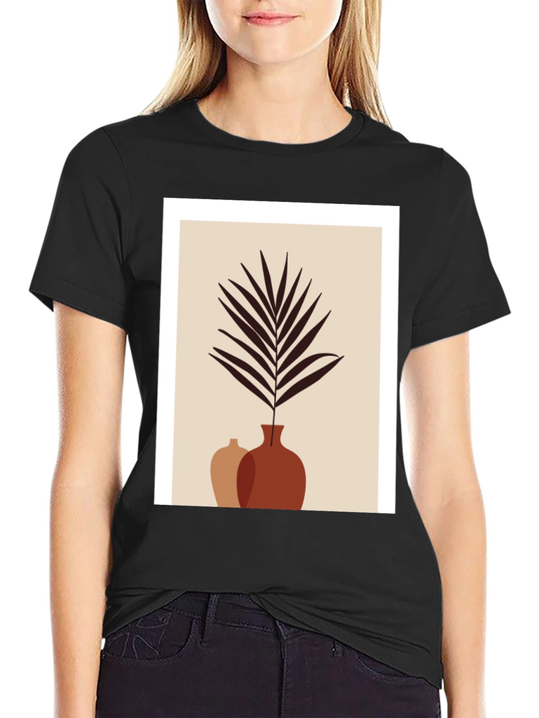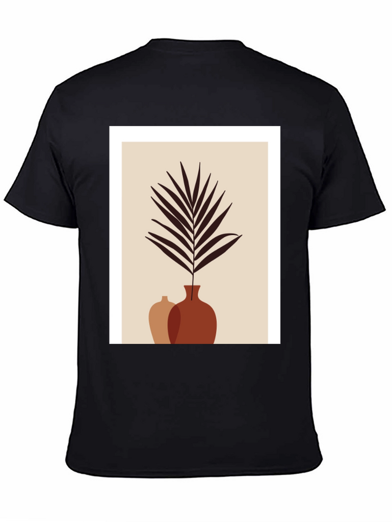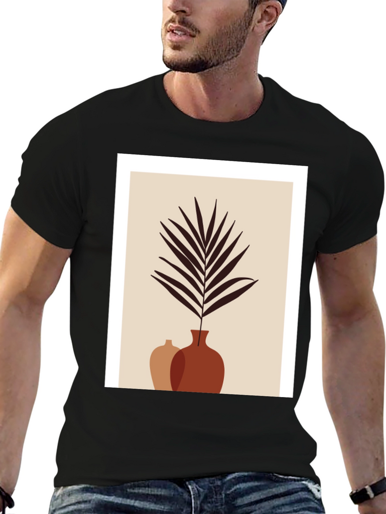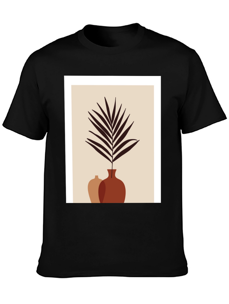 Showcase your love for modern design with this stylish black t-shirt. Featuring a minimalist print of a plant in vases, this tee offers a blend of comfort and artistic flair. The design includes a neutral background with two vases in brown tones and a dark leafy plant. Made from soft, breathable fabric, it's perfect for everyday wear. Pair it with jeans for a casual look or dress it up with a blazer for a more sophisticated outfit. Ideal for art lovers and those who appreciate minimalist aesthetics.