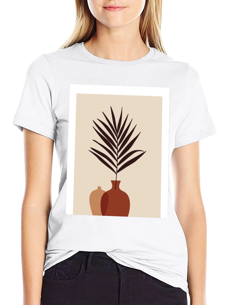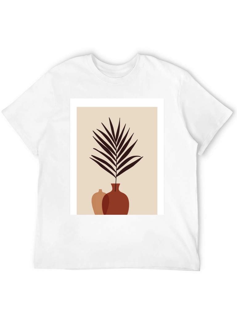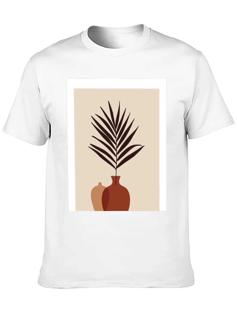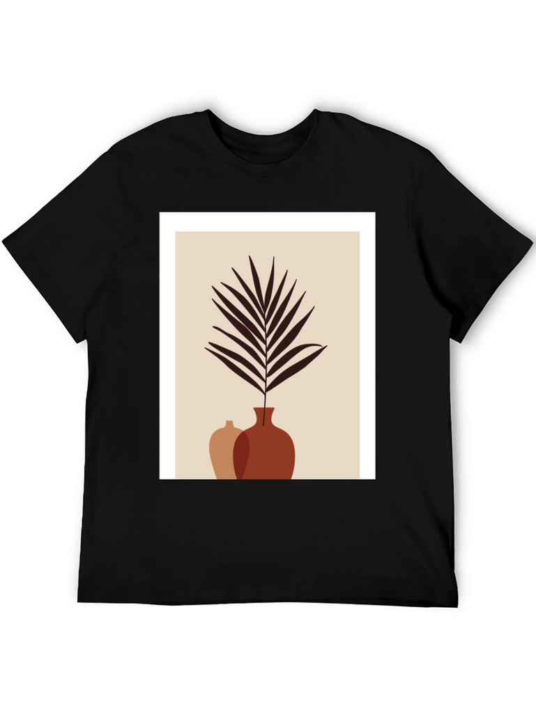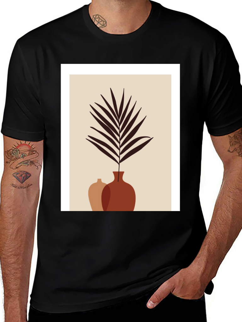 Showcase your love for modern design with this stylish black t-shirt. Featuring a minimalist print of a plant in vases, this tee offers a blend of comfort and artistic flair. The design includes a neutral background with two vases in brown tones and a dark leafy plant. Made from soft, breathable fabric, it's perfect for everyday wear. Pair it with jeans for a casual look or dress it up with a blazer for a more sophisticated outfit. Ideal for art lovers and those who appreciate minimalist aesthetics.