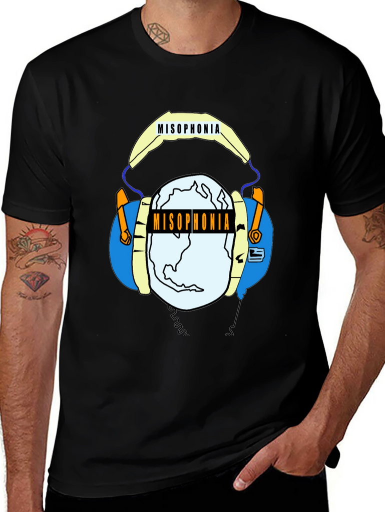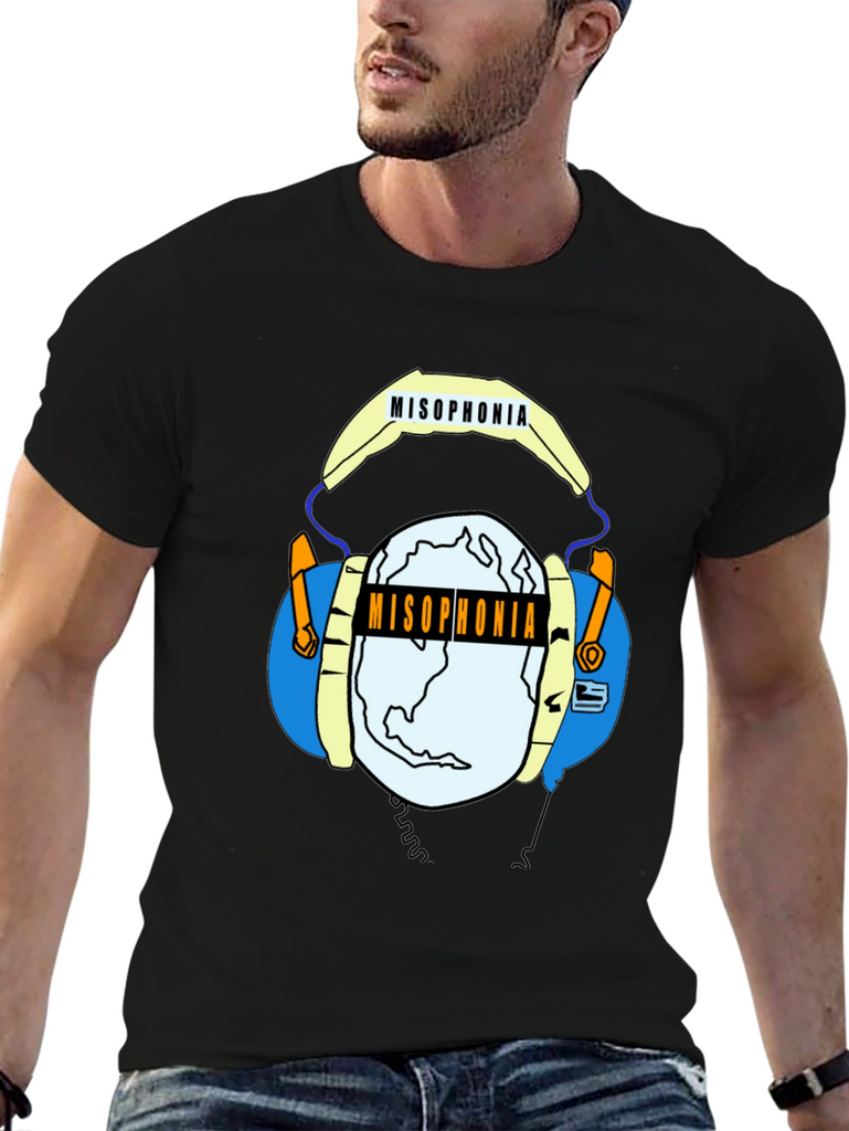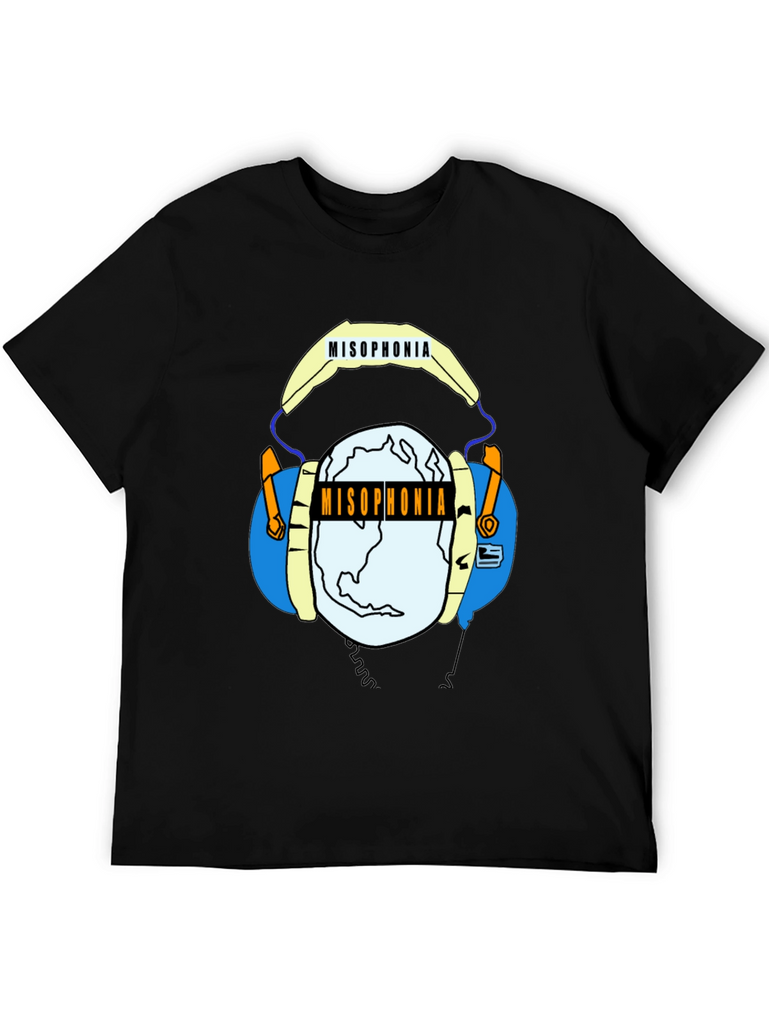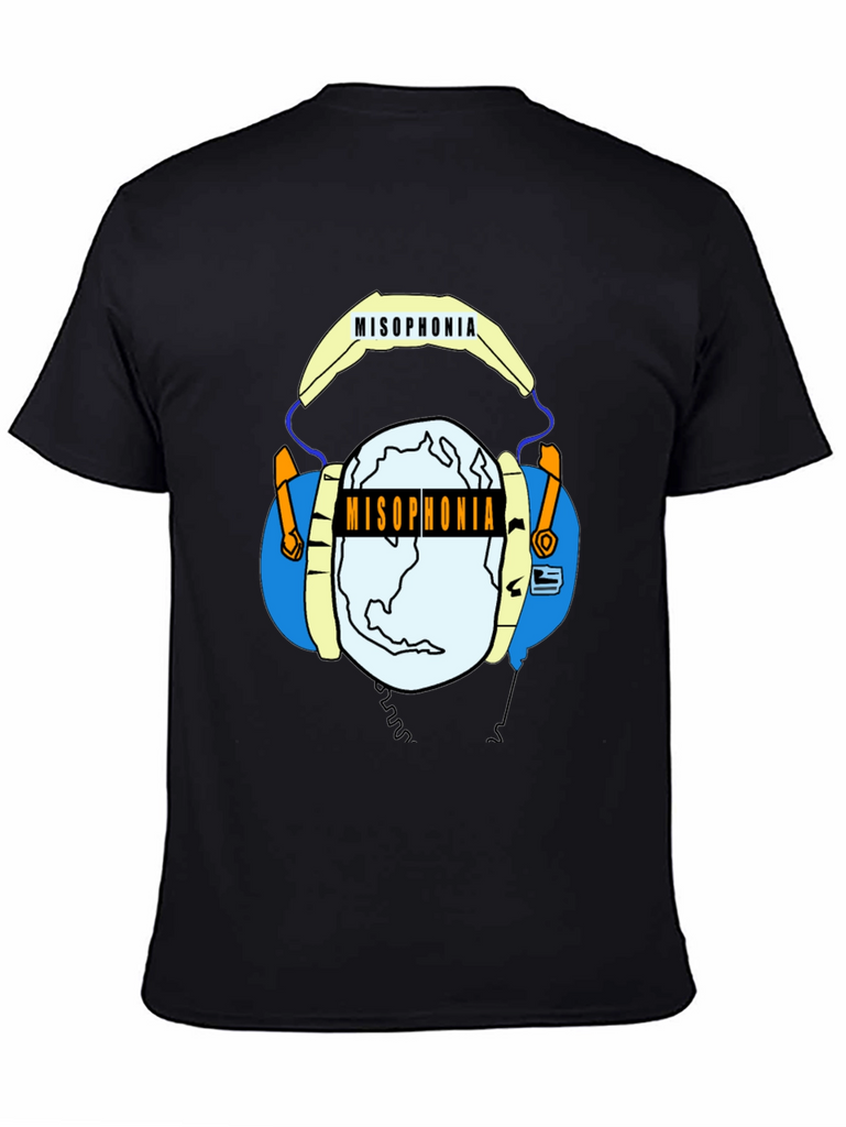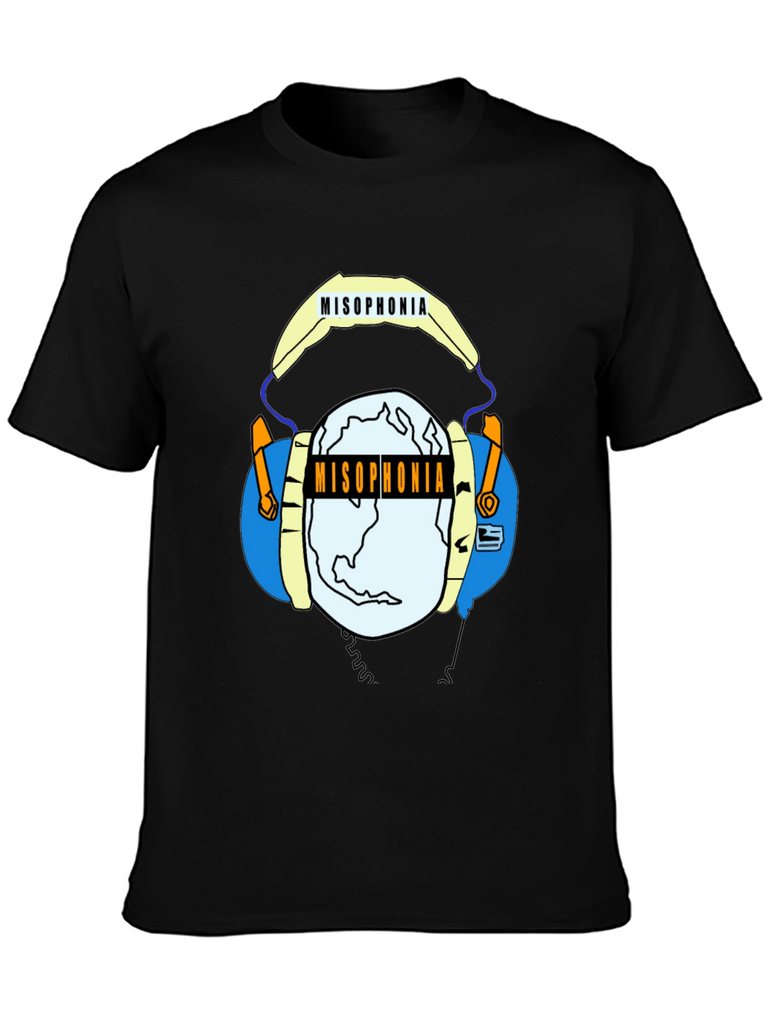This unique black t-shirt features a standout graphic design of headphones encompassing a world globe, prominently displaying the word "MISOPHONIA" both above and on the globe itself. Made from what appears to be a comfortable, breathable fabric, this crew neck tee offers a relaxed fit, perfect for casual wear. The bold design makes it a conversation starter, ideal for those with an interest in the topic or simply a love for eye-catching graphics. Wear it to social gatherings, concerts, or just around town to showcase your distinctive style and interests.