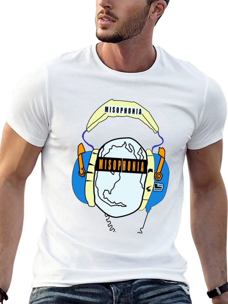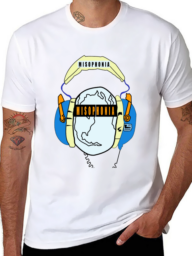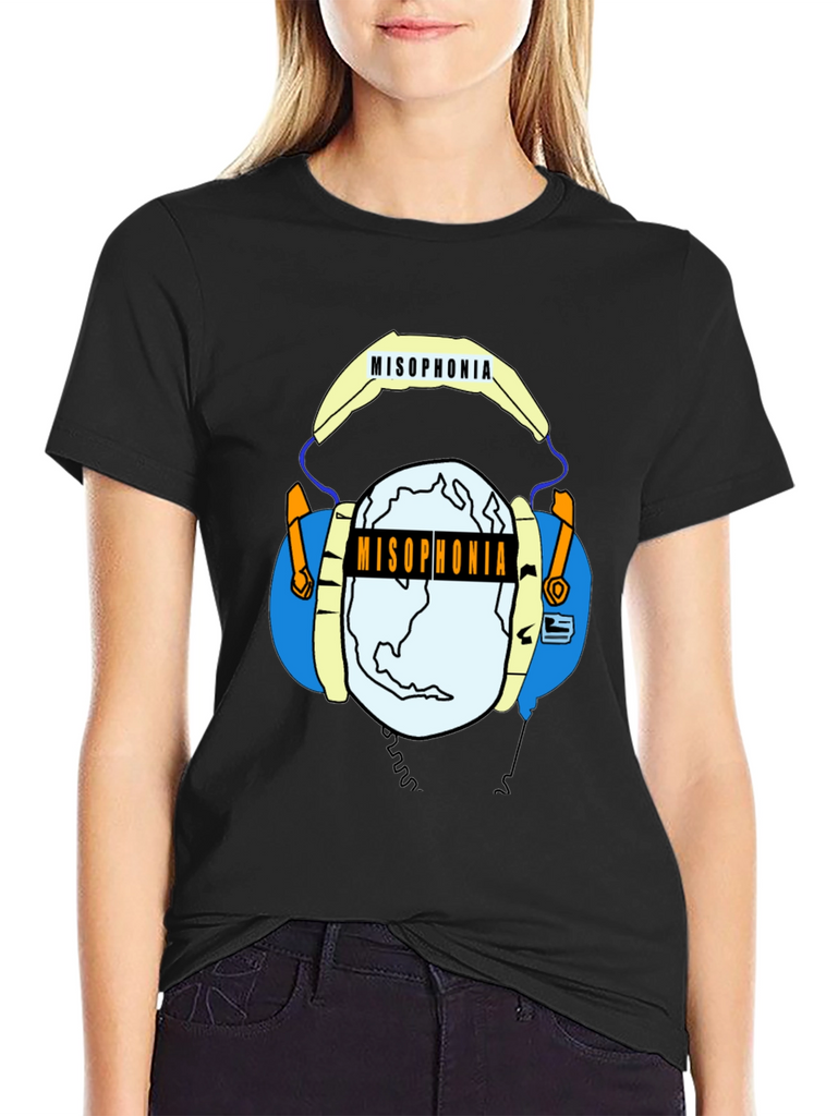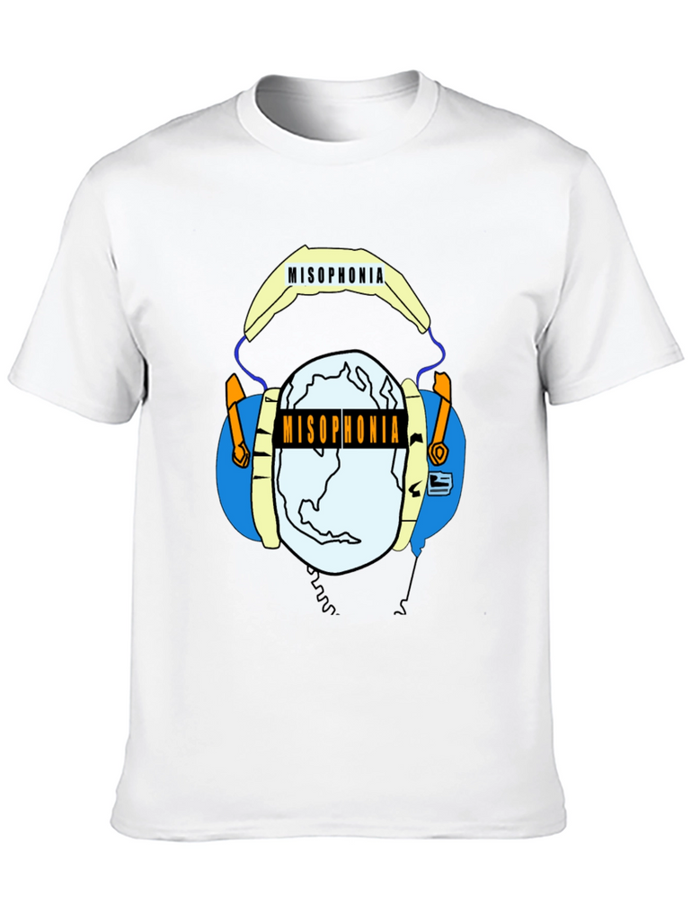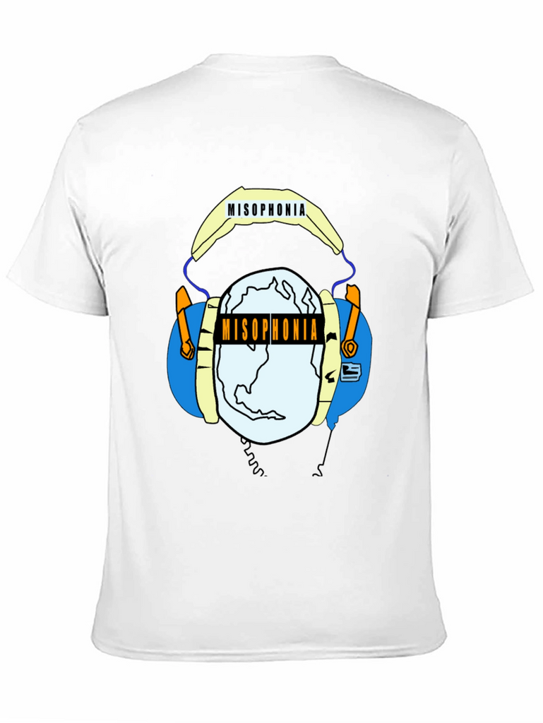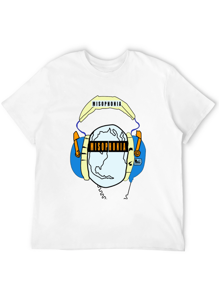 This unique black t-shirt features a standout graphic design of headphones encompassing a world globe, prominently displaying the word "MISOPHONIA" both above and on the globe itself. Made from what appears to be a comfortable, breathable fabric, this crew neck tee offers a relaxed fit, perfect for casual wear. The bold design makes it a conversation starter, ideal for those with an interest in the topic or simply a love for eye-catching graphics. Wear it to social gatherings, concerts, or just around town to showcase your distinctive style and interests.