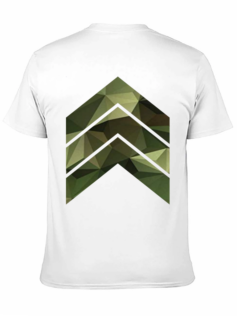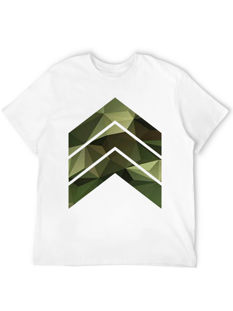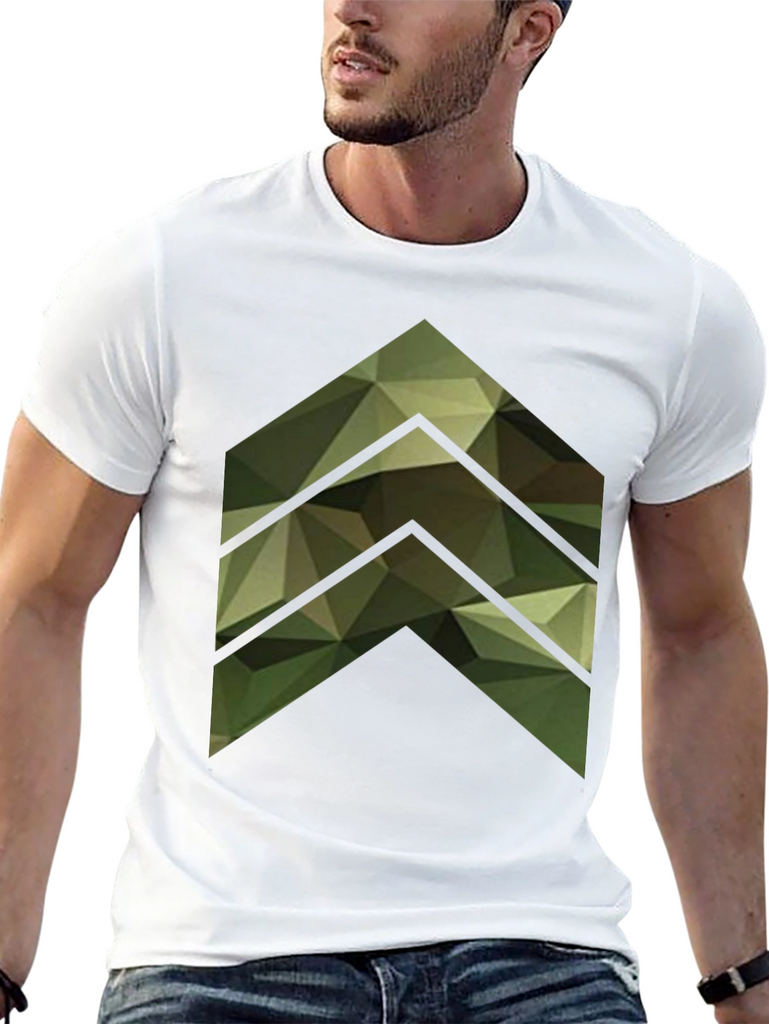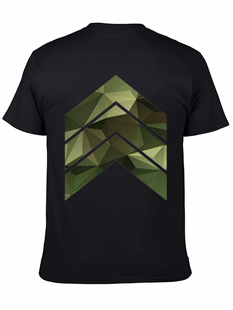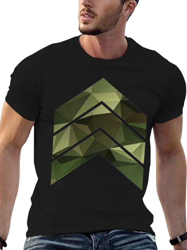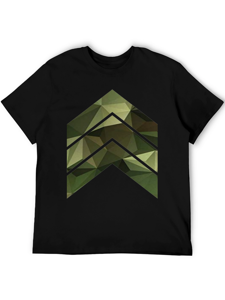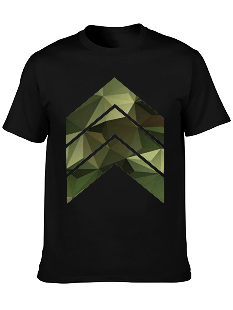 This striking black t-shirt features a unique camo arrow design, perfect for adding a touch of modern style to your casual wardrobe. The geometric camo pattern, rendered in shades of green and brown, creates a visually appealing focal point. The arrow design, framed by clean black lines, adds a bold, contemporary edge. Made from a soft and comfortable fabric, this tee is ideal for everyday wear. Dress it up with jeans and a jacket for a night out, or keep it casual with shorts for a weekend adventure. This eye-catching t-shirt is a must-have for those who appreciate modern design and effortless style.