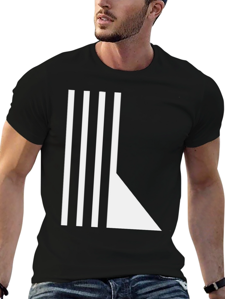 Elevate your everyday style with this striking black t-shirt. The shirt features a unique geometric design consisting of three vertical white bars complemented by a white angled shape, creating a modern, minimalist aesthetic. Made from a comfortable-looking fabric, this tee offers both style and ease. The classic crew neck and short sleeves make it a versatile piece for various casual occasions. Ideal for expressing your individuality, this eye-catching t-shirt pairs effortlessly with jeans, chinos, or shorts. Dress it up with a blazer for a night out or keep it casual for weekend wear. Make a statement with this stylish addition to your wardrobe.