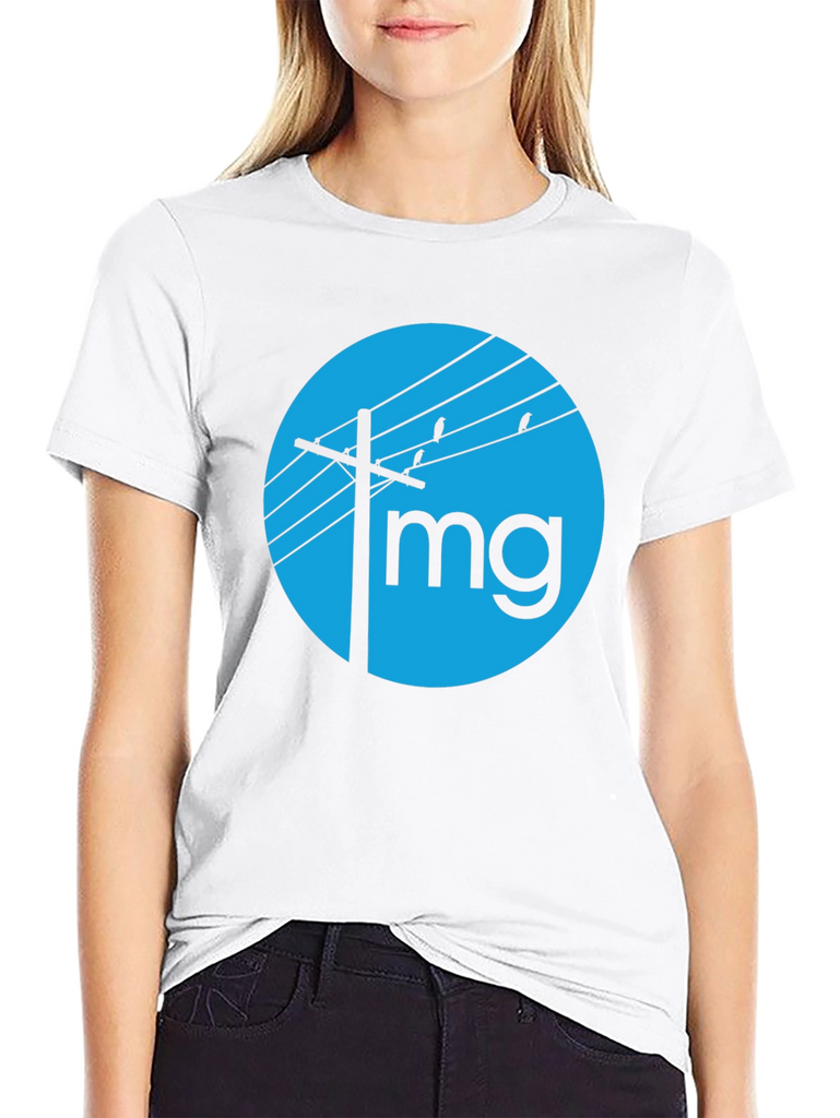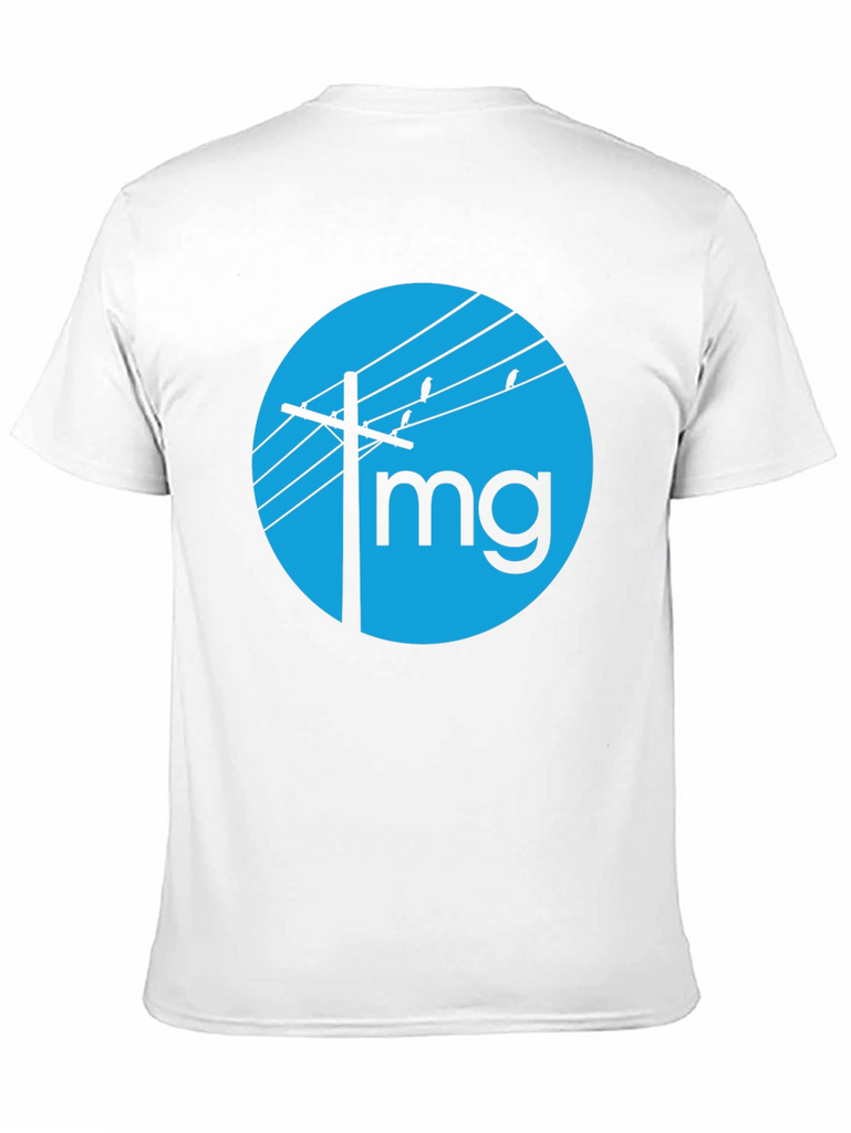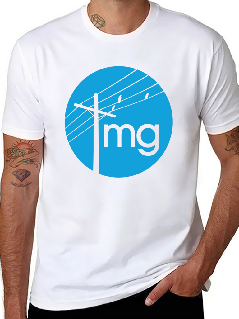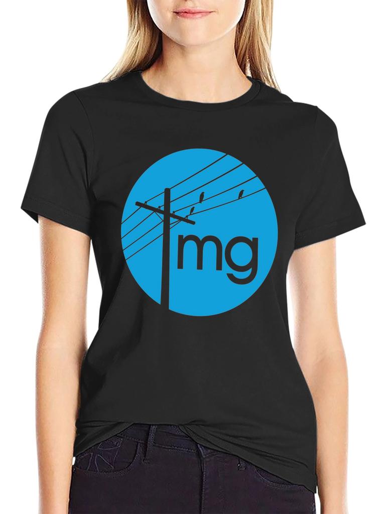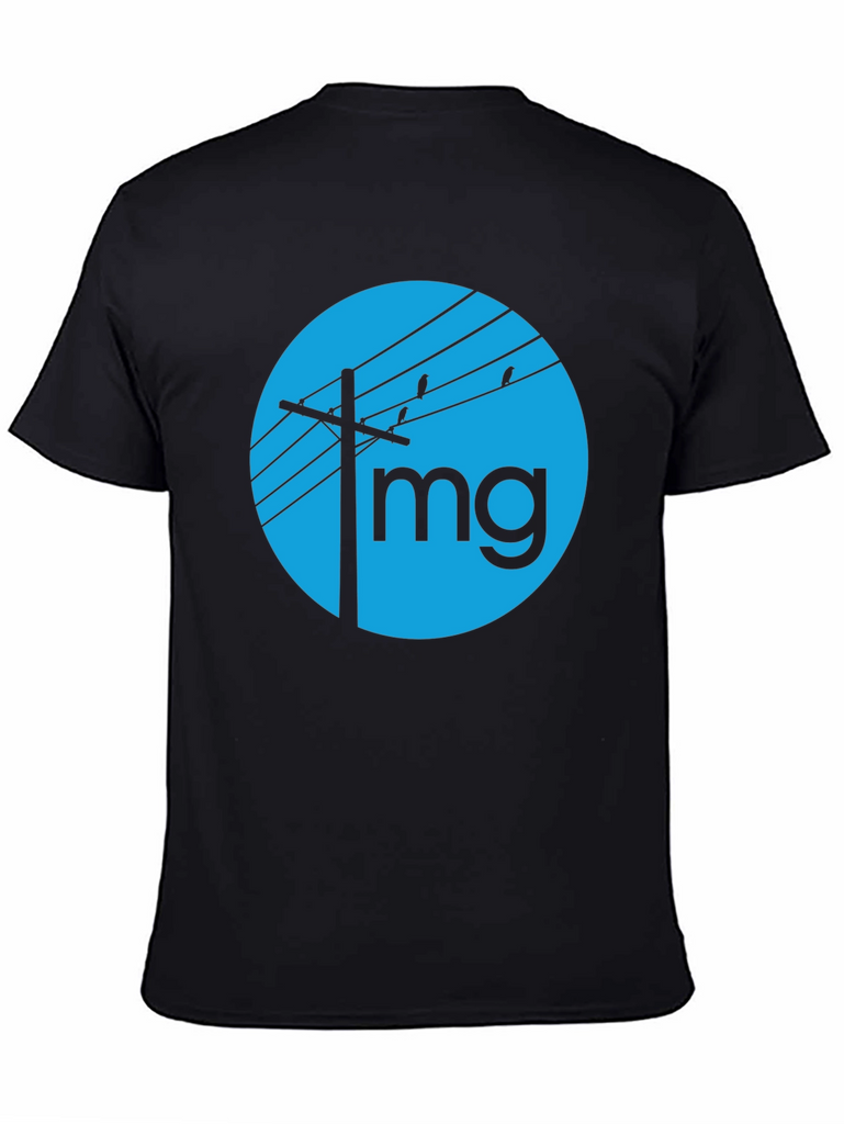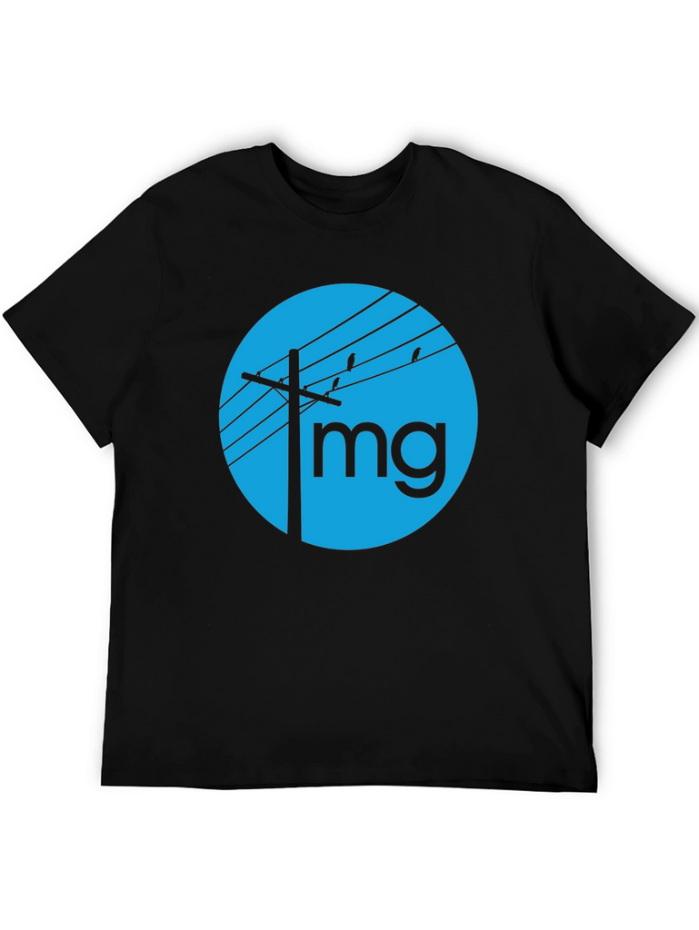This stylish black t-shirt features a unique, eye-catching design. A vibrant blue circle showcases a black electric pole silhouette with power lines and the letters 'mg'. The design offers a modern and somewhat abstract aesthetic. The shirt itself appears to be made from a comfortable, breathable fabric, suitable for everyday wear. It's a perfect casual wear option. This t-shirt will easily pair with jeans, shorts, or joggers. This shirt is perfect for showcasing your unique sense of style, and sparking conversations. Get yours today!