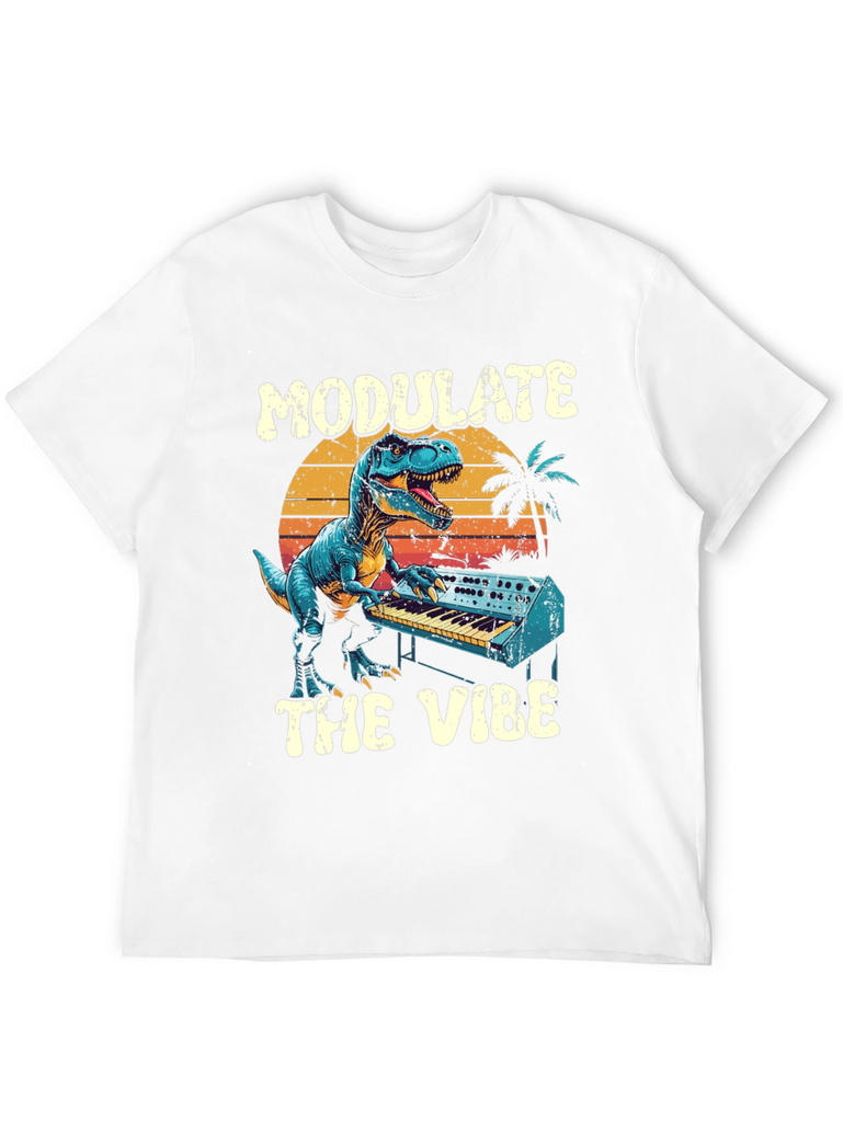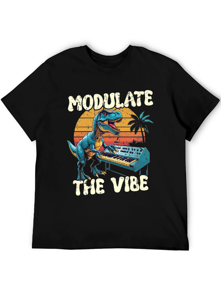 Show off your love for music and dinosaurs with this unique t-shirt! This black tee features a vibrant design of a dinosaur playing a keyboard in front of a sunset and palm tree. The text "Modulate The Vibe" is displayed above and below the graphic. This comfortable and stylish shirt is perfect for casual wear, music festivals, or anyone who loves quirky and fun designs. Grab yours today and let your personality shine!