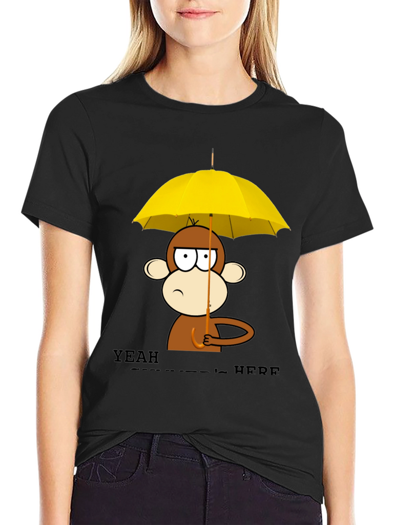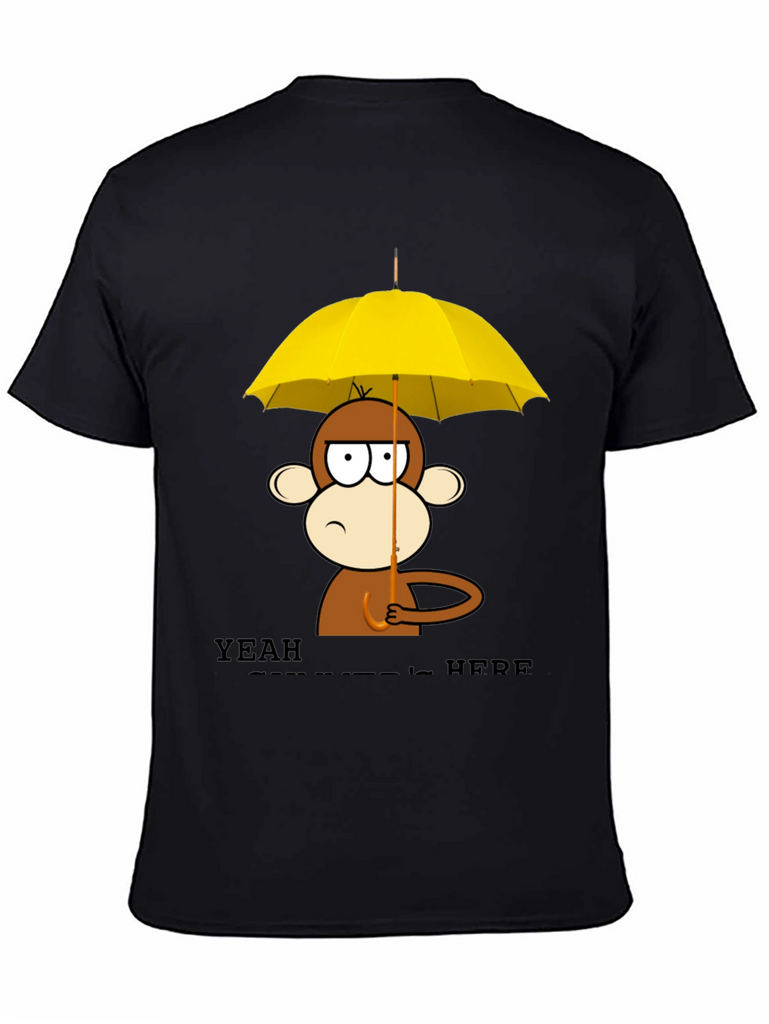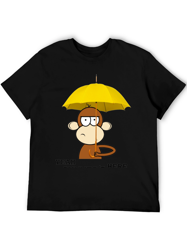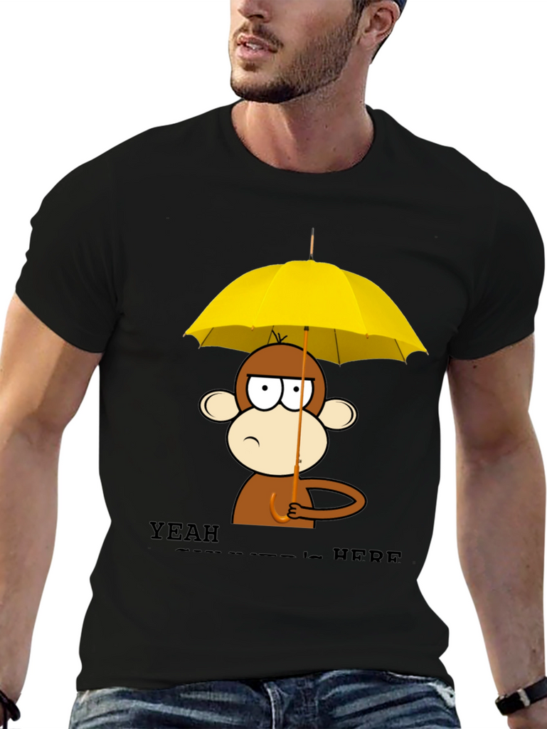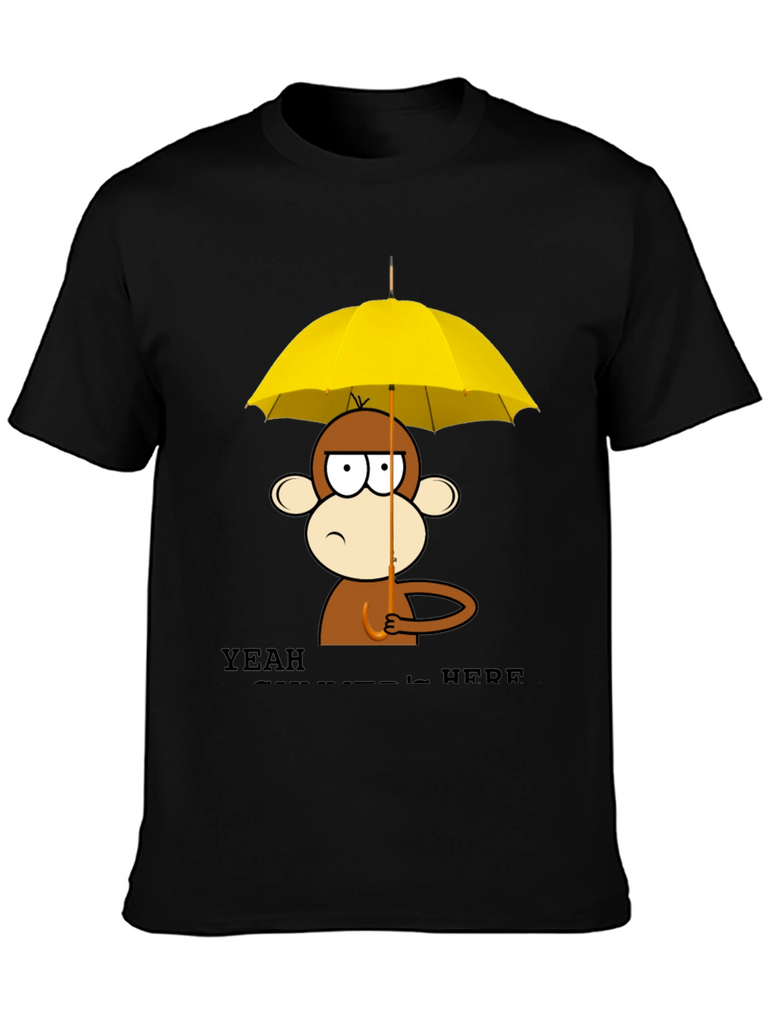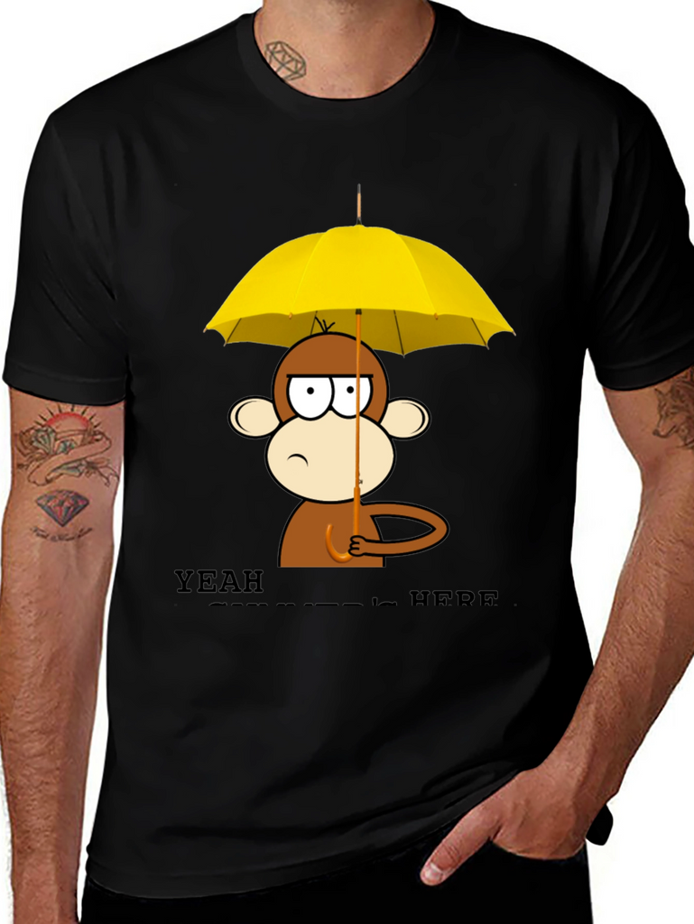 Stay dry and stylish with this unique black t-shirt! Featuring a whimsical design of a cartoon monkey sheltered under a bright yellow umbrella, this tee is sure to turn heads. The bold graphic is eye-catching, while the classic black backdrop makes it versatile for everyday wear. Made from a comfortable-looking fabric, this t-shirt is perfect for casual outings, lounging at home, or adding a touch of fun to any outfit. Show off your playful side and grab this conversation-starting tee today!