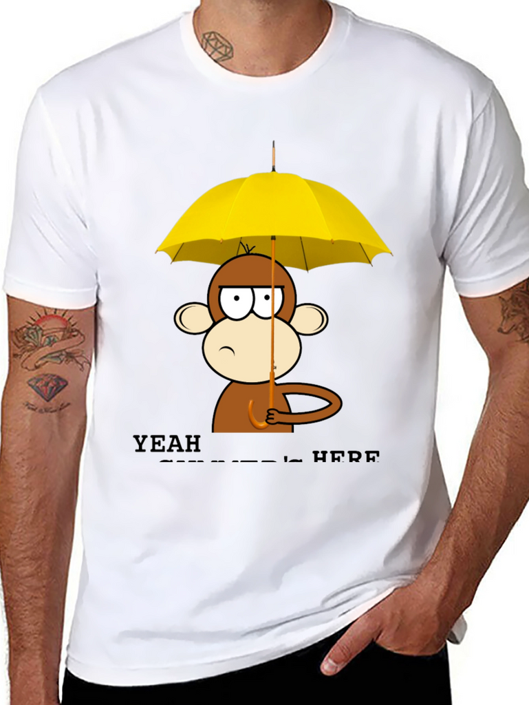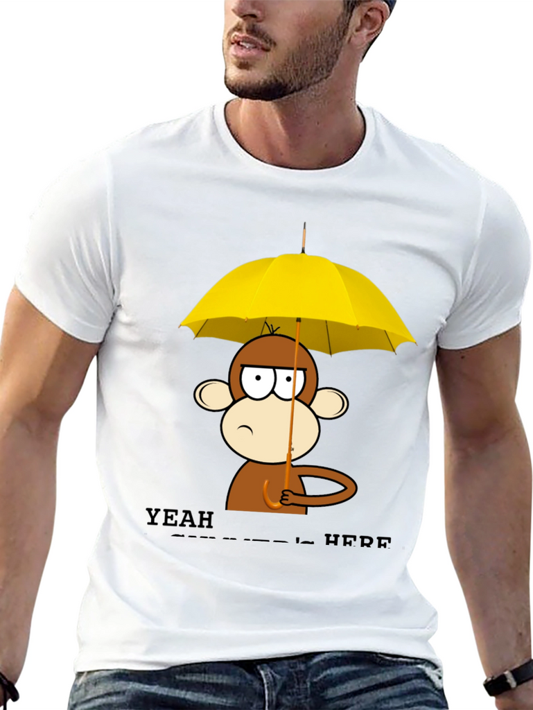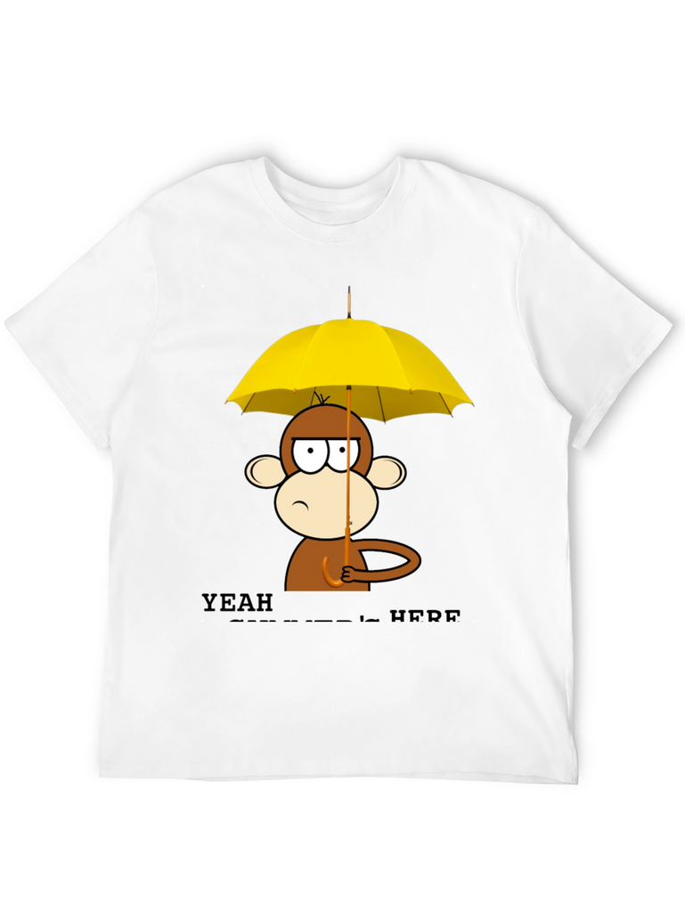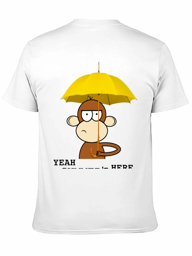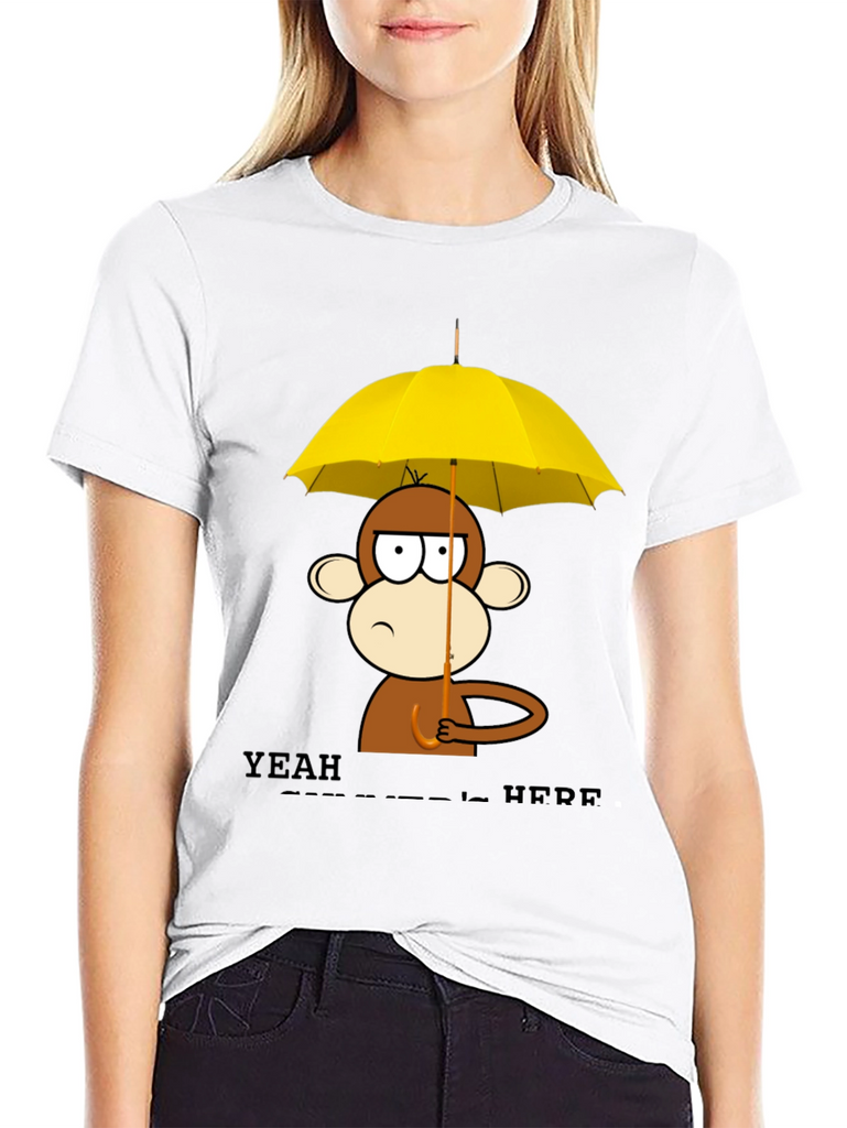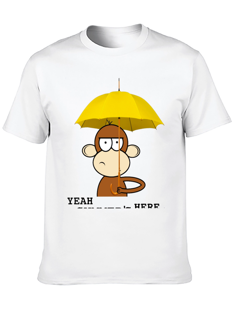 Stay dry and stylish with this unique black t-shirt! Featuring a whimsical design of a cartoon monkey sheltered under a bright yellow umbrella, this tee is sure to turn heads. The bold graphic is eye-catching, while the classic black backdrop makes it versatile for everyday wear. Made from a comfortable-looking fabric, this t-shirt is perfect for casual outings, lounging at home, or adding a touch of fun to any outfit. Show off your playful side and grab this conversation-starting tee today!