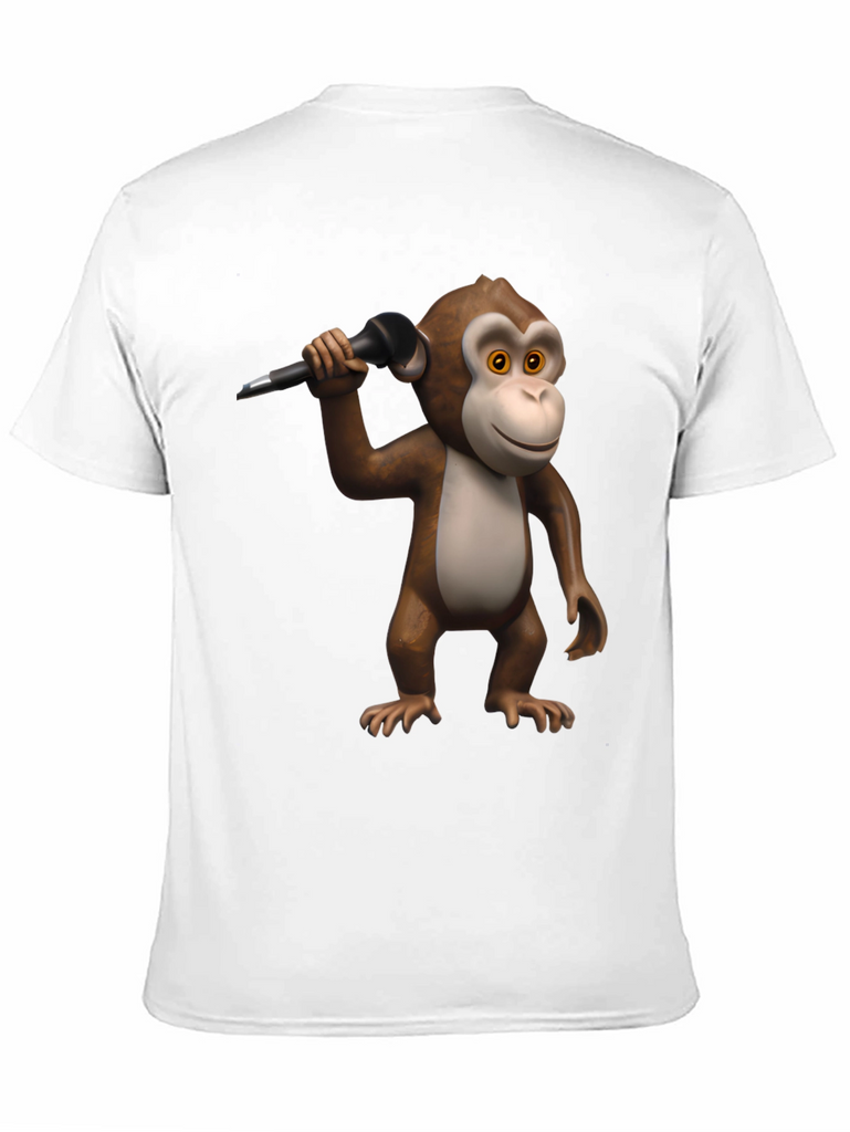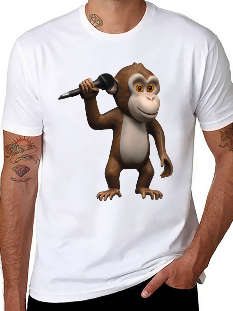 Add some playful charm to your wardrobe with this eye-catching black graphic t-shirt! This tee features a light brown monkey cartoon character holding a microphone up to its ear. The bold graphic pops against the classic black background, creating a fun and unique look. Crafted from a comfortable-looking fabric, this t-shirt is perfect for everyday wear, casual outings, or adding a touch of personality to any outfit. Show off your fun side with this whimsical tee. It's a conversation starter!