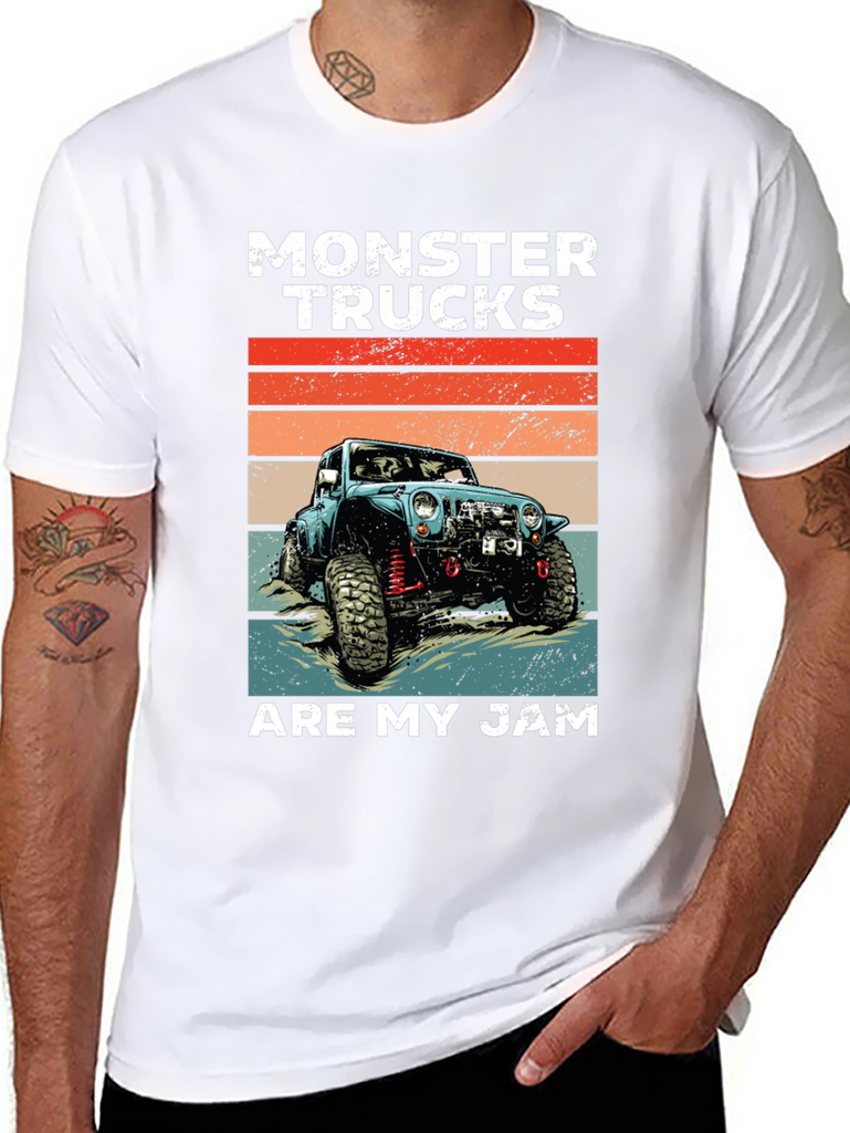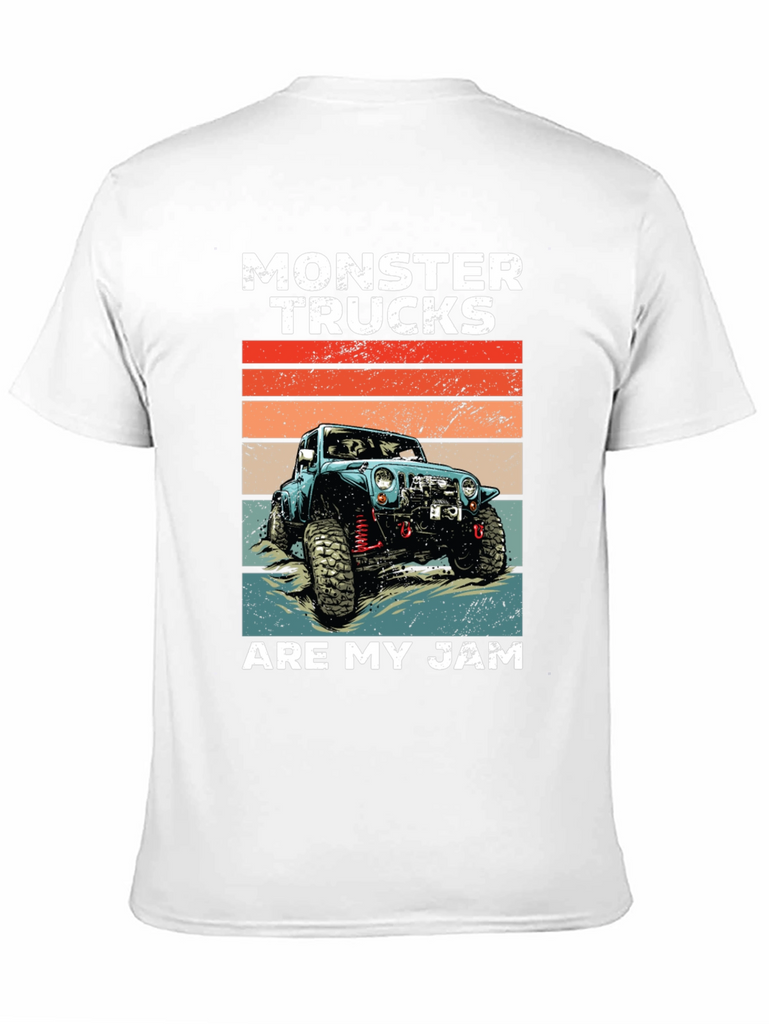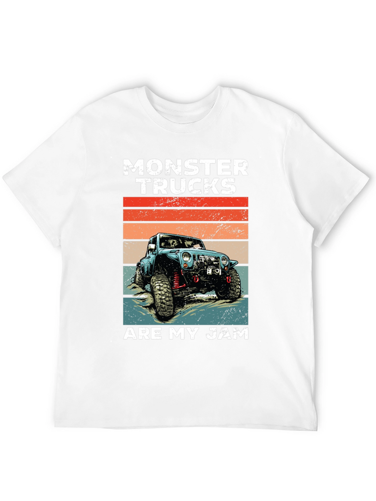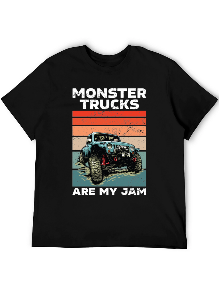Show off your love for monster trucks with this cool graphic tee! Featuring a vintage-style illustration of a blue monster truck against a retro sunset backdrop, this shirt is perfect for any off-road enthusiast. The bold "MONSTER TRUCKS" text and "ARE MY JAM" slogan make a statement. Made from a soft, breathable fabric, this tee offers comfort and style. Ideal for casual wear, car shows, or a day out exploring the trails. Let everyone know what you're passionate about with this unique design!